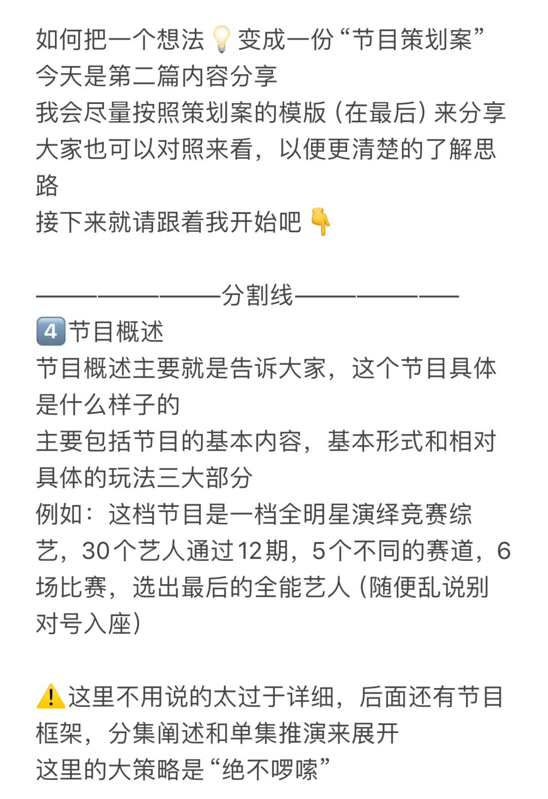 ⚠️这里不用说的太过于详细,后面还有节目框架,分集阐述和单集推演来展开,这里的大策略是“绝不啰嗦”