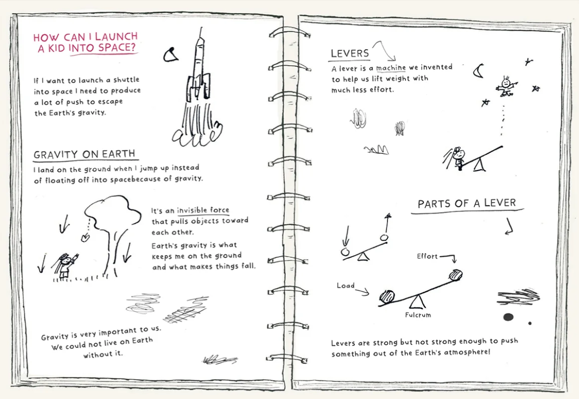 小男孩意识到自己有很多问题,他并没有忽视这些问题,并把它们好好地储存起来。于是,主角创建了“我的科学笔记本”,并将它记录下来。将每个问题写成标题,用图简洁地表达出来,以及通过学习发现的答案、定义、原理和扩展内容,并在重们要部分下划线。