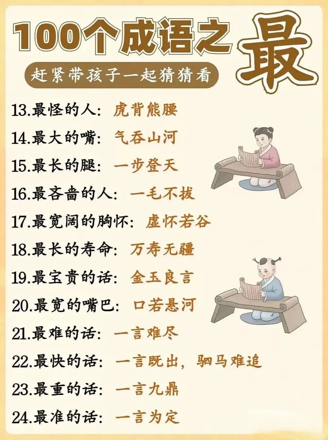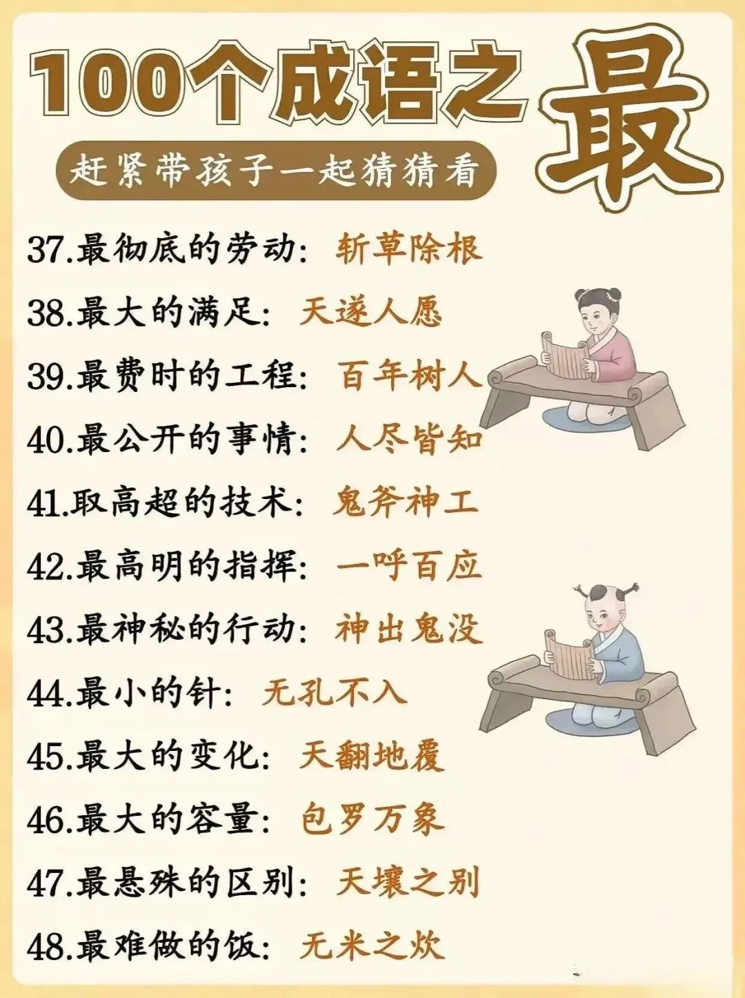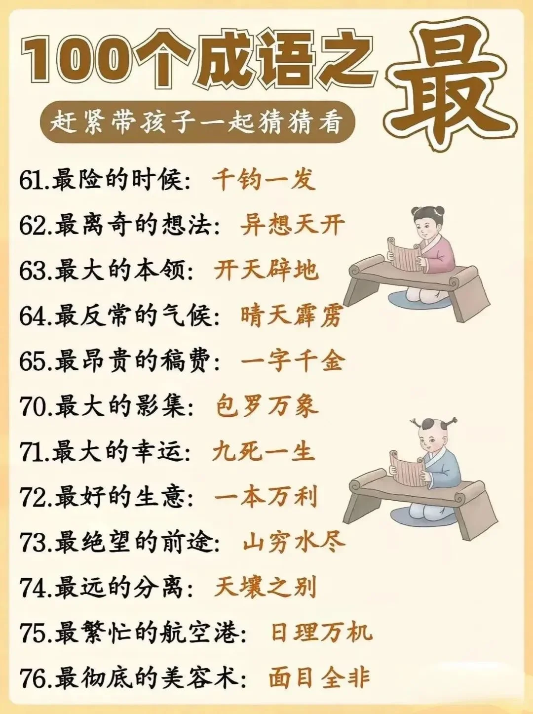 成语太多记不住,不如让孩子试试这种“一问一答”的方式,比如你问孩子:最长的一天,稍加引导孩子就能记住“度日如年”这个成语了,而且印象深刻,不易忘记。 这个记成语的方法太实用了,快收藏起来帮助孩子积累吧!