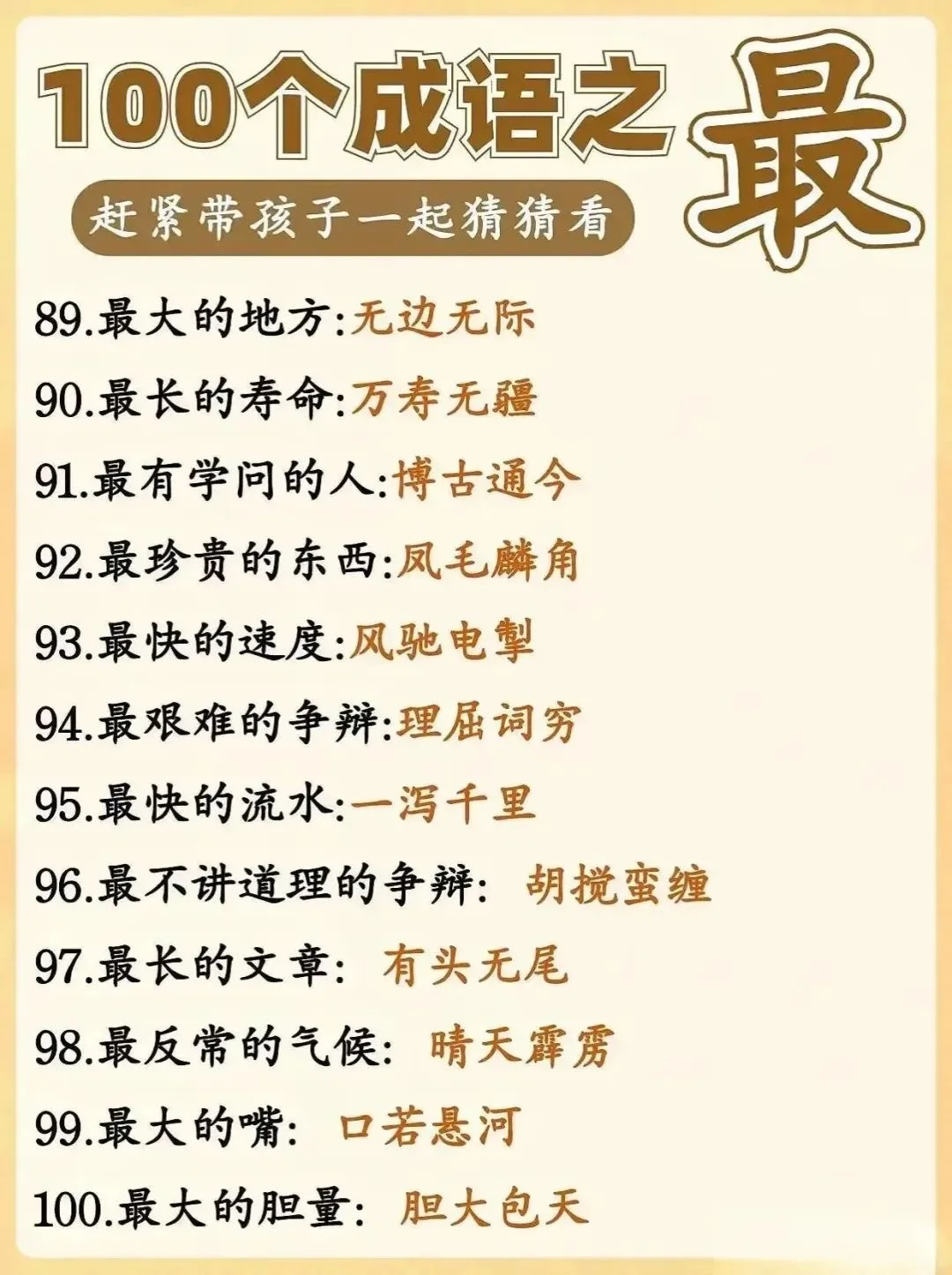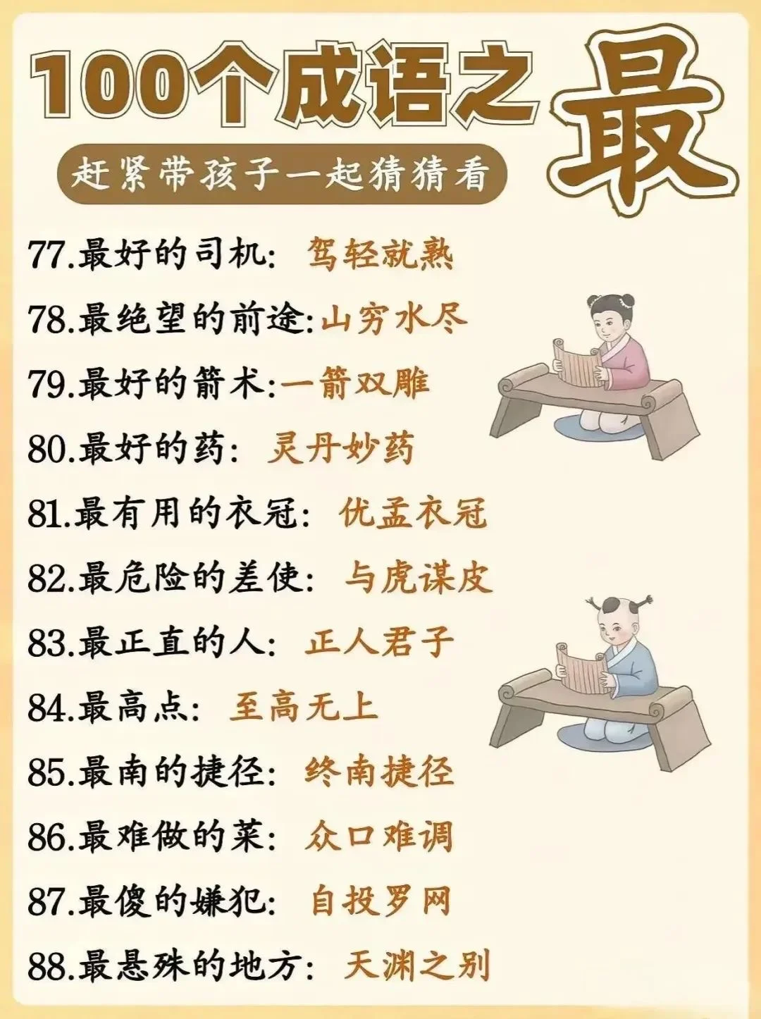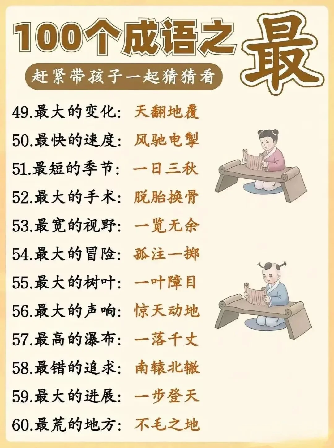 成语太多记不住,不如让孩子试试这种“一问一答”的方式,比如你问孩子:最长的一天,稍加引导孩子就能记住“度日如年”这个成语了,而且印象深刻,不易忘记。 这个记成语的方法太实用了,快收藏起来帮助孩子积累吧!
