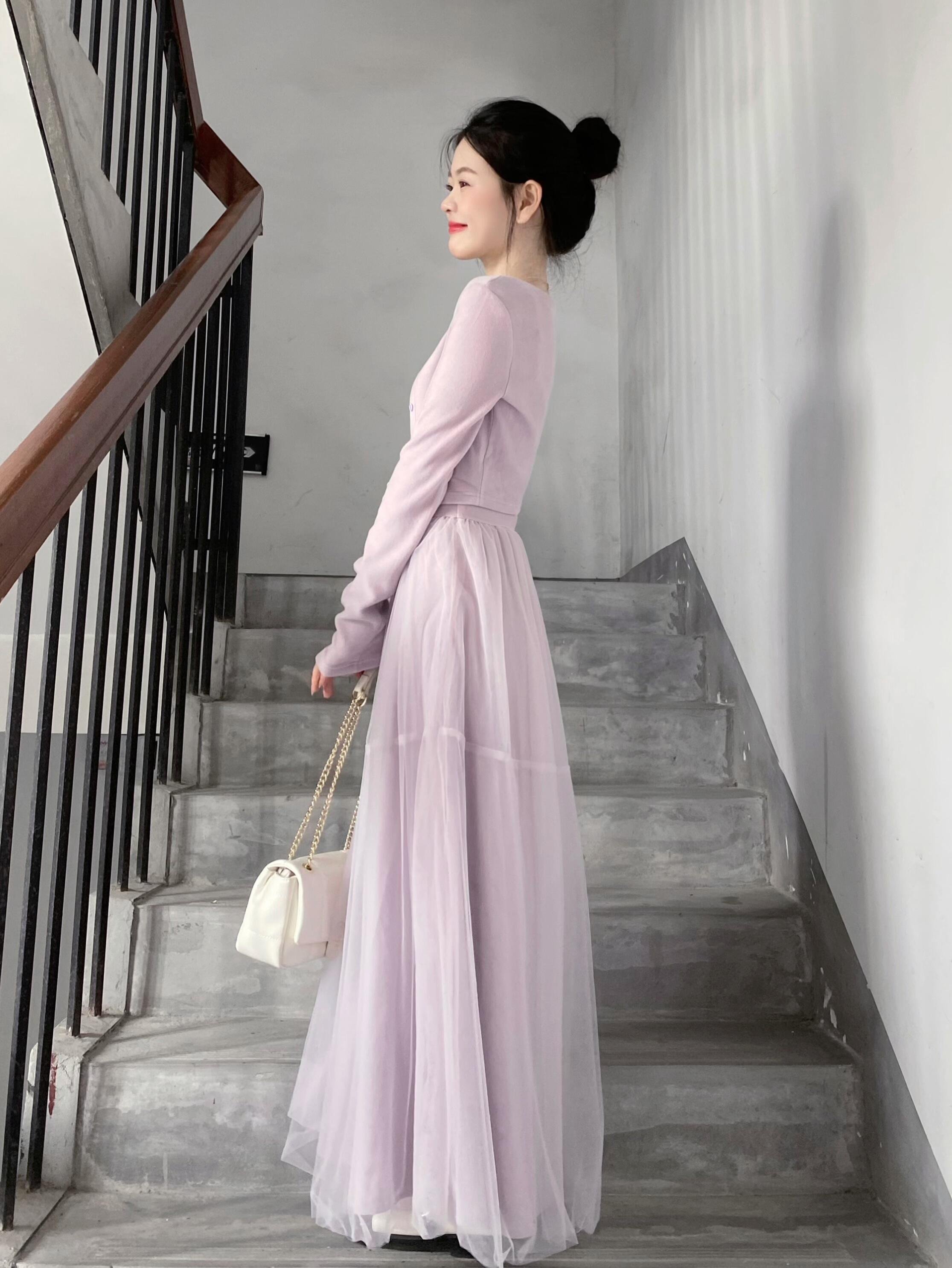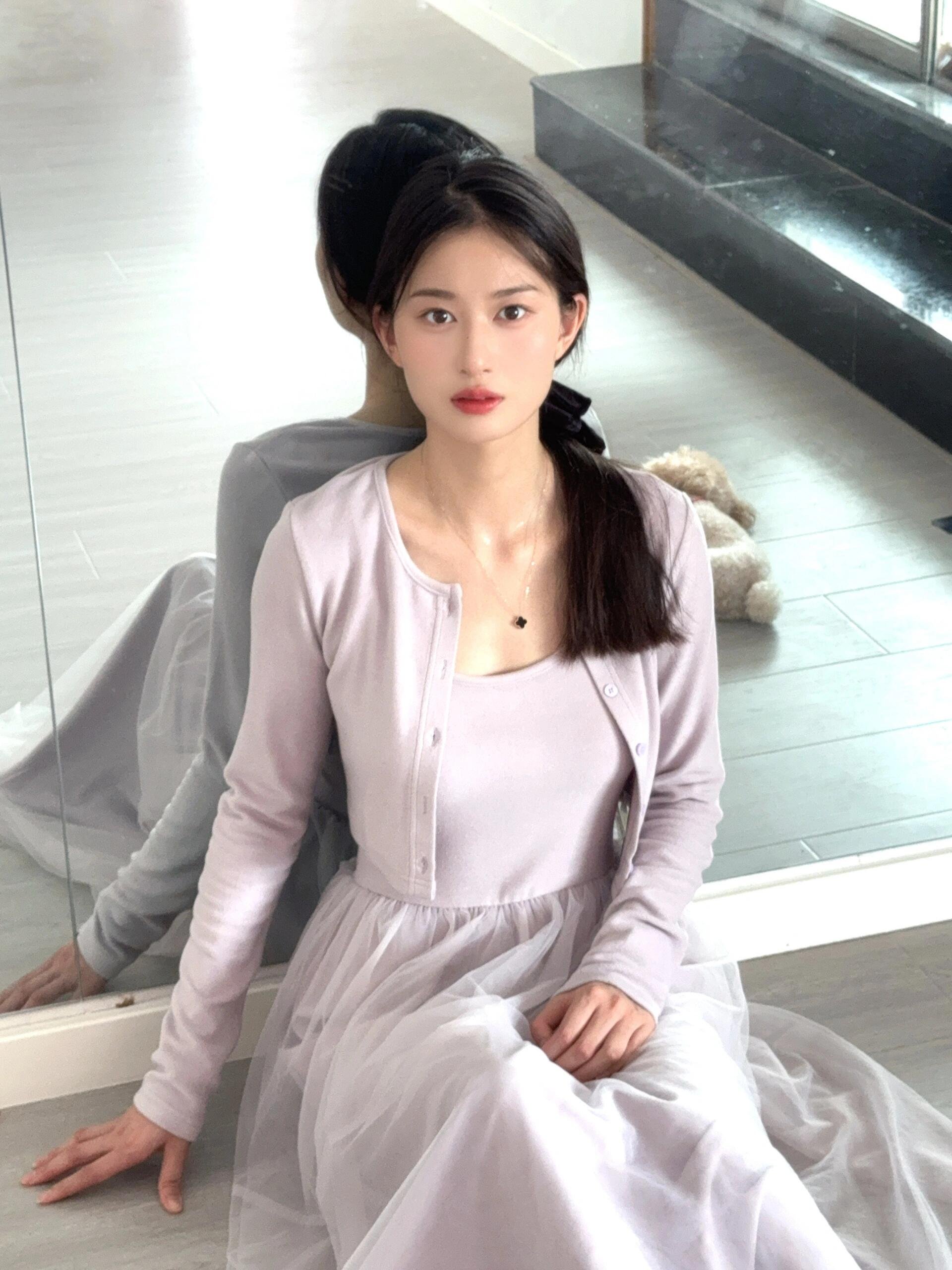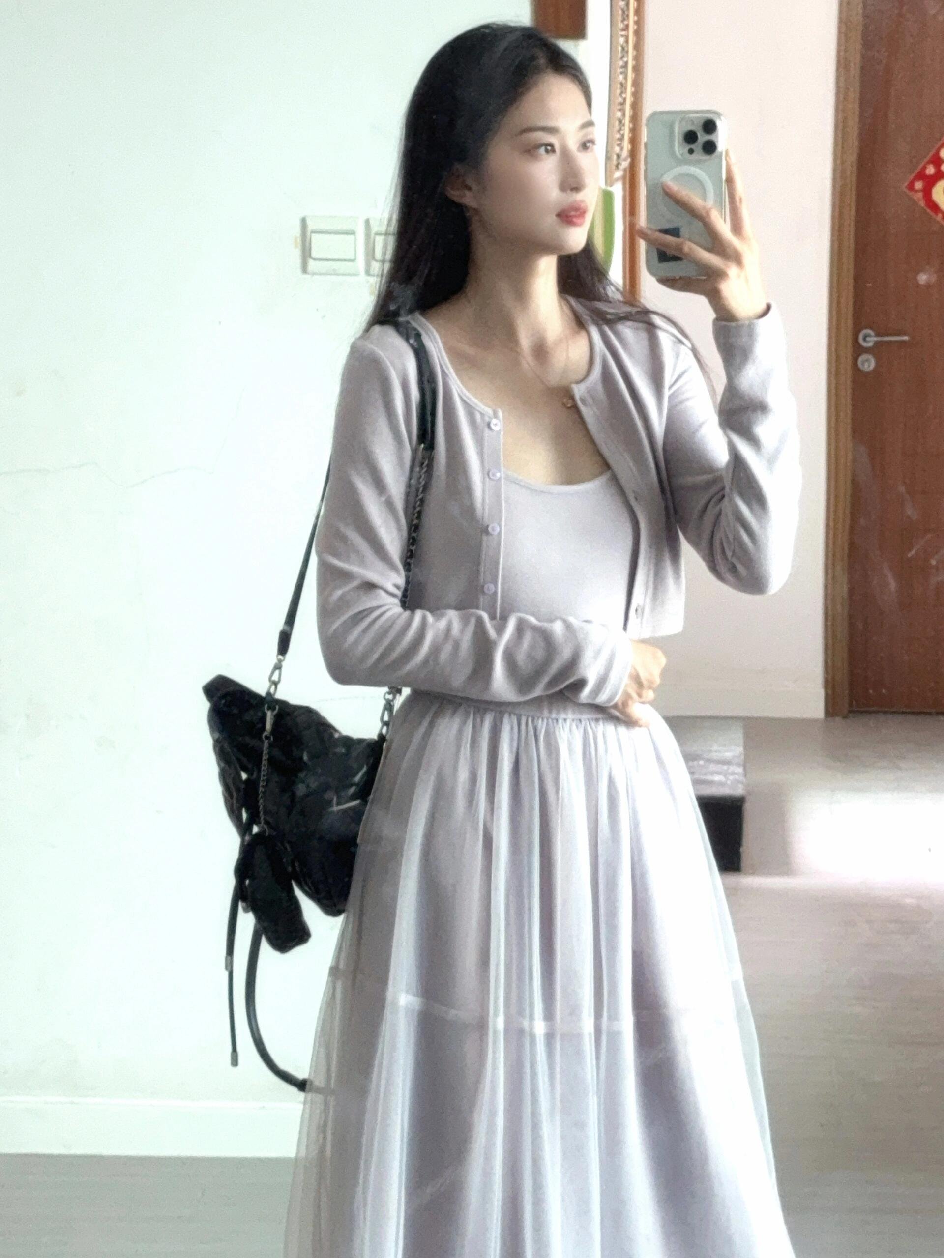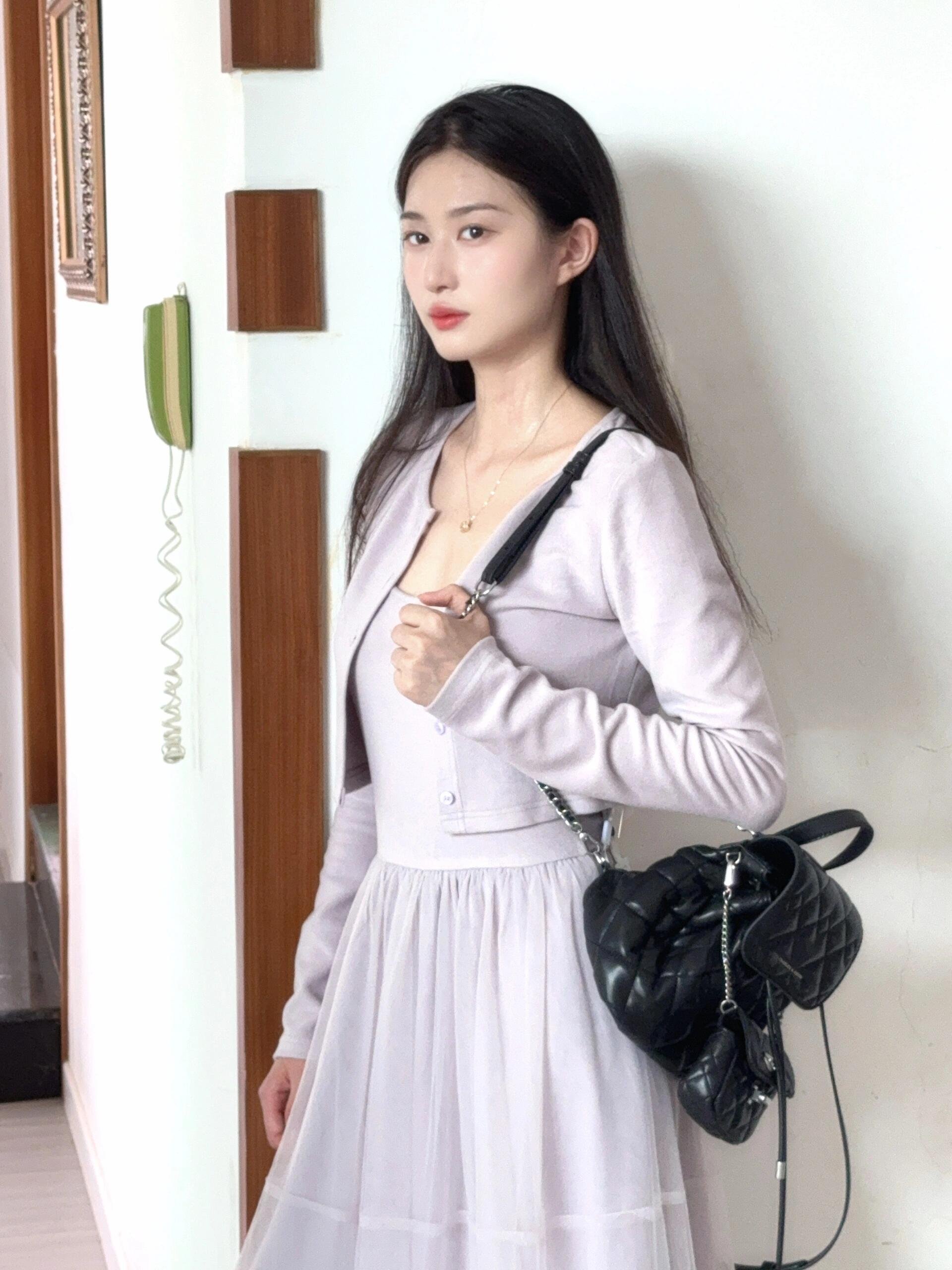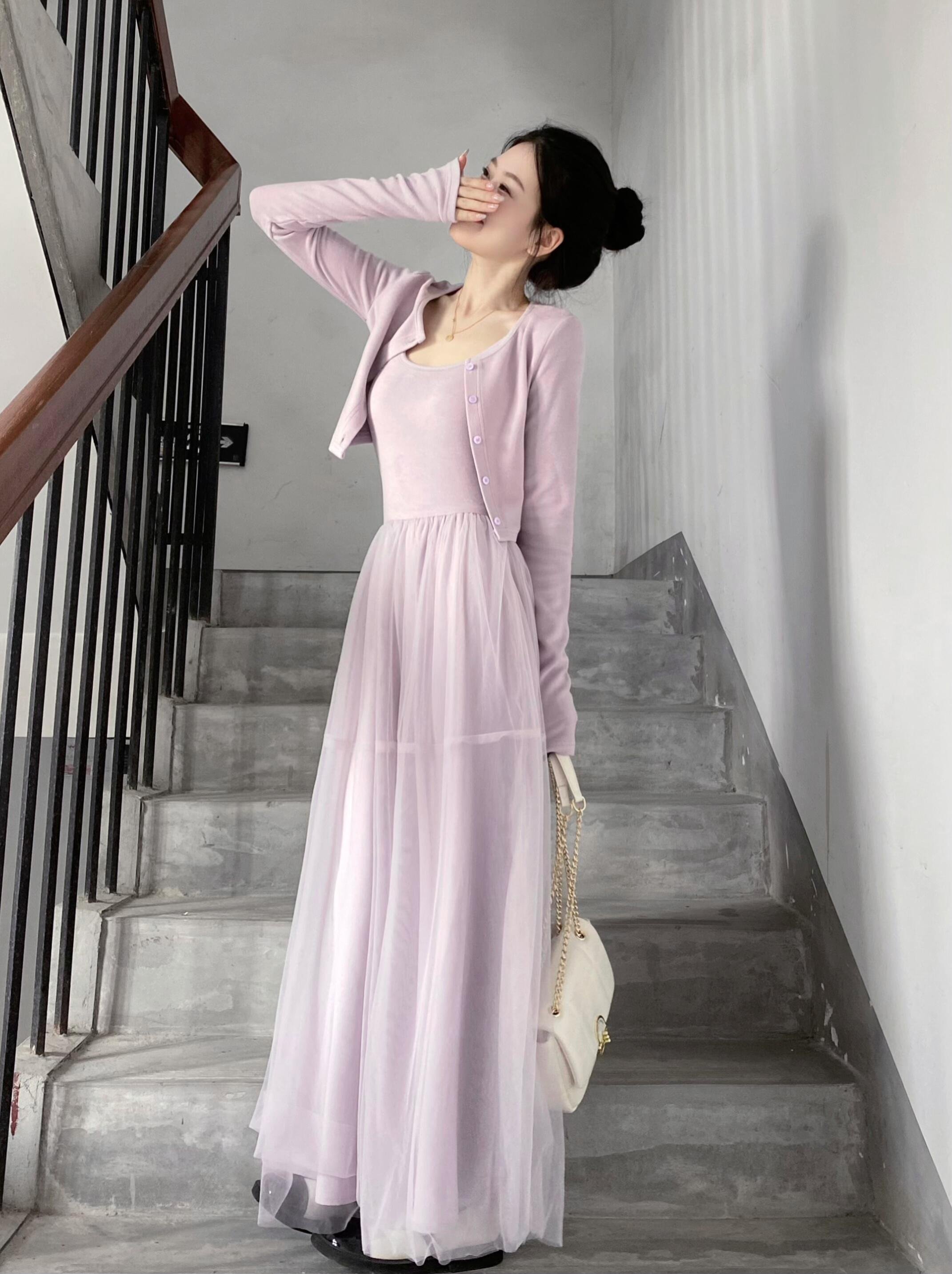 2024秋季新款紫色开衫吊带连衣裙子法式高级感长裙穿搭一整套装女