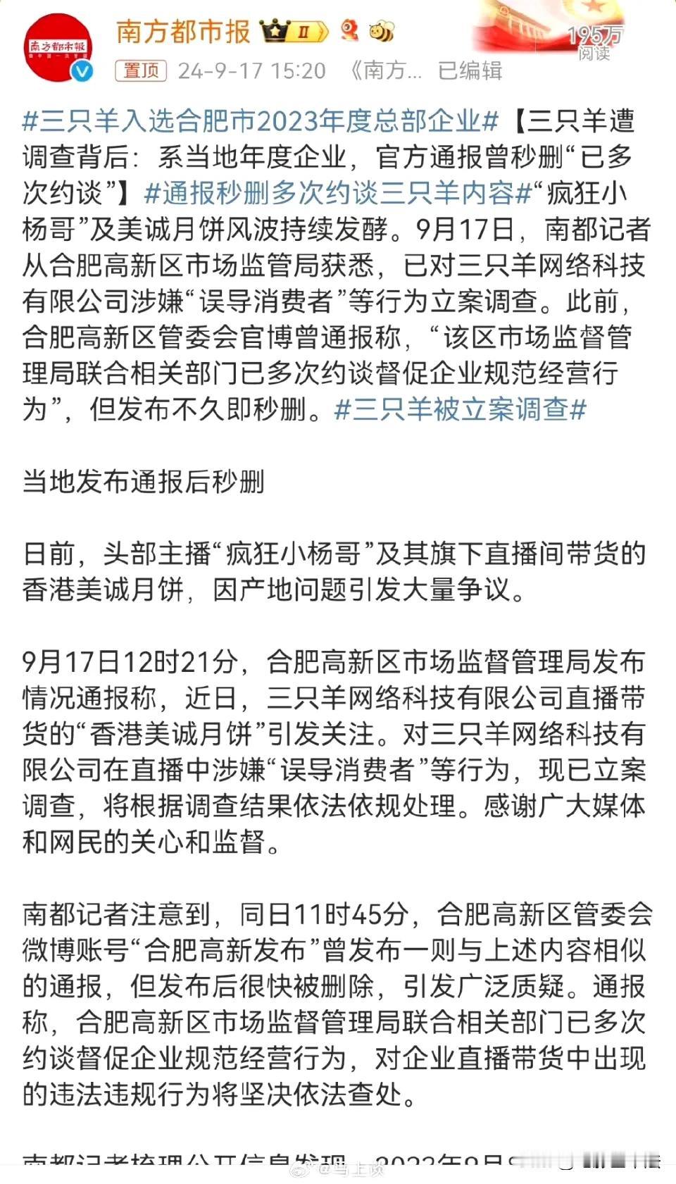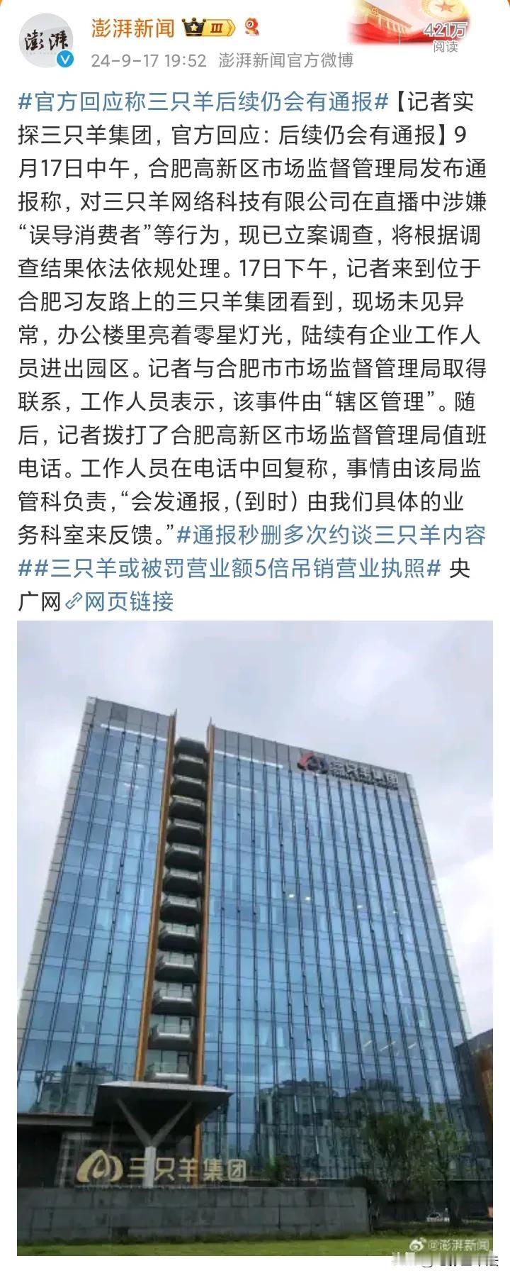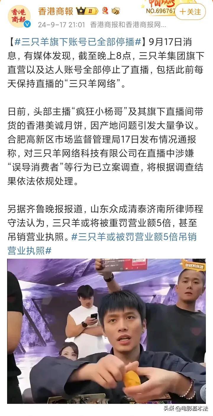 三只羊,或将被重罚营业额5倍,甚至吊销营业执照! 9月17日,官方通报将对三只羊“误导消费者”的行为立案调查,同时有律师认为,电商模式快速发展,快速意味着存在很多不规范的地方,三只羊的问题是“虚假宣传”和“不正当竞争”,最终处罚应该是营业额1-5倍的罚款,甚至吊销营业执照。 网友对此纷纷发表评论: 直播间乱象早该大力整治了。 都是自己作的,内外兼顾不良。 最好不要有直播带货了,全部下架,全部不允许。 网红更需要严格管控,同时查税。 这就要看“吸得肥”自己想不想好好查了。 我把话放这,所有主播一个德行。 吃梅菜扣肉,品茅台人生,羊羊得亿。 他们还是去拍搞笑视频吧。 这次真怕他们又撑过来了。 中间商做成了集团。 …… 9月17日晚,三只羊集团旗下所有直播账号全部停止直播,有网友认为这是因为被调查,也有网友认为这是三只羊中秋放假了。 即使是一年几个亿税收,把这种不规范的网红企业当纳税大户终究是靠不住的,这次对三只羊的调查对于净化网络直播行业是件好事,但是最终如何处罚还是要看后续报道,最终结果能否让消费者满意还是个未知数。#寻找热爱表达的你#
