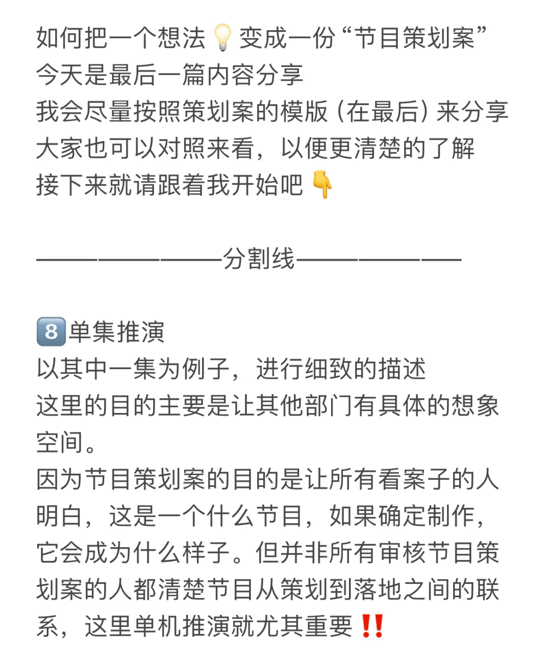 因为节目策划案的目的是让所有看案子的人明白,这是一个什么节目,如果确定制作,它会成为什么样子。但并非所有审核节目策划案的人都清楚节目从策划到落地之间的联系,这里单机推演就尤其重要‼️