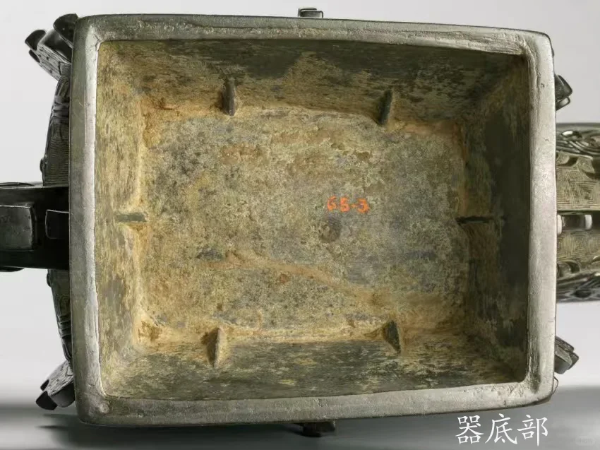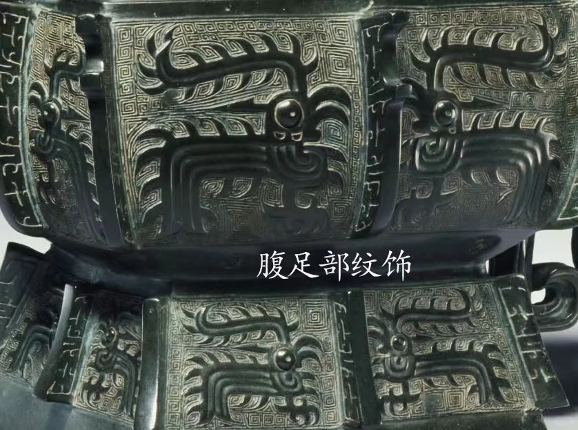 盖首端为一兽首面,圆雕兽角似蜗牛触角(菌状角),上饰阴线云纹与两周曲折纹,角顶部饰阴线四芒涡纹;首额部饰阴线长圭纹;圆雕兽耳,内饰阴线;眉、目、口为高浮雕,圆状下颚;直眉,眉面饰阳线竖条示毛眉,凸圆目中间一横向凹窝;鼻、须等以阴线饰。盖颈饰二组羽冠鸟纹, 大鸟身后部上饰一幼鸟纹,其后饰一羽冠鸟纹。 其后置半环鋬,鋬首饰圆雕鸟首,勾爪形垂珥,鋬面饰四组阴线卷云纹,以兽首扉脊为界。盖尾部亦饰一饕餮纹雕饰,圆雕兽角外扬,角面饰阴线卷云纹,饕餮圆面,叶形横耳,粗眉圆目,嘴角内卷,鼻前端向前凸起;盖尾部出圆雕兽尾示器盖部兽尾。腹部前后两面各饰一组两两相对的大羽冠鸟纹,方圈足四面各饰一组两两相对的羽冠鸟纹。整器以云雷纹衬地。