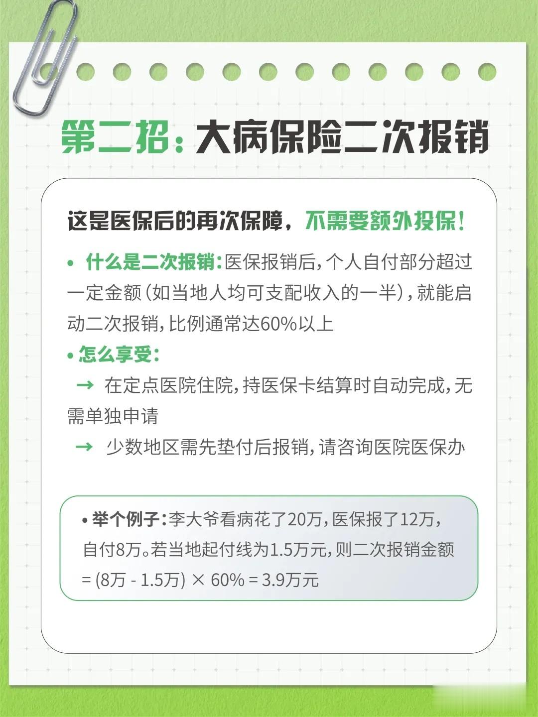 什么是二次报销:医保报销后,个人自付部分超过一定金额(如当地人均可支配收入的一半),就能启动二次报销,比例通常达60%以上