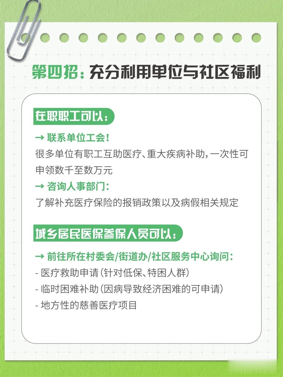 → 联系单位工会!很多单位有职工互助医疗、重大疾病补助,一次性可申领数千至数万
