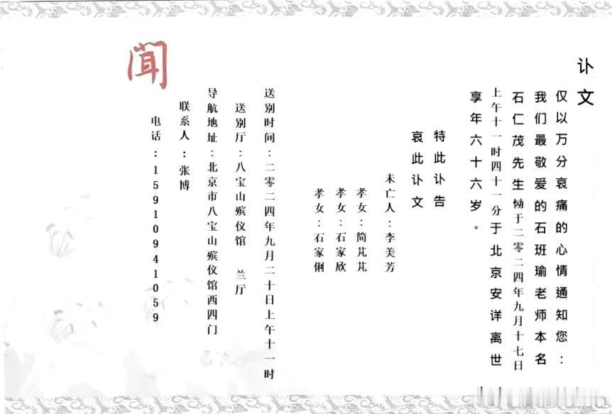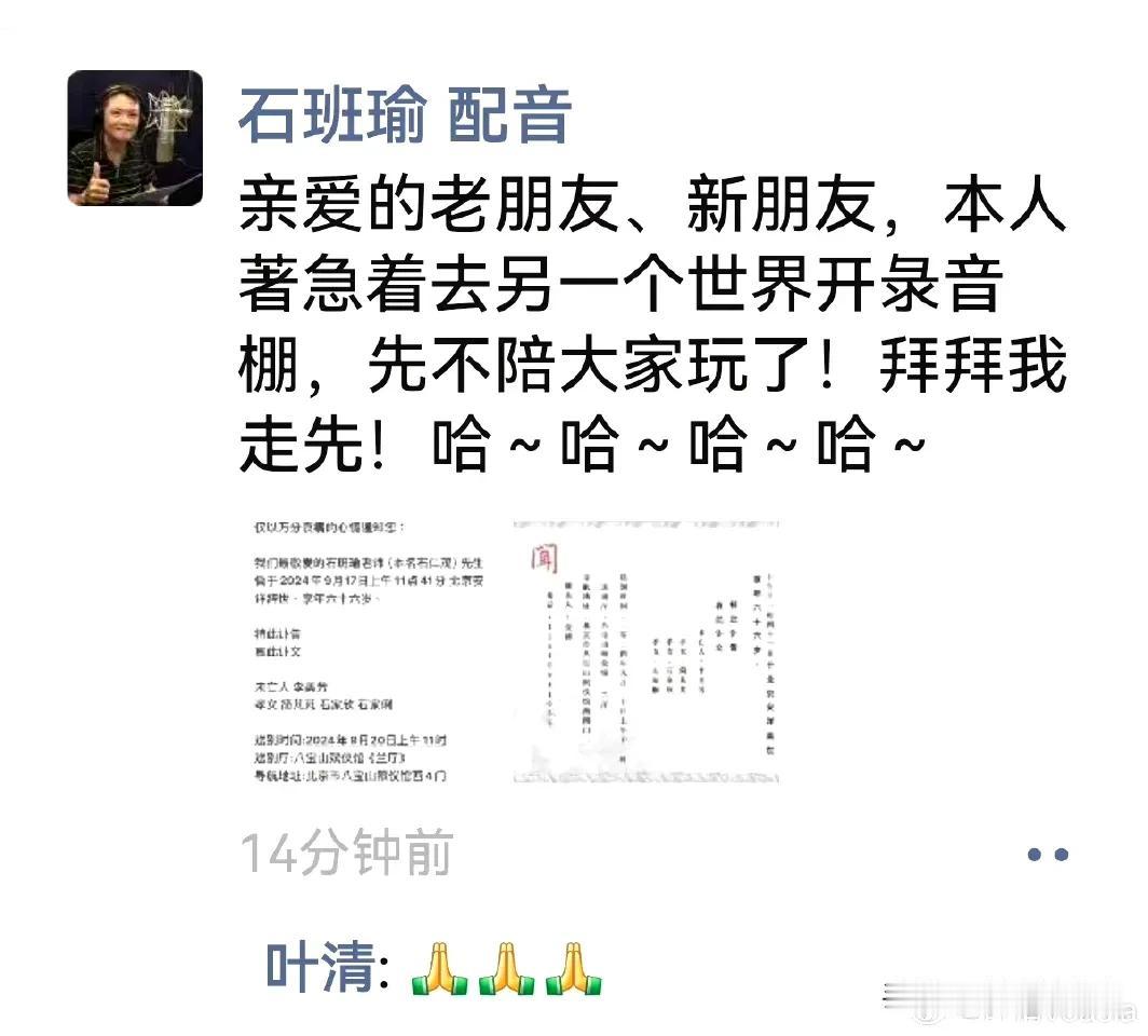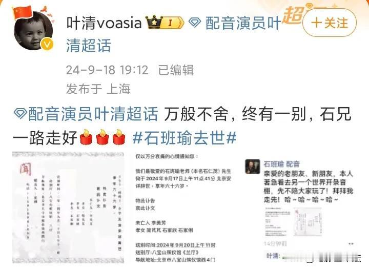 石班瑜,去世了! 9月18日,娱乐圈又一位老前辈去世,他就是周星驰的御用国语配音,石班瑜先生。根据配音演员叶清消息,石先生已经于2024年9月17日上午去世,享年66岁。 网友纷纷留言怀念: 内地观众对周星驰的认知,一半来自于他的声音。 一半都保守了。 啊!小时候看周星驰电影基本都是配音版,一度以为星爷就是这个声音,一路走好~[蜡烛] 啊?啊?啊?啊?不是吧……,太突然啊,一路走好[蜡烛] 这么突然。 看见他发的四个哈字,马上脑子里就出现了星爷电影的声音,走好[蜡烛][蜡烛][蜡烛] 一路走好,感谢石先生陪我度过快乐的童年! …… 叶清先生发文:万般不舍,终有一别,石兄一路走好[蜡烛][蜡烛][蜡烛] 周星驰发文:永远怀念石班瑜先生! 一位又一位老戏骨、老前辈去世,有一位网友这样形容: 年少时仰头望见的一颗又一颗璀璨明星,渐渐都回到属于他们的天空中去了! #寻找热爱表达的你#