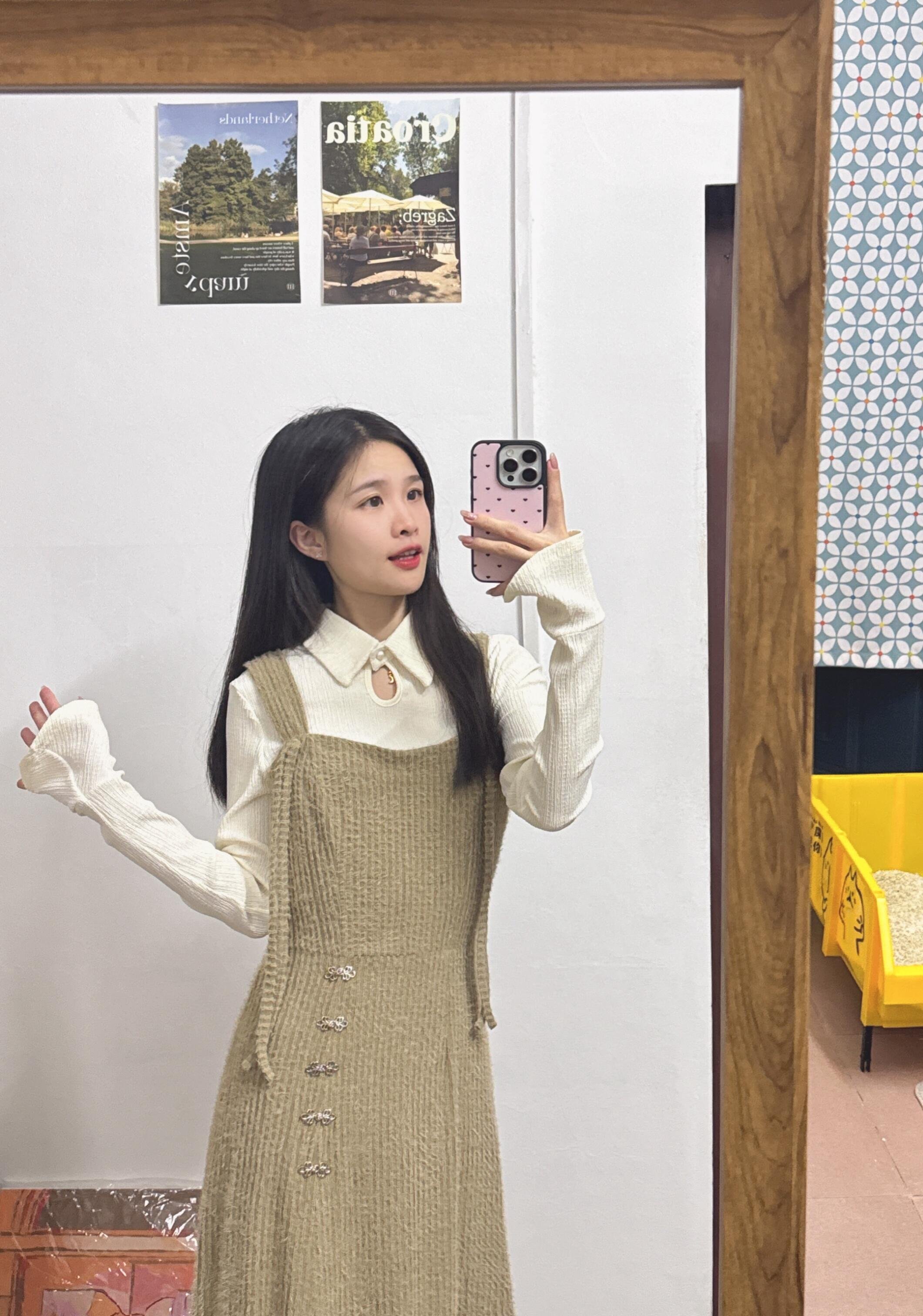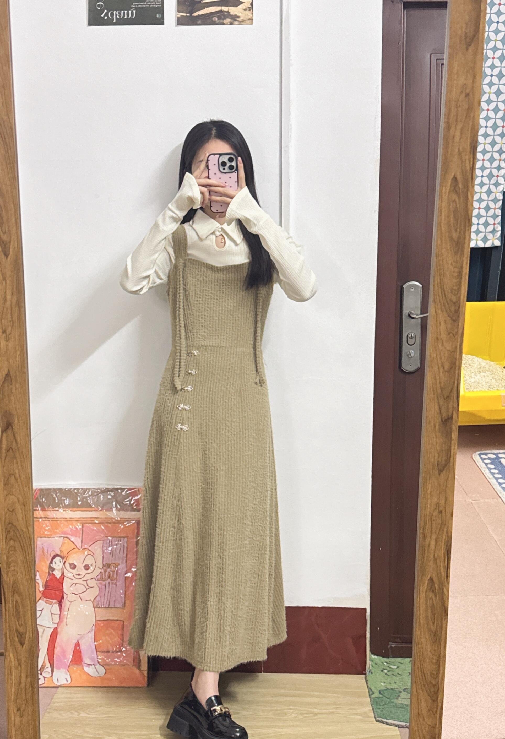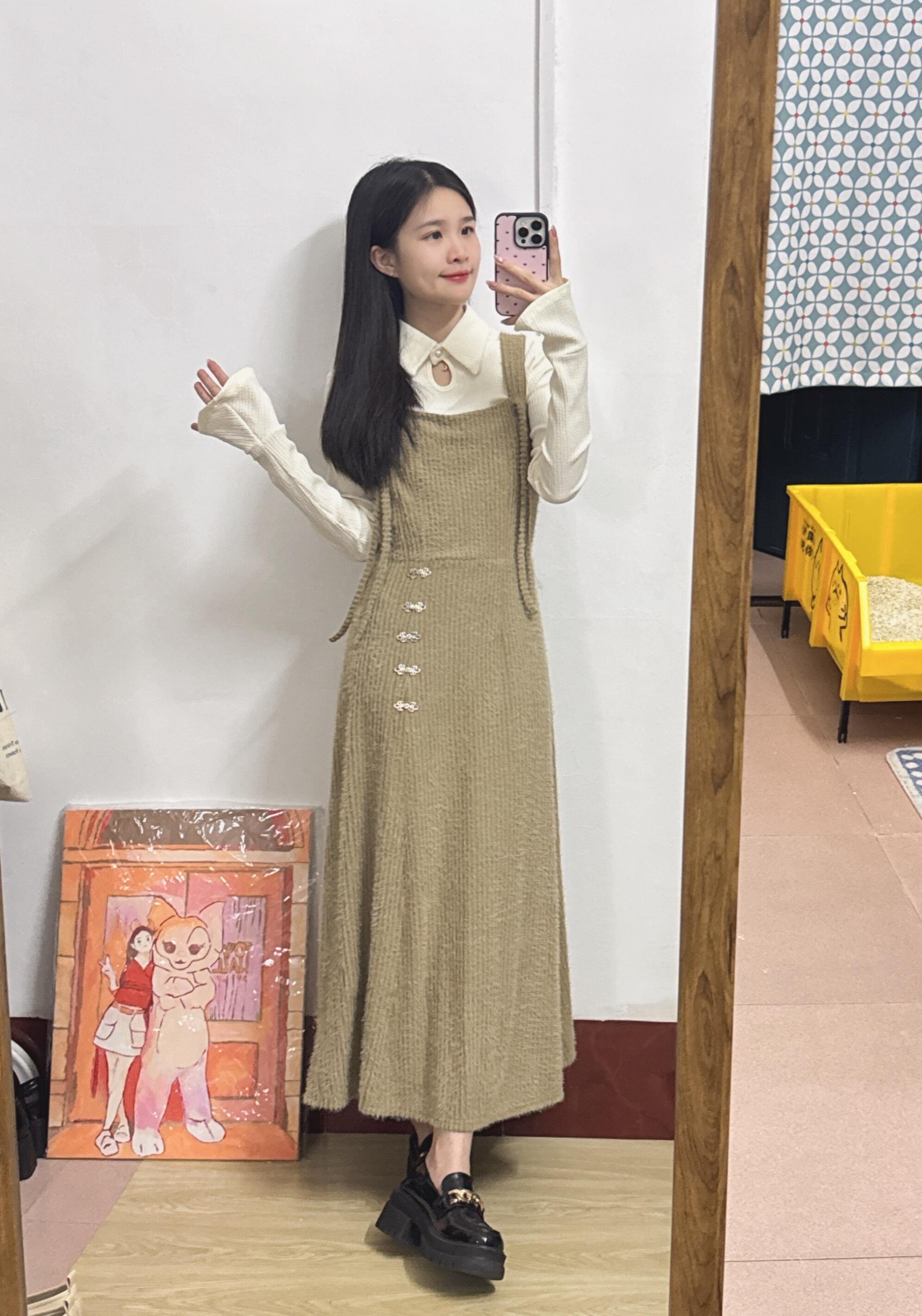 卡其色吊带连衣裙套装真的好温柔气质啊!