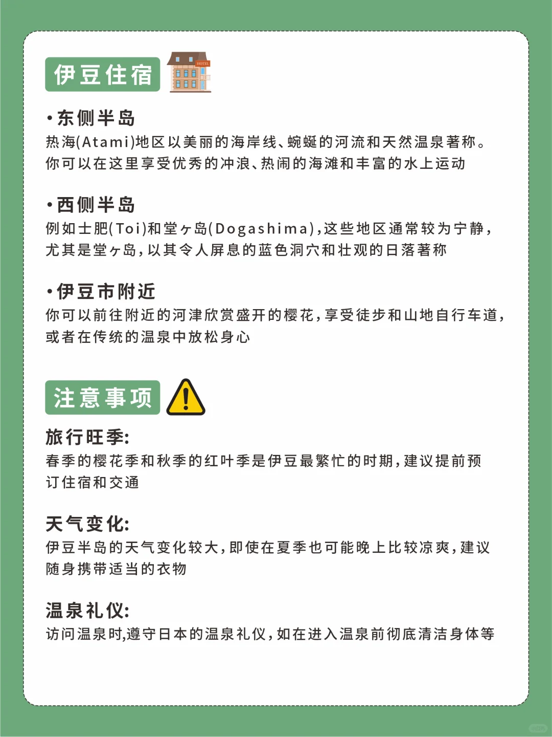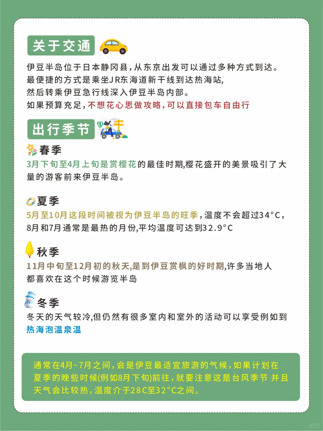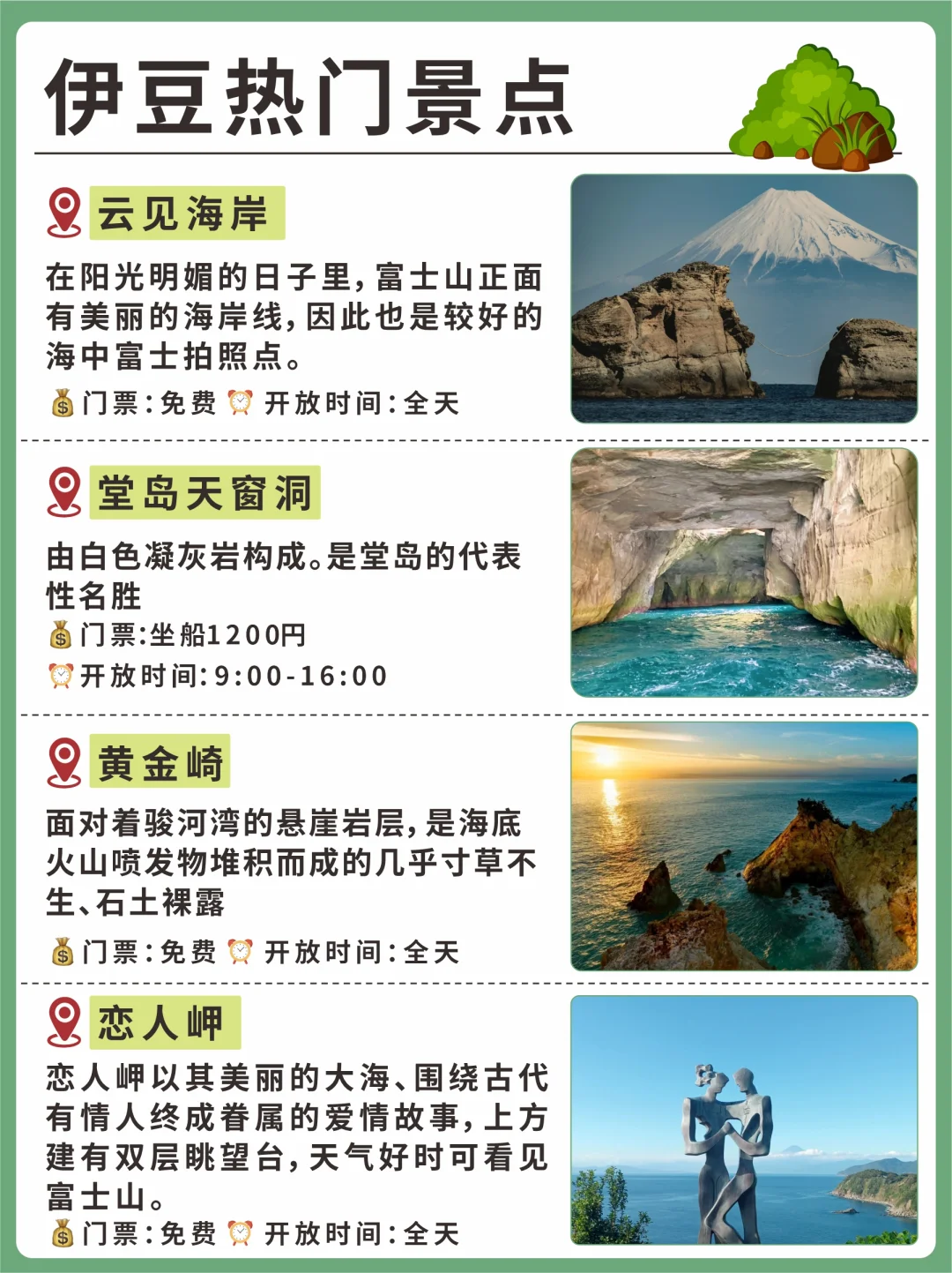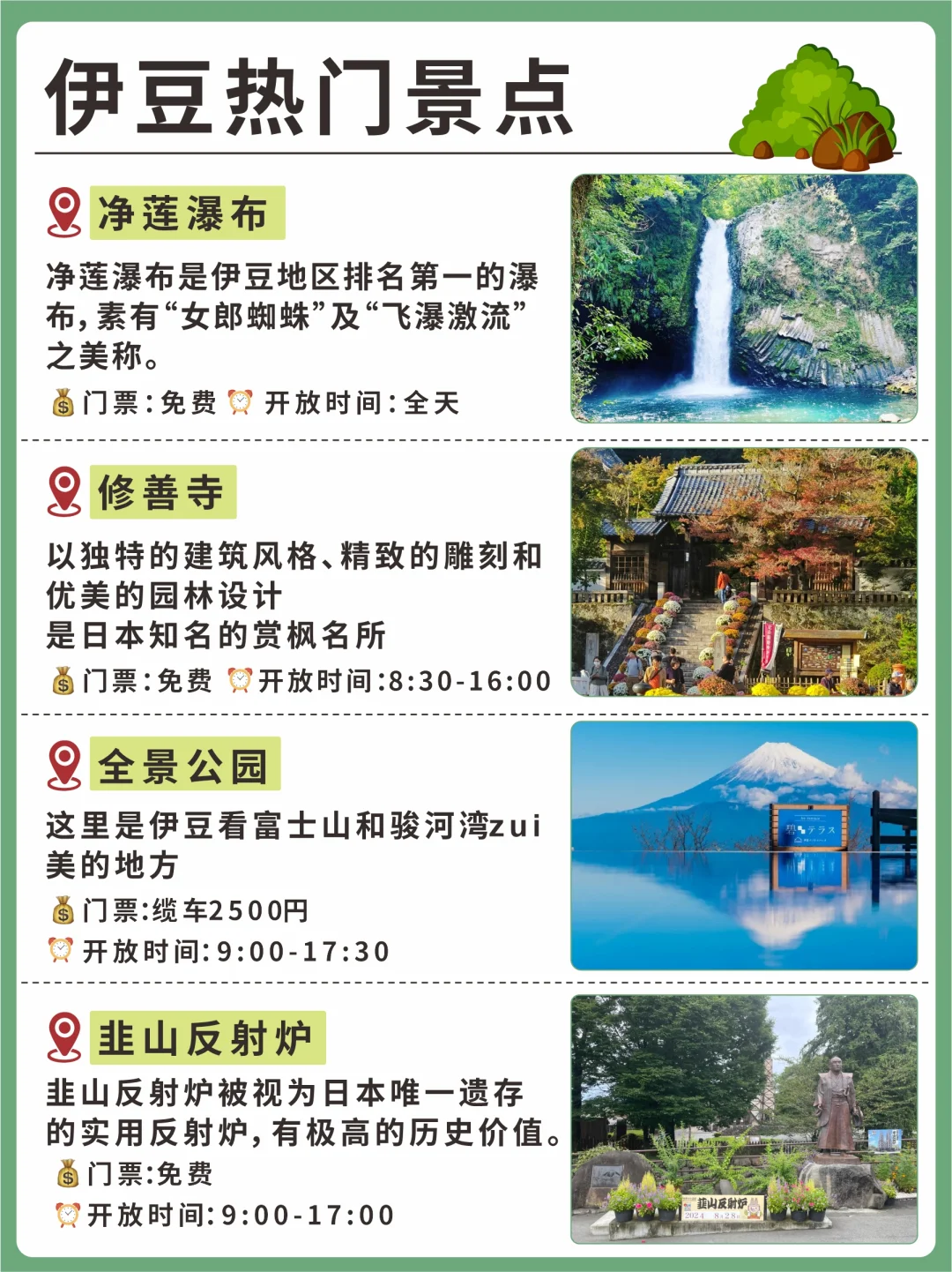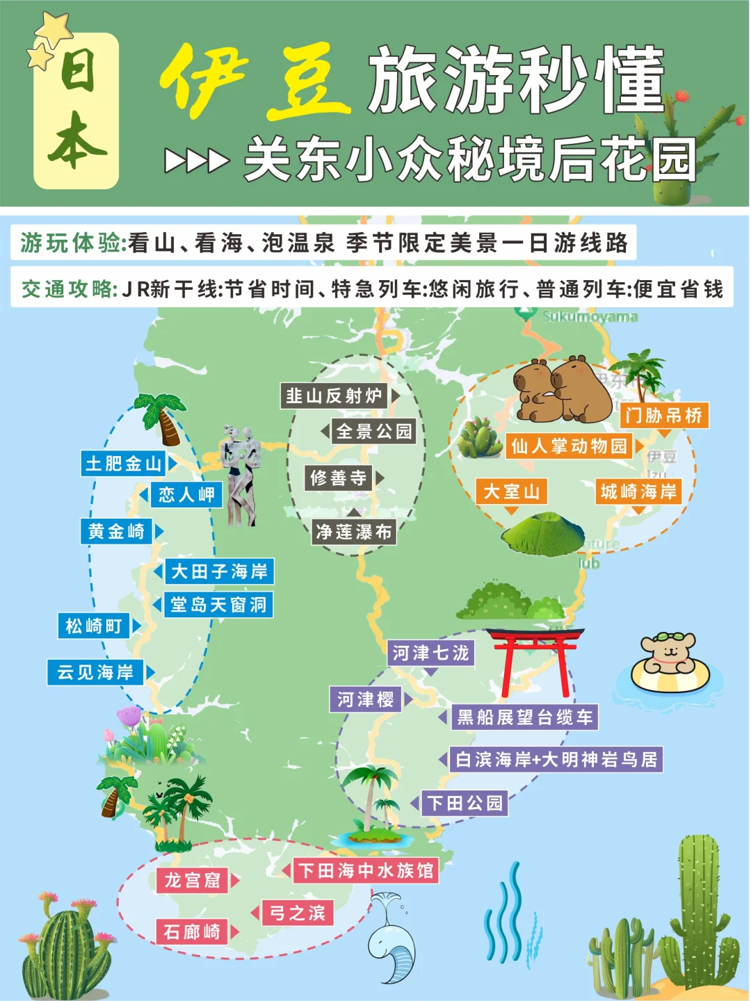 💡根据地图我们把伊豆分成5个片区,这样方便大家安排时间避免来回折腾,时间🕰️较为充足的可以先通过火车🚄到达站点然后公交🚌游览,第二页到第六页有景点介绍,可以选择感兴趣的景点