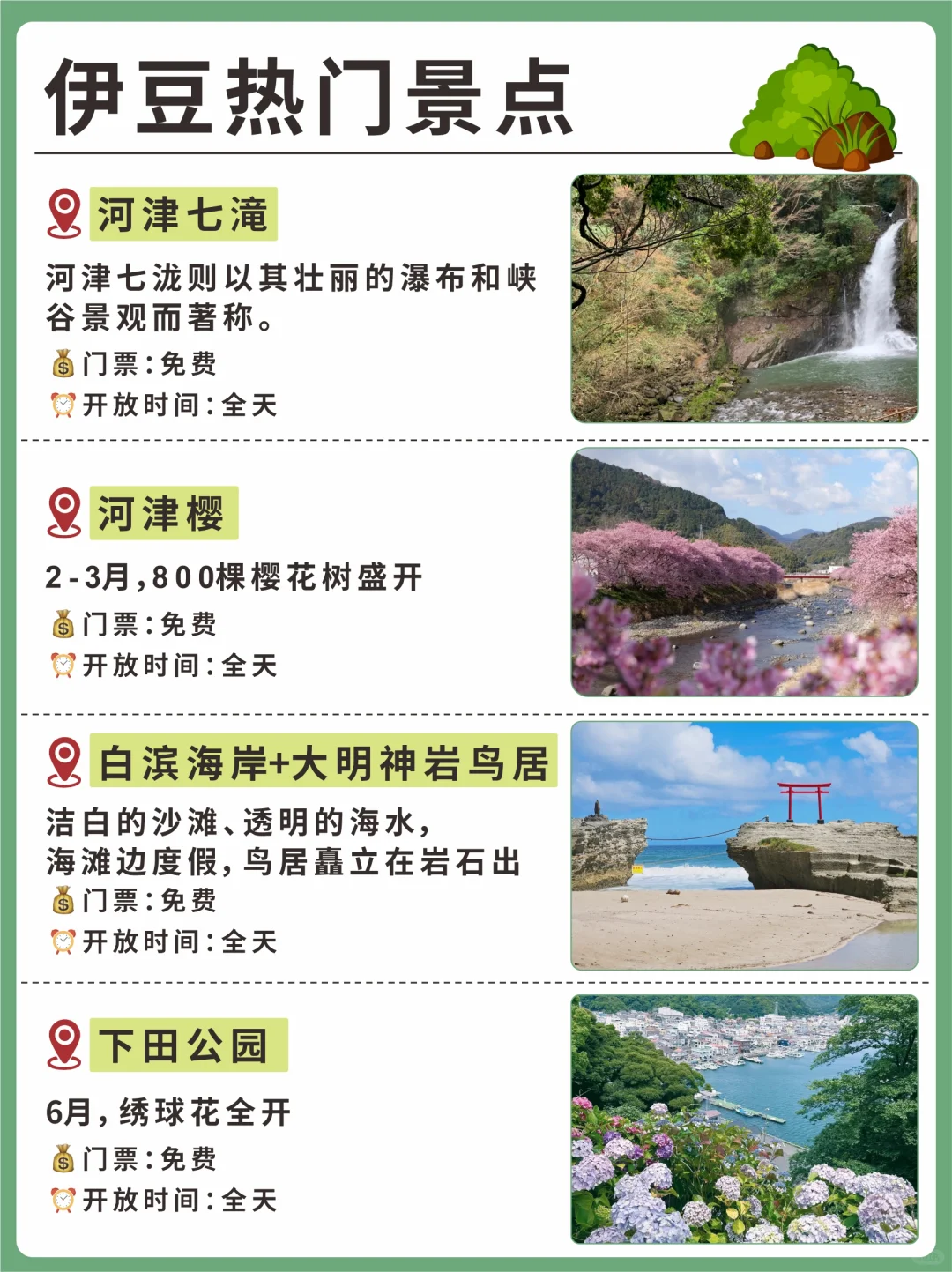 💡河津周边,早春的浪漫先驱,2月就可以看到樱花🌸了,深度游览还可以打卡河津上游的七座瀑布河津七泷,夏威夷同款白沙的白滨海岸,以及建站海边礁石上的朱红色鸟居