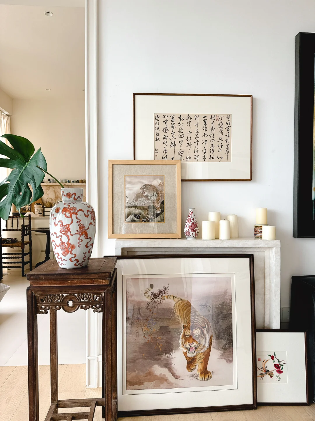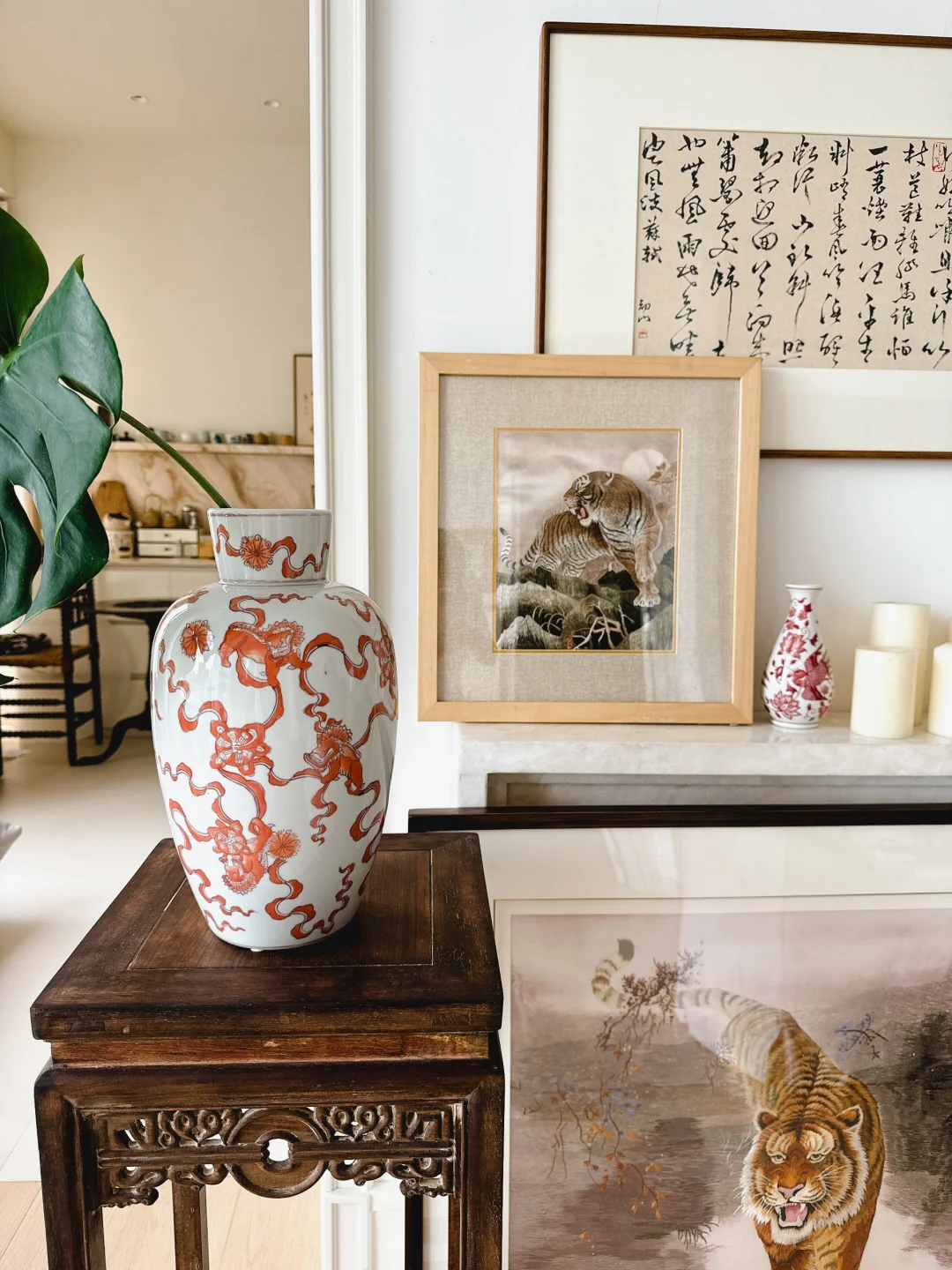 狮子和老虎无疑是动物界中颇具魅力的两个物种,无论是霸气的颜值,还是不容置疑的实力,都让这两种猛兽都享有“百兽之王”的美称。由于这两种动物实力不分伯仲,所以狮虎斗成为人们津津乐道的永恒话题。 但今天要讨论的话题不是狮虎斗,而是狮子和老虎到底能够在软装中带给我们怎样的惊喜! 挑选了【狮子舞绣球】的釉里红花瓶,搭配了绿植,非常有视觉冲击感,空间一下子有了高光点。而以虎为主题的民国老刺绣,既有中国传统美学的力量感,更让这一隅有了狂野又高级的味道。