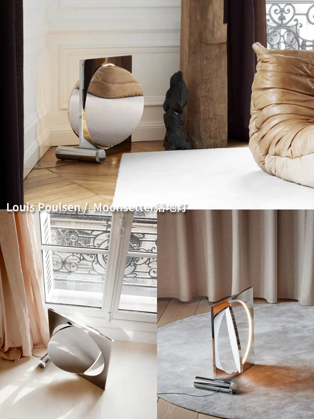 ⚪Louis Poulsen / Moonsetter落地灯:不开灯的时候像是装饰艺术品,开灯后又有氛围光影,银色反光表面显得摩登感十足