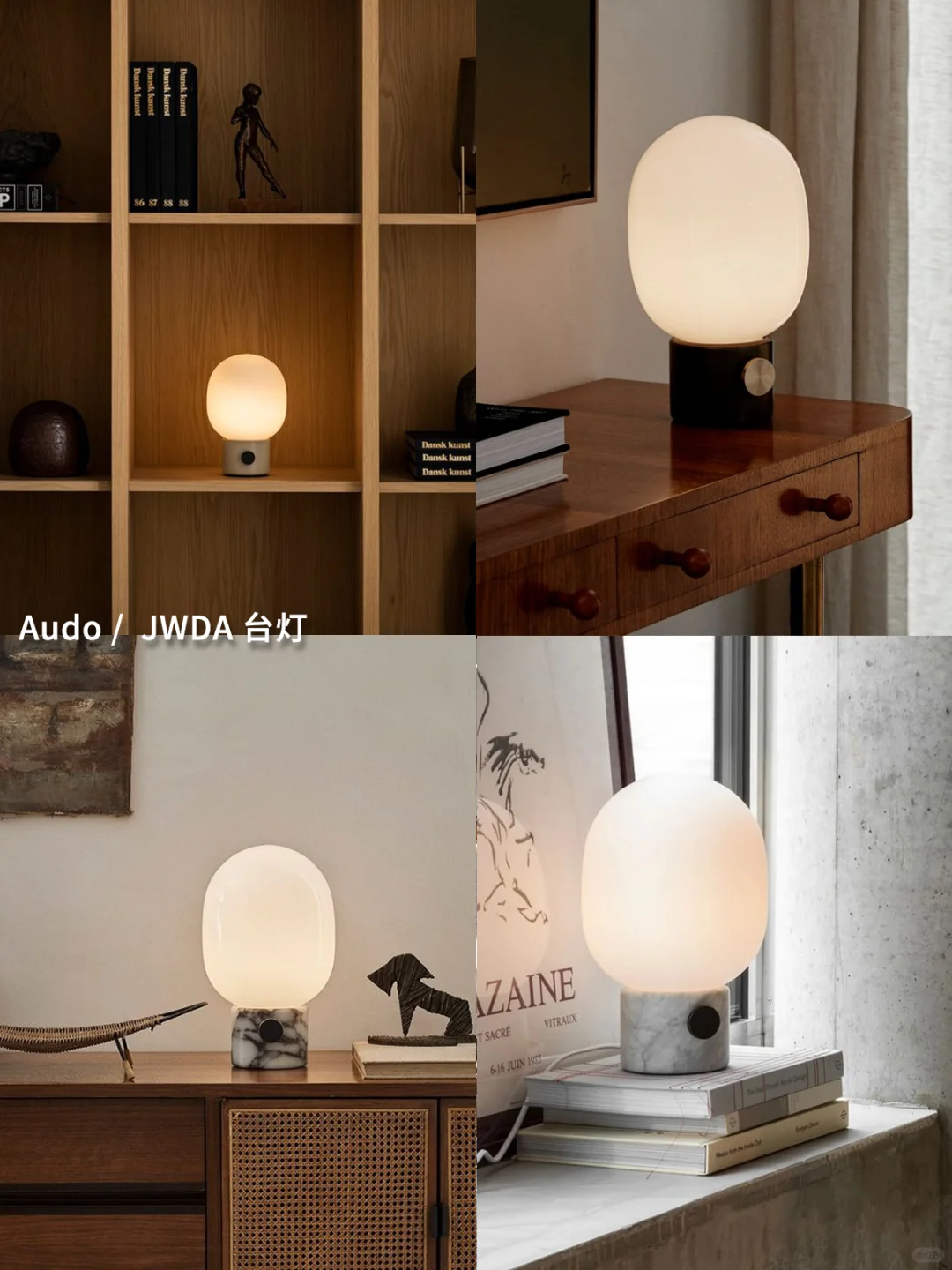 ⚪Audo / JWDA 台灯:圆形玻璃与石纹、金属等质感的灯体底座,形成惹人喜爱的对比感,装饰在玄关、床头、边几桌上,都会显得相当优雅