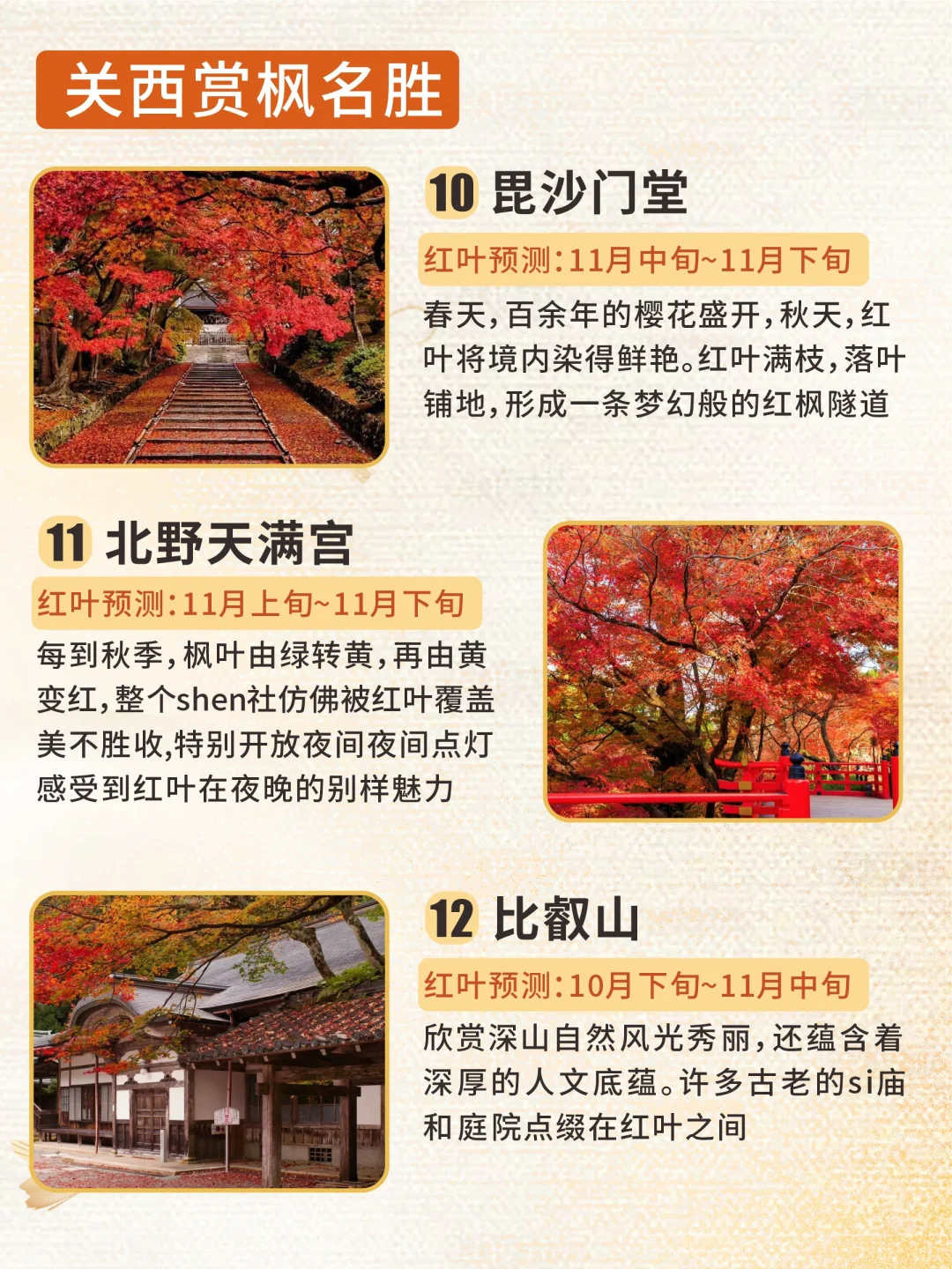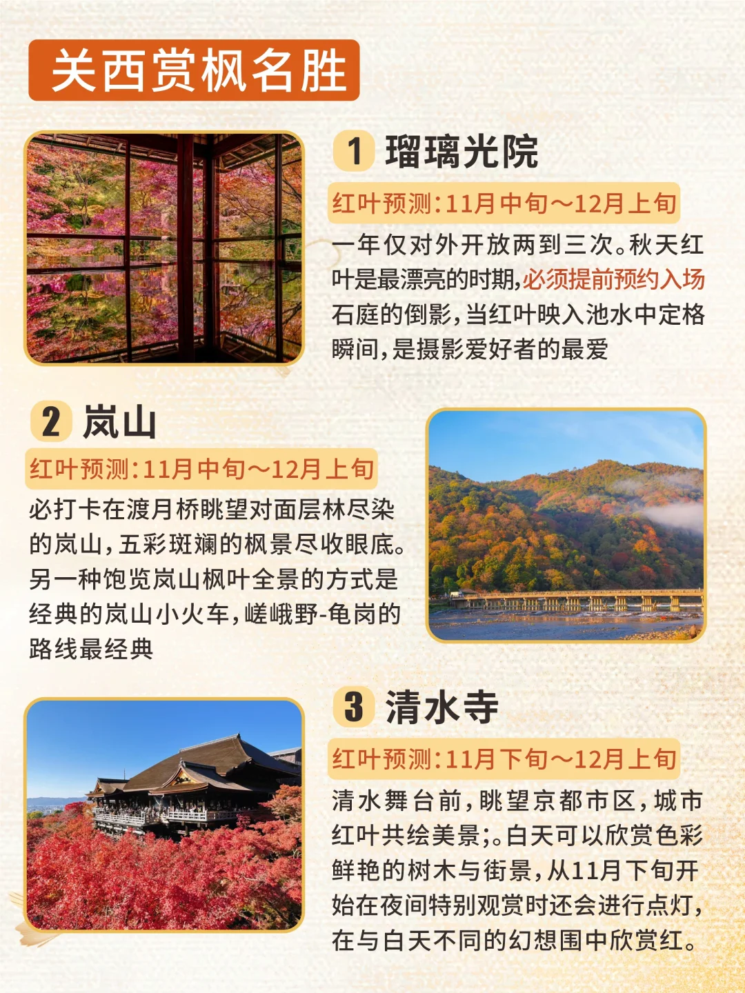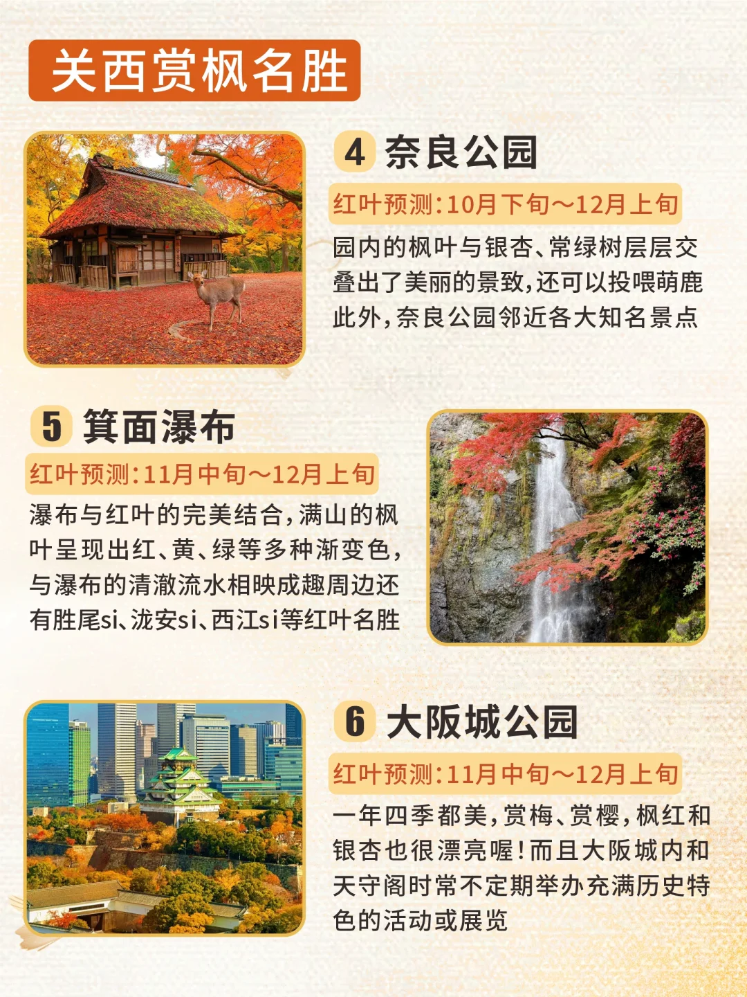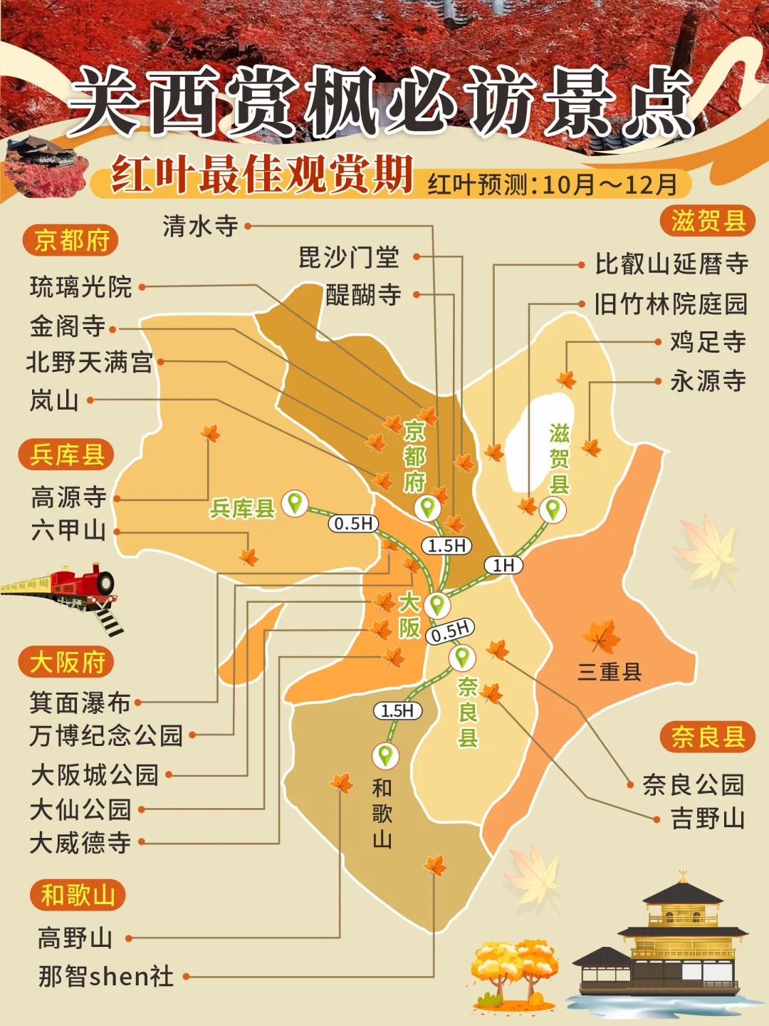 在日本的关西地区,这里的红叶🍁季通常在11月初开始,随着气温的逐渐降低,枫叶逐渐变色,进入深秋,每片枫叶都如火🔥焰般绚烂夺目,探索枫叶季的绝美景点,在秋高气爽的季节中,赏红叶、泡温泉♨️,再惬意不过,无疑是日本秋天最正确的打开方式!小编给大家总结了关西赏秋比较有代表的景点(图1-5)和推荐行程,希望能为即将出行的小伙伴提供帮助~