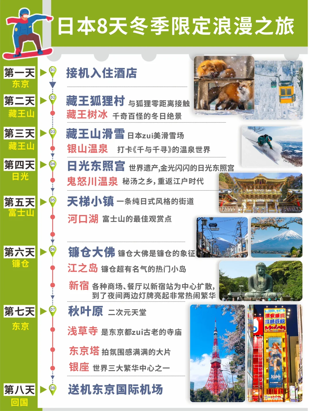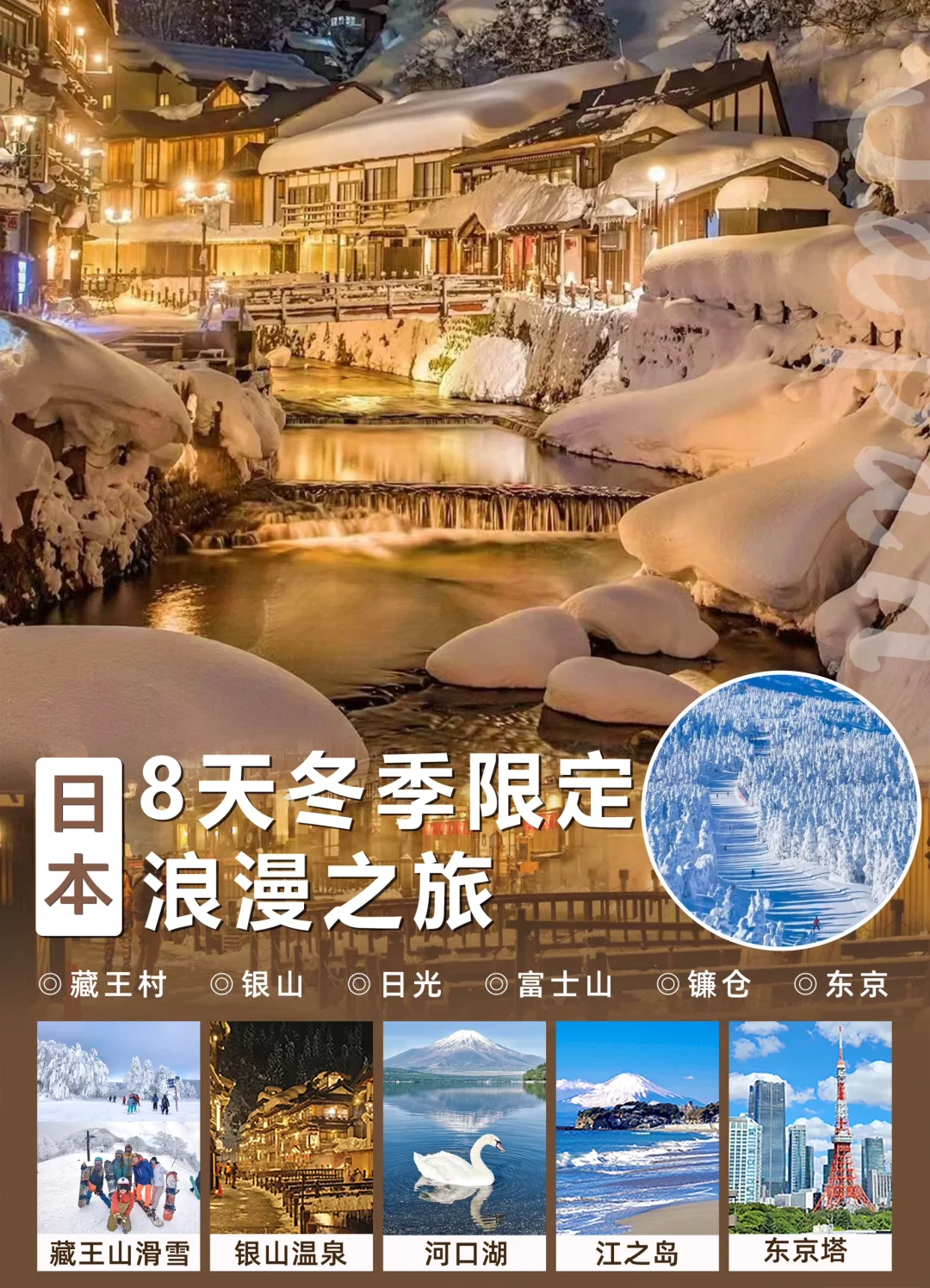 日本的冬天有着独特的魅力,很多人都对日本的雪❄️景有一定幻想,去看雪中的富士山⛰️,还能体验在雪中泡温泉,而冬天的银山温泉♨️绝对属于热门目的地之一,这里就宛如动画《千与千寻》中的神隐地,到了冬天果真就如宫崎骏动画片中的场景一样,隐秘而魔幻。小编给大家整理了一份8天👍🏻的行程。东京进出,深度游玩东京,日光,银山,藏王,富士山经典线路