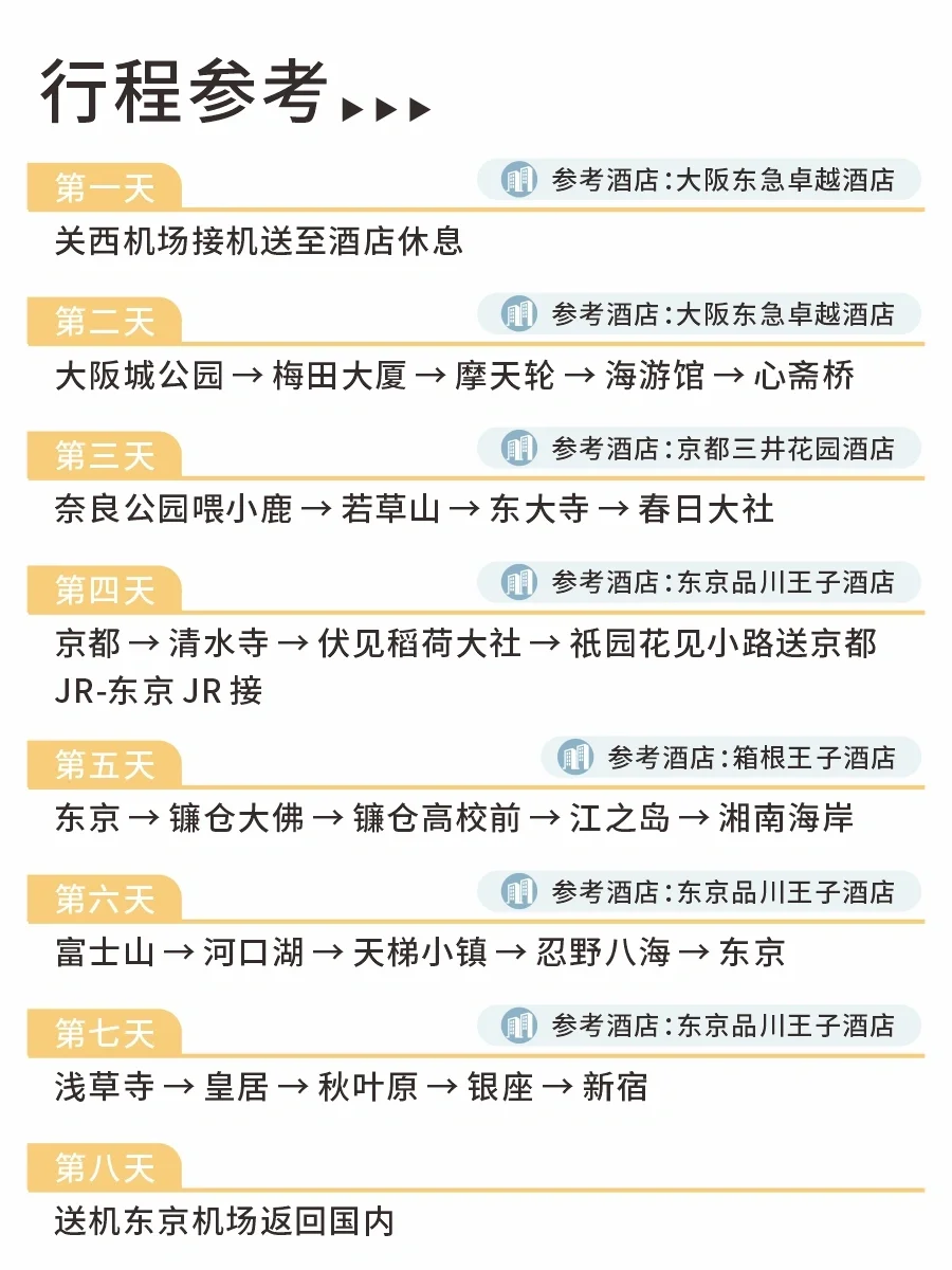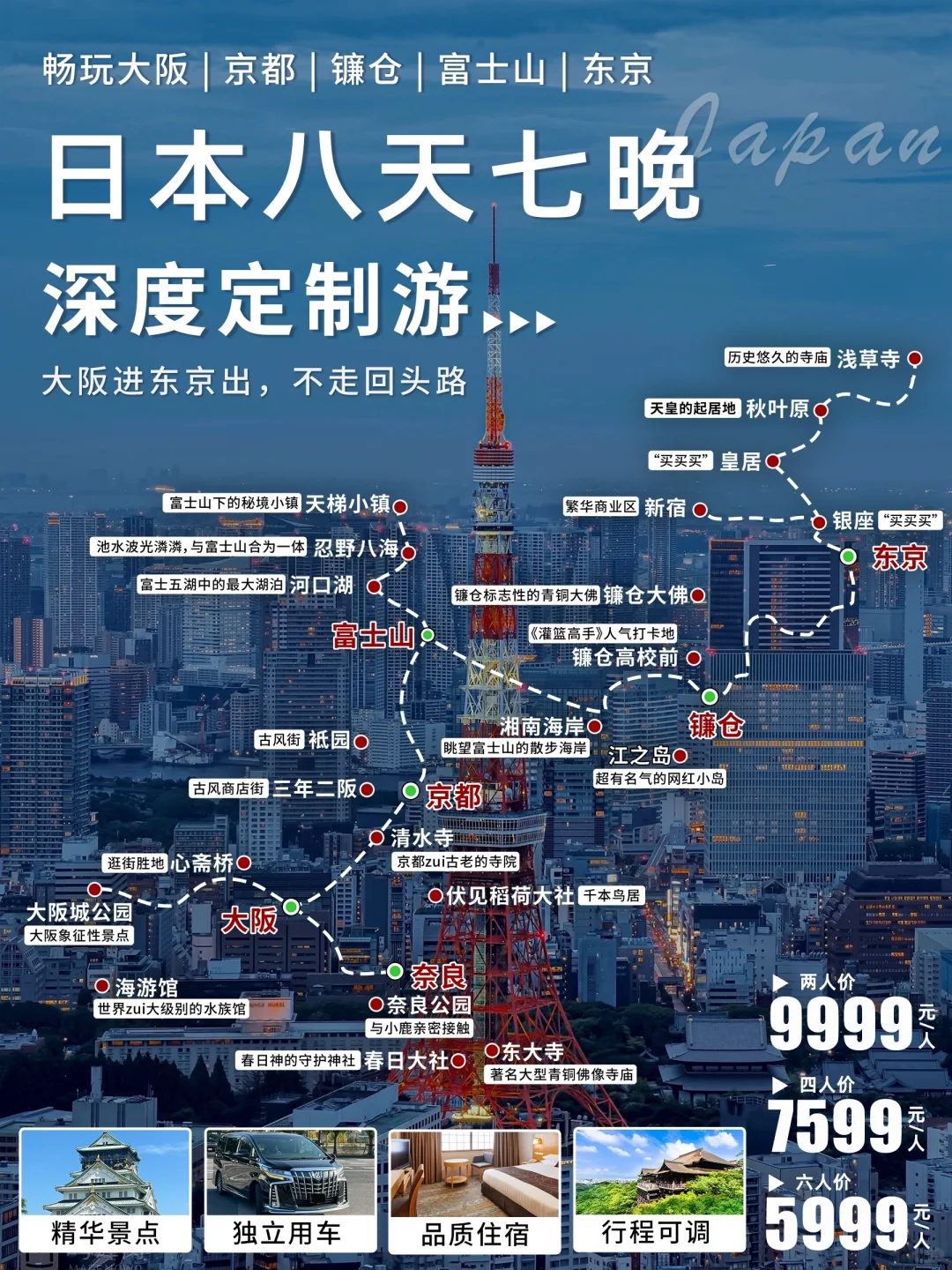 小编给大家推荐👍🏻涵盖东京、镰仓、富士山、大阪、京都、奈良这几个目的地的行程,精选本州精华景点,酒店安排四💎标准酒店(可按需升级),用车🚗埃尔法保姆车,中文司机兼导游,一家一团,自由自在,行程天数🌞还可以按需调整哦!