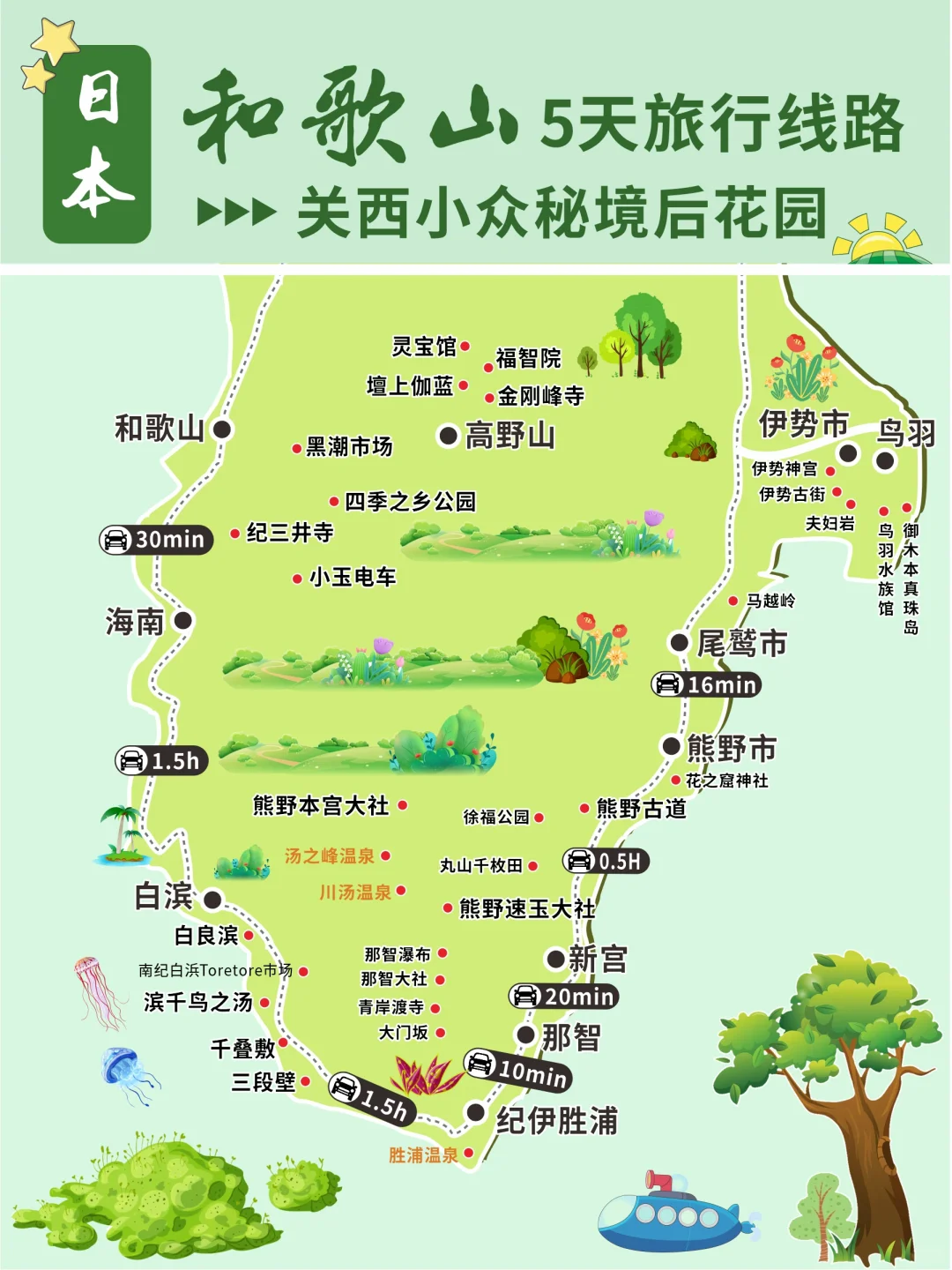 去高野山寻求身心灵上的宁静,这里不仅有与战国武将有渊源的寺庙,还有可以欣赏美丽😍的庭院和屏风画的寺庙…如果你喜欢登山⛰️和徒步,这里的熊野古道,被誉为朝圣之路。同时也有西日本欣赏落日🌇美景的最佳去处 绵延无边的白色沙滩🏖️,映衬着碧蓝的海水,白滨町被称为"日本夏威夷",被称为关西后花园的和歌山绝对能满足你的所有期待