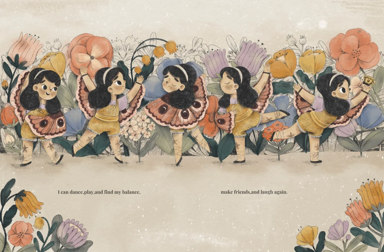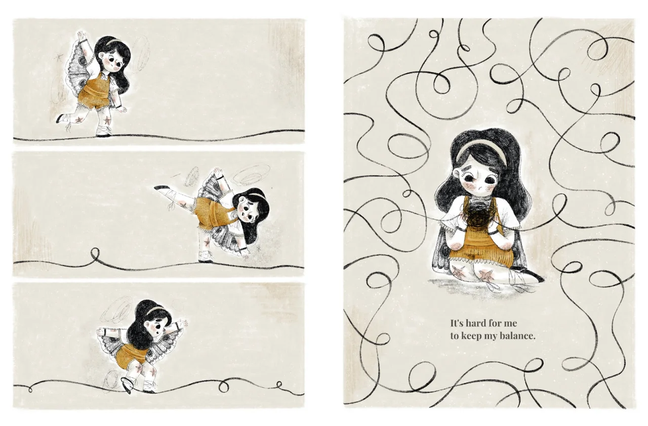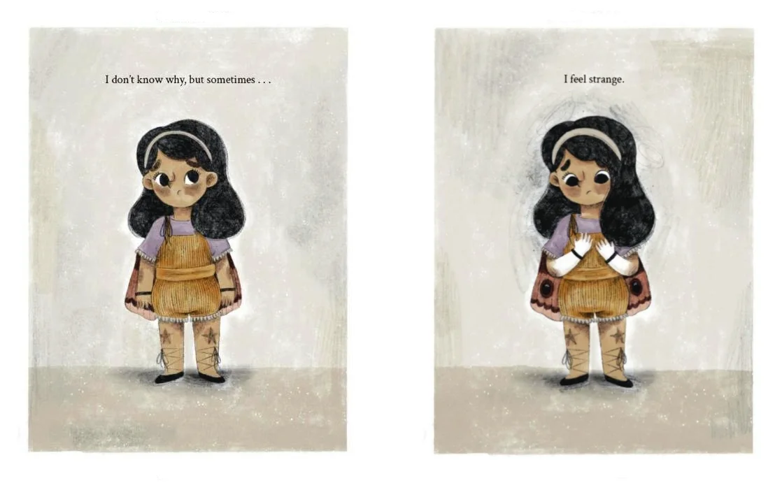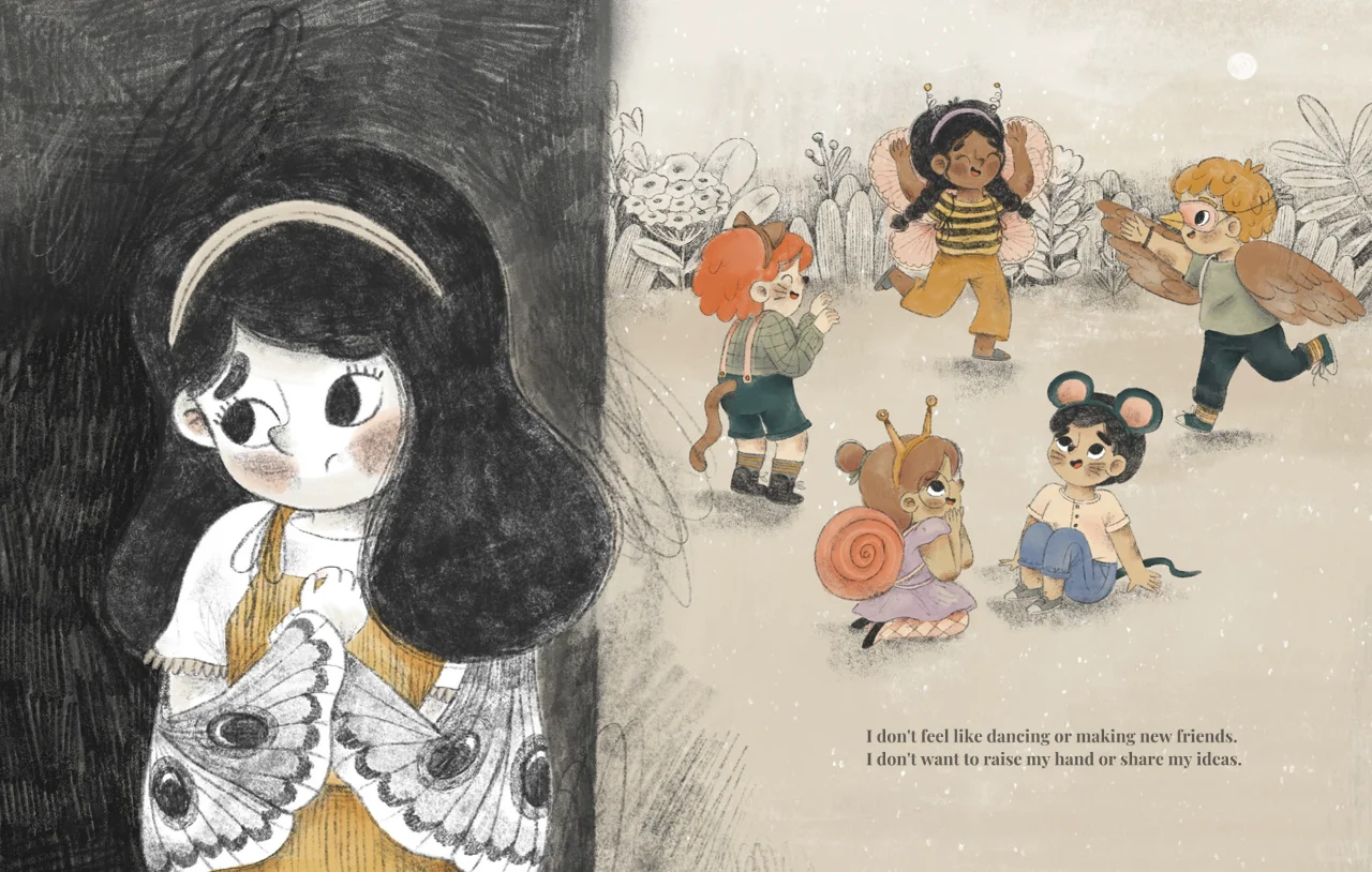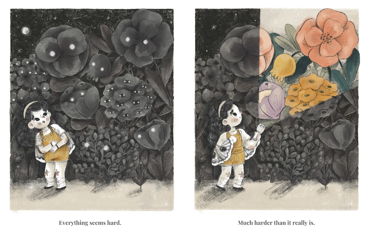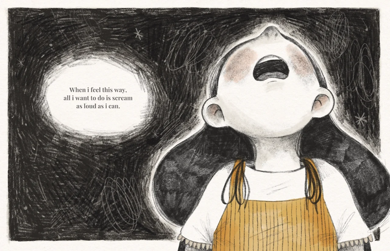 通过呼吸练习、妈妈的拥抱和平静的话语,她能够克服这些感觉,感觉更好。通过极具情感表现力的艺术作品,我们真正感受到了焦虑的痛苦、克服焦虑所需的努力,以及另一方面的解脱感。