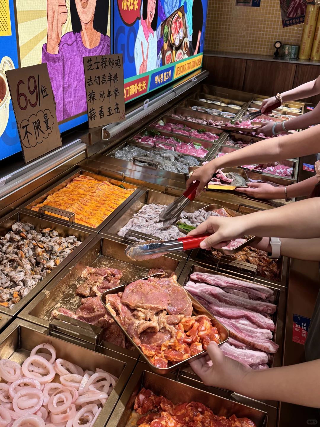 成都!69r随便吃!!一大柜子望不到边的肉!烤肉品质很好,烤出来滋啦滋啦给我香迷糊了,小吃也很全,韩式炸鸡、部队火锅、鱼饼…味道很正很🇰🇷!! 真的难以相信在成都这么多种类随便吃才这个价。。。为什么我家楼下不能开一家我请问呢[生气R][生气R]