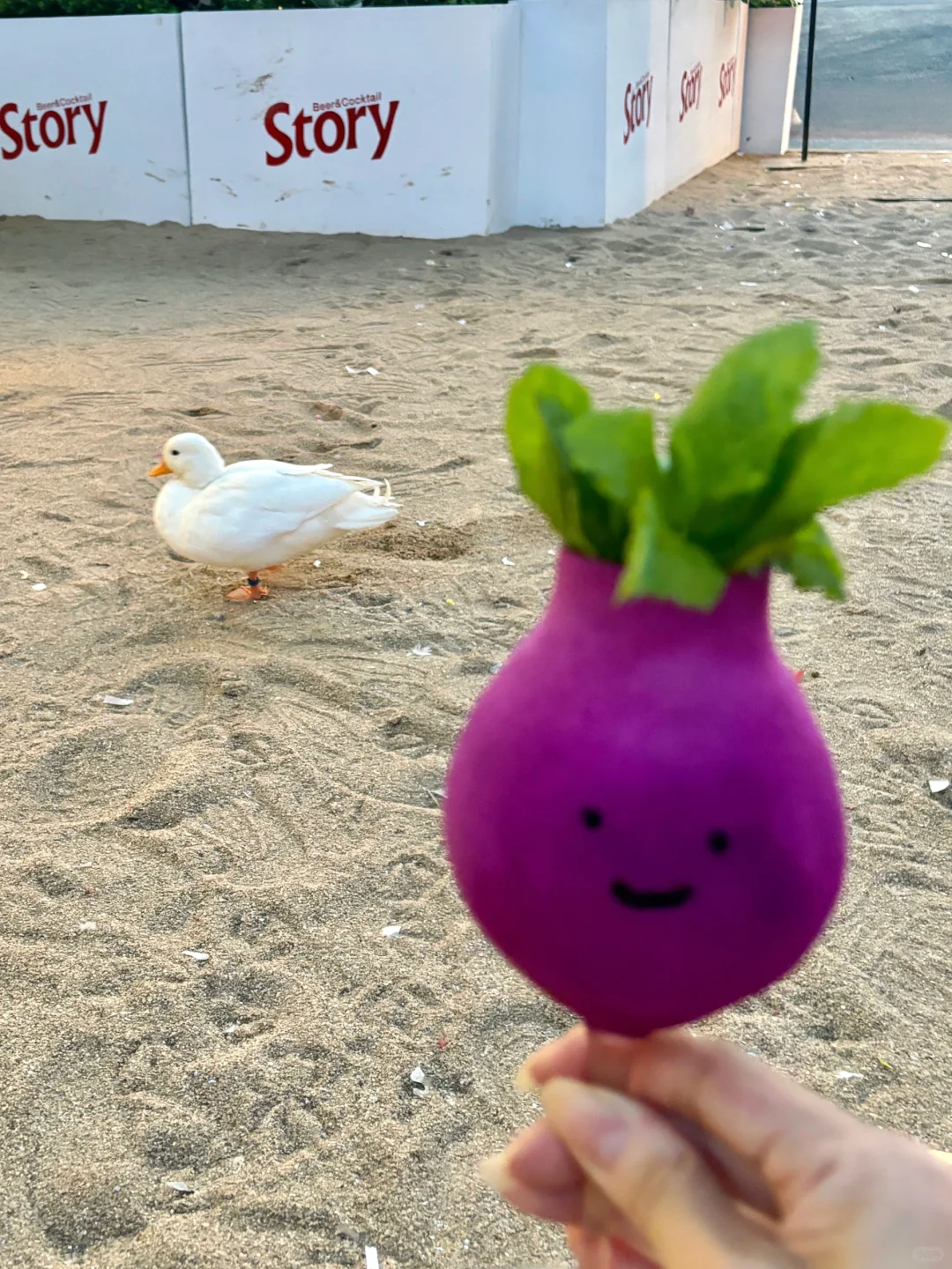 有一只见人九打招呼的小鸭子,大概是老板养的,在沙滩上跑来跑去好可爱。