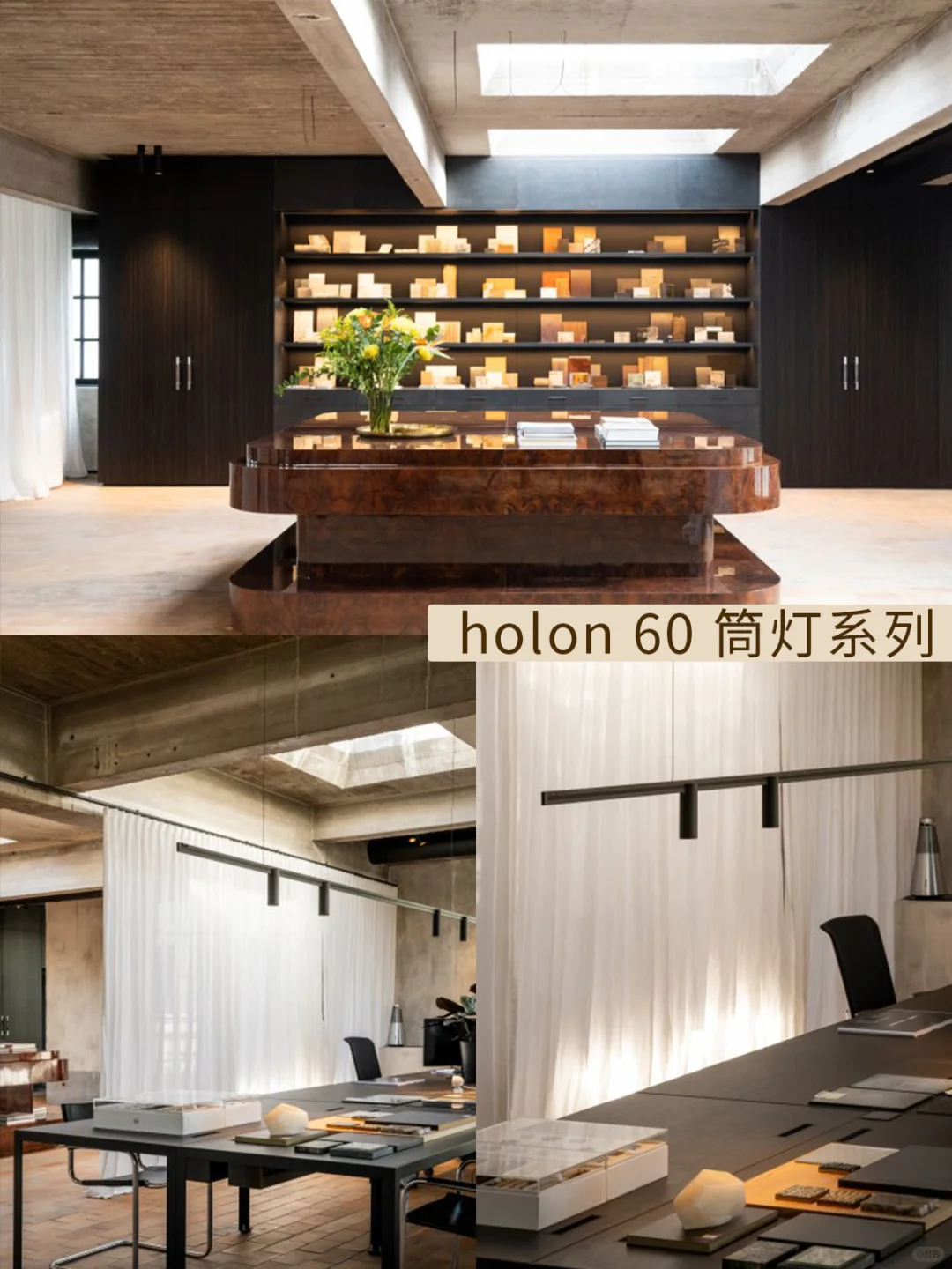 令人印象深刻的墙壁充当了一个装满样品的柜子,风化的照明细节有助于突出显示物品。该柜子每月展示新样品,同时也充当办公室不同区域之间的连接点,并由多个kreon holon 60 灯具加以强调。