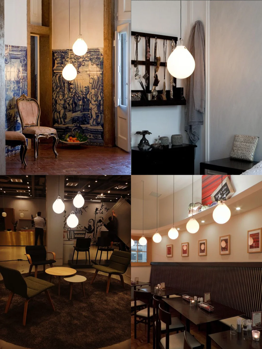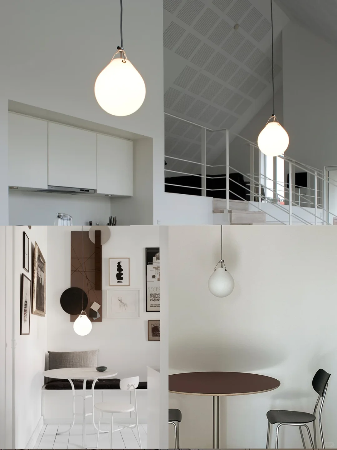 Anu Moser的设计中经常以自然元素为主轴,Moser 吊灯就是封闭式的水滴形狀,磨砂玻璃灯罩整体包裹,环绕直视灯罩也不会刺眼。