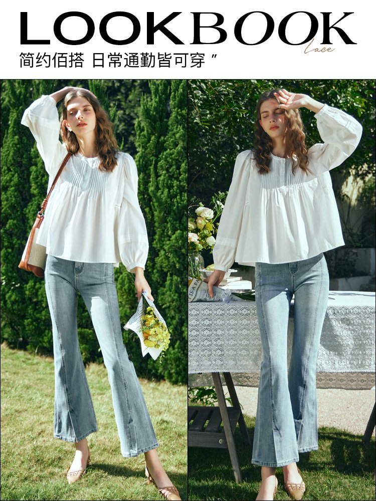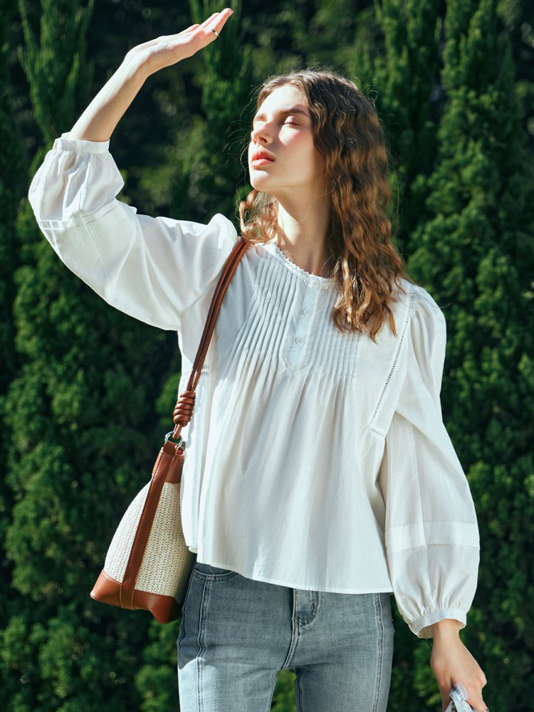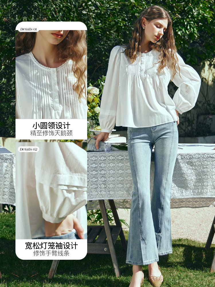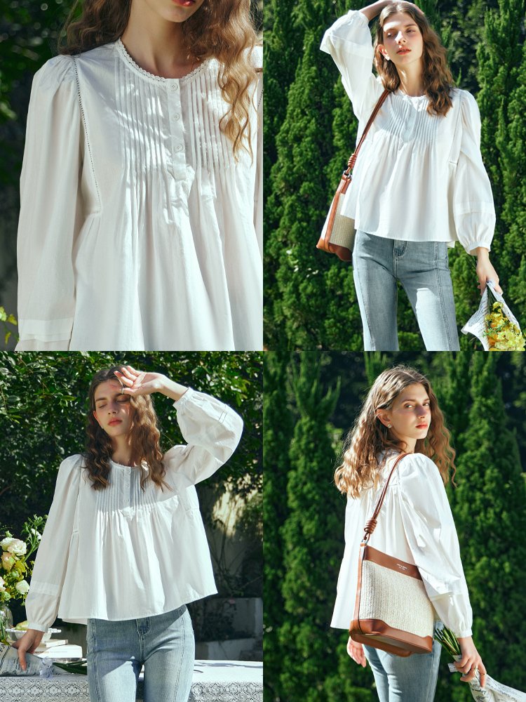 采用衬衫时装面料,舒适透氣,亲肤柔软细腻;柔滑垂顺,抗’皱性好,不易变形方便打理;小圆领口,领口拼接小花边,修饰脖颈线条;前中采用牙签条工艺,丰富层次感,立体显瘦;两侧及后背拼接小花边镂空,细节精至重工;宽松灯笼袖,松弛慵懒,袖身风琴设计,修饰手臂