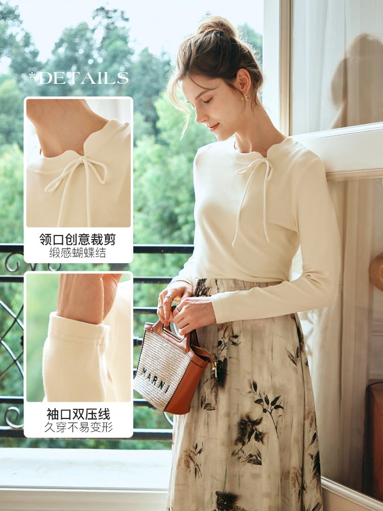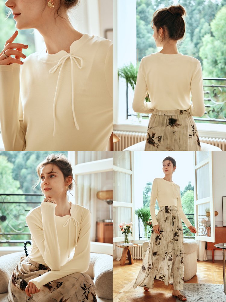 环葆木浆纤维,环葆亲肤舒适,回弹性好,品质感强,不易变形不起毛球,日常好打理,领口融入新中式美学,简约不简单,低调好穿搭,缎感蝴蝶结装饰,可自行调节形状,丰富造型