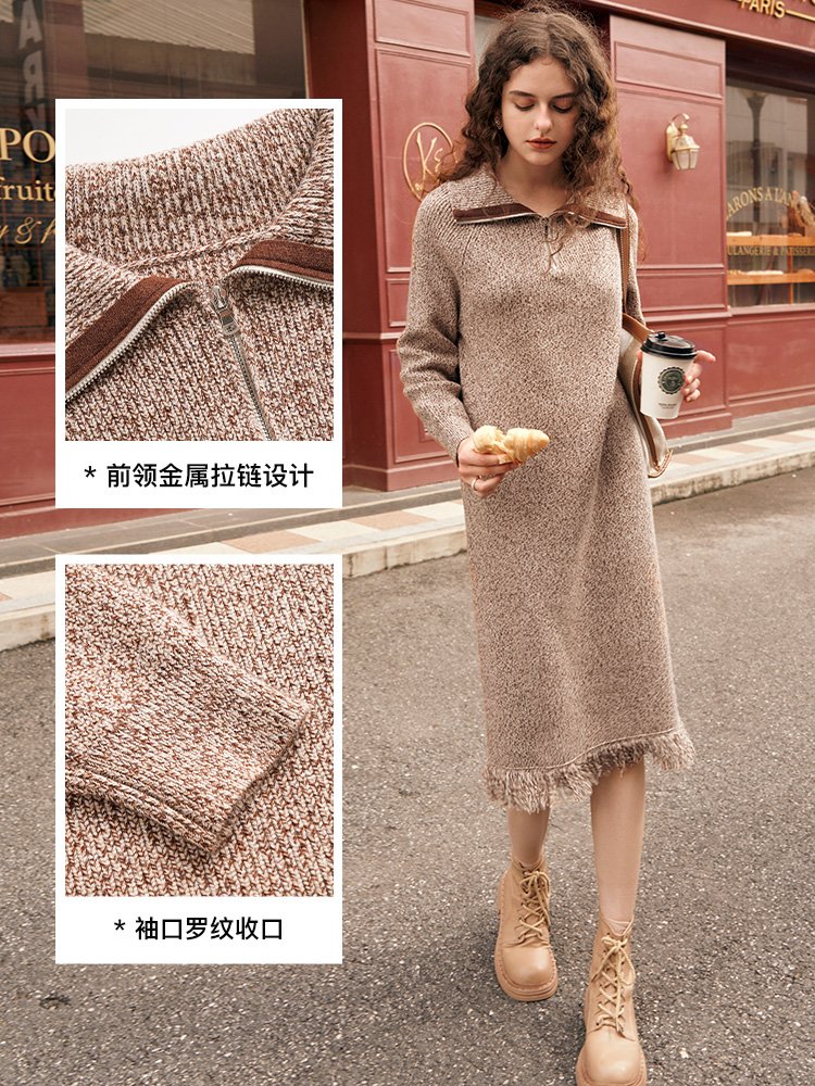 大翻领,领边撞色贴,前领拉链可调节领口深度;插肩袖具有包容性,袖口罗纹收边,防止变形;裙摆人工流苏工艺,精至有层次,动态灵气又撩人;微宽松H版型,包容性强,打底外穿都合适