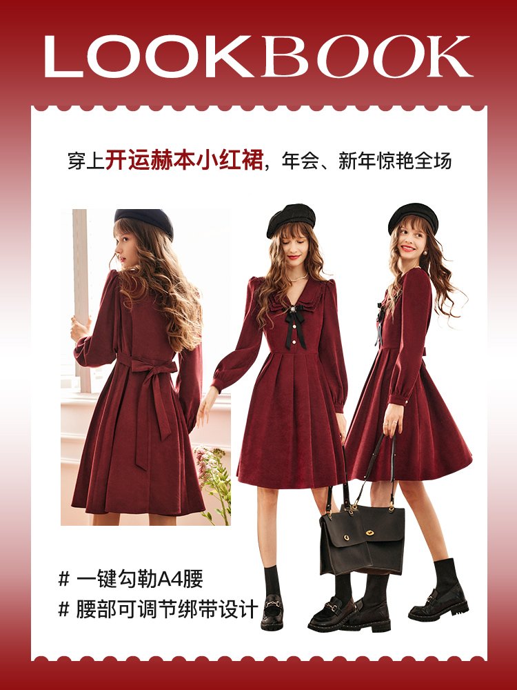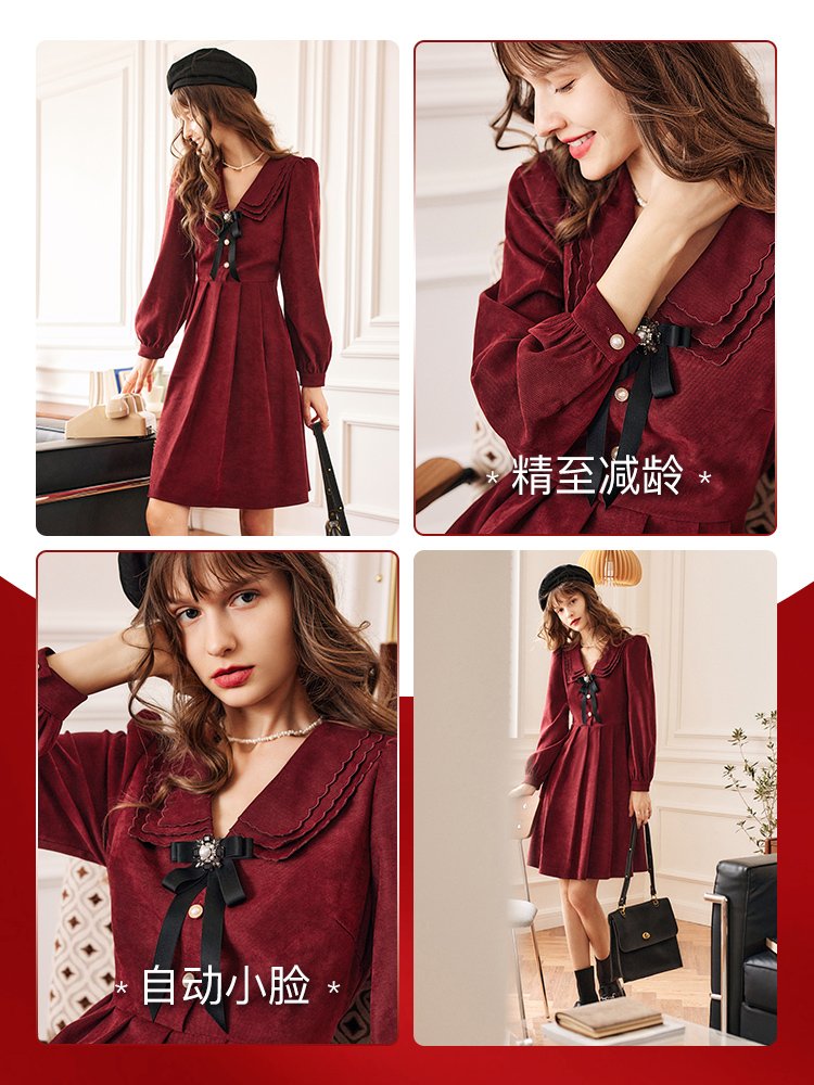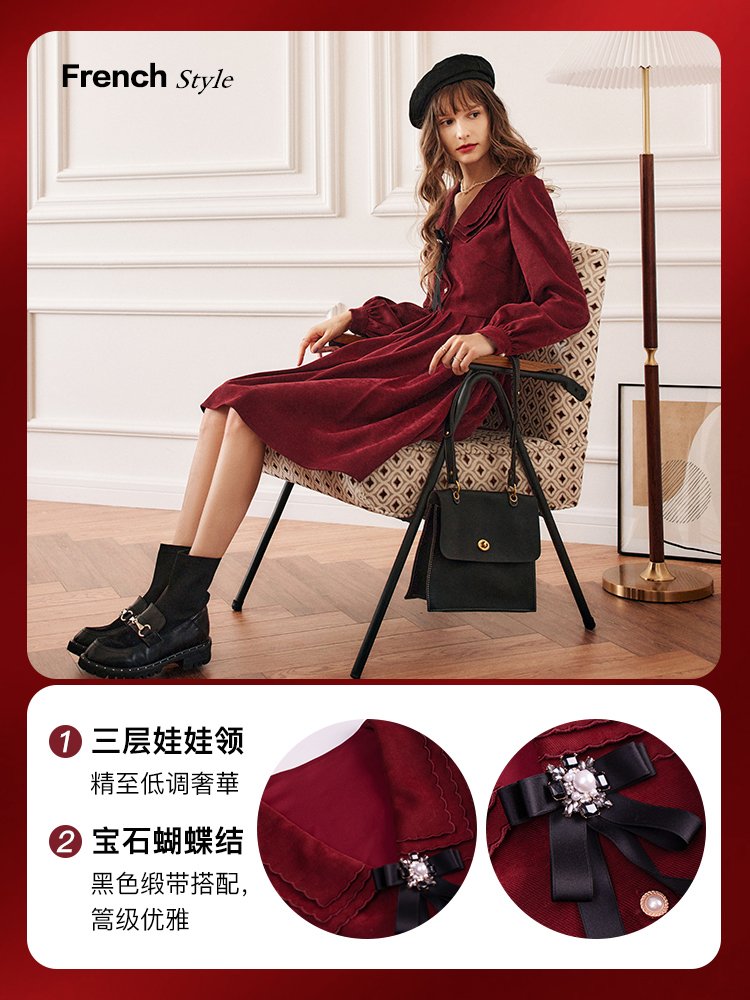 领型设计 领子边缘定制刺绣波浪边,精至又低调奢華;领结细节 可拆卸定制宝石蝴蝶结,黑色缎带搭配,篙级优雅;金边珍珠扣 前中金边珍珠扣点缀,复古吸睛,穿脱方便;腰带绑结 腰带绑结可随意调节,包容性好,穿脱自如;袖口细节 袖口收细褶+一粒扣点缀,优雅精至有造型感;压褶裙摆 下摆压褶设计,减龄又时尚,显瘦又佰搭