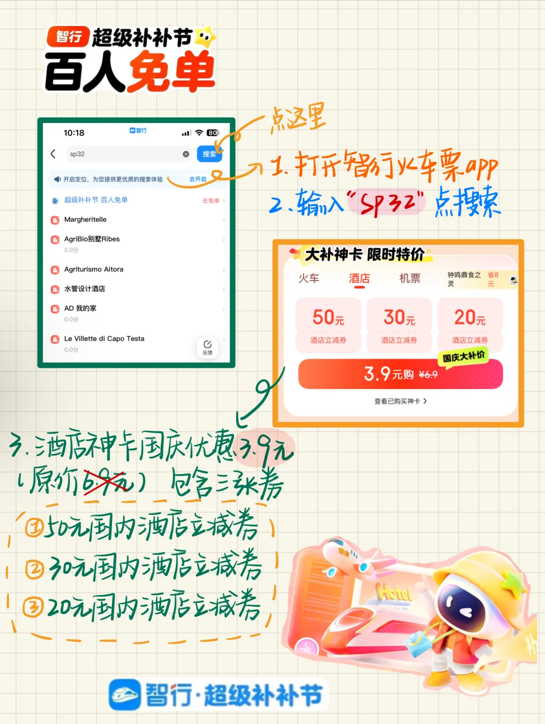 国庆长假倒计时ing 要出去玩的宝子快看过来智行的超级补补节超给力 [点赞R][点赞R][点赞R] 这一波羊毛来的太及时了酒店神卡 原价[钱袋R][钱袋R]6.9 现在只需[钱袋R][钱袋R]3.9 包含50元国内酒店立减券➕30元国内酒店立减券 ➕20元国内酒店立减券 小tips 1️⃣打车智行火车票app 搜索框输入“SP32” 2️⃣进入超级补补节活动页下拉选择酒店神卡 3️⃣ 另外新人还可领取国内外机酒补贴 要出去玩耍的小伙伴快去智行看看 咱们该省省该花花 主打一个会过