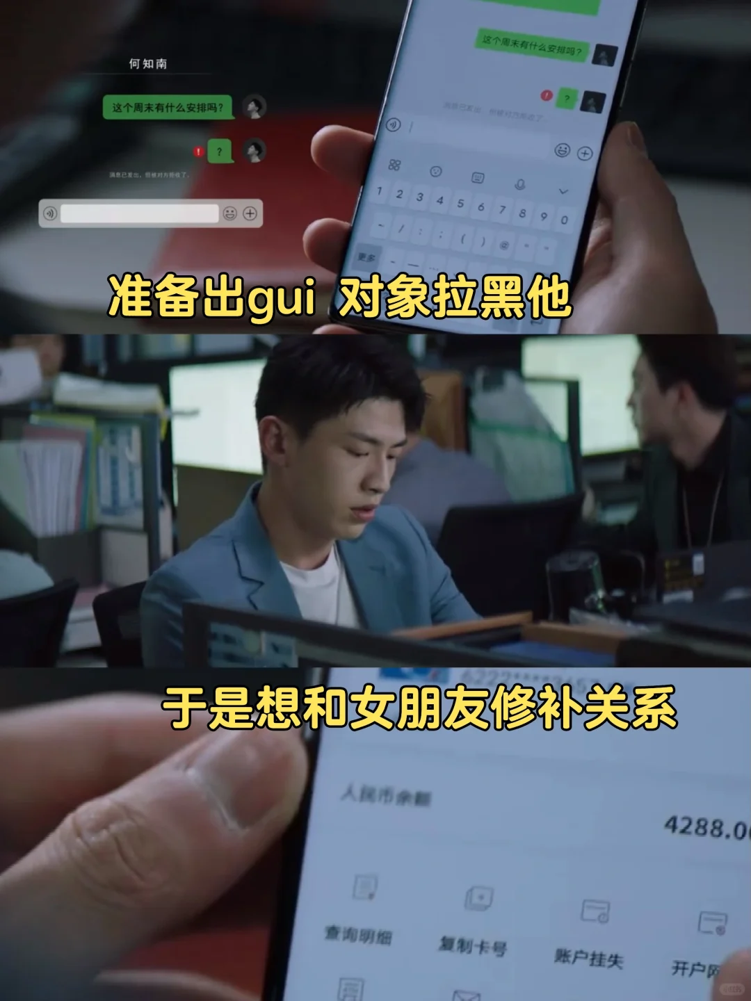 瞿一芃想约何知南出来但是却发现自己被拉黑了,于是他又想和女朋友修补一下关系,去女友送🎁,结果看了下余 额,他想起了自己的报 销。