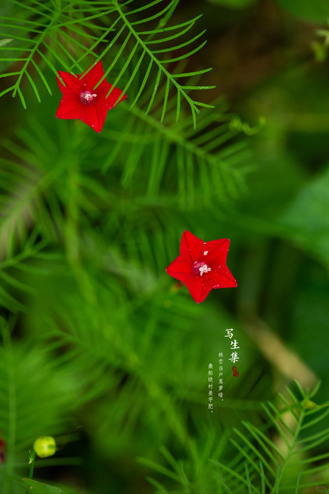 林峦当户茑萝暗, 桑柘绕村姜芋肥。 ———— 【茑萝】 学名:(Ipomoea quamoclit L.)是旋花科番薯属一年生柔弱缠绕草本植物。 花序腋生,萼片绿色,花冠高脚碟状,深红色。 花期7-9月;果期9-10月。 茑萝因叶似鸟羽,又为爬蔓性草木,故名。