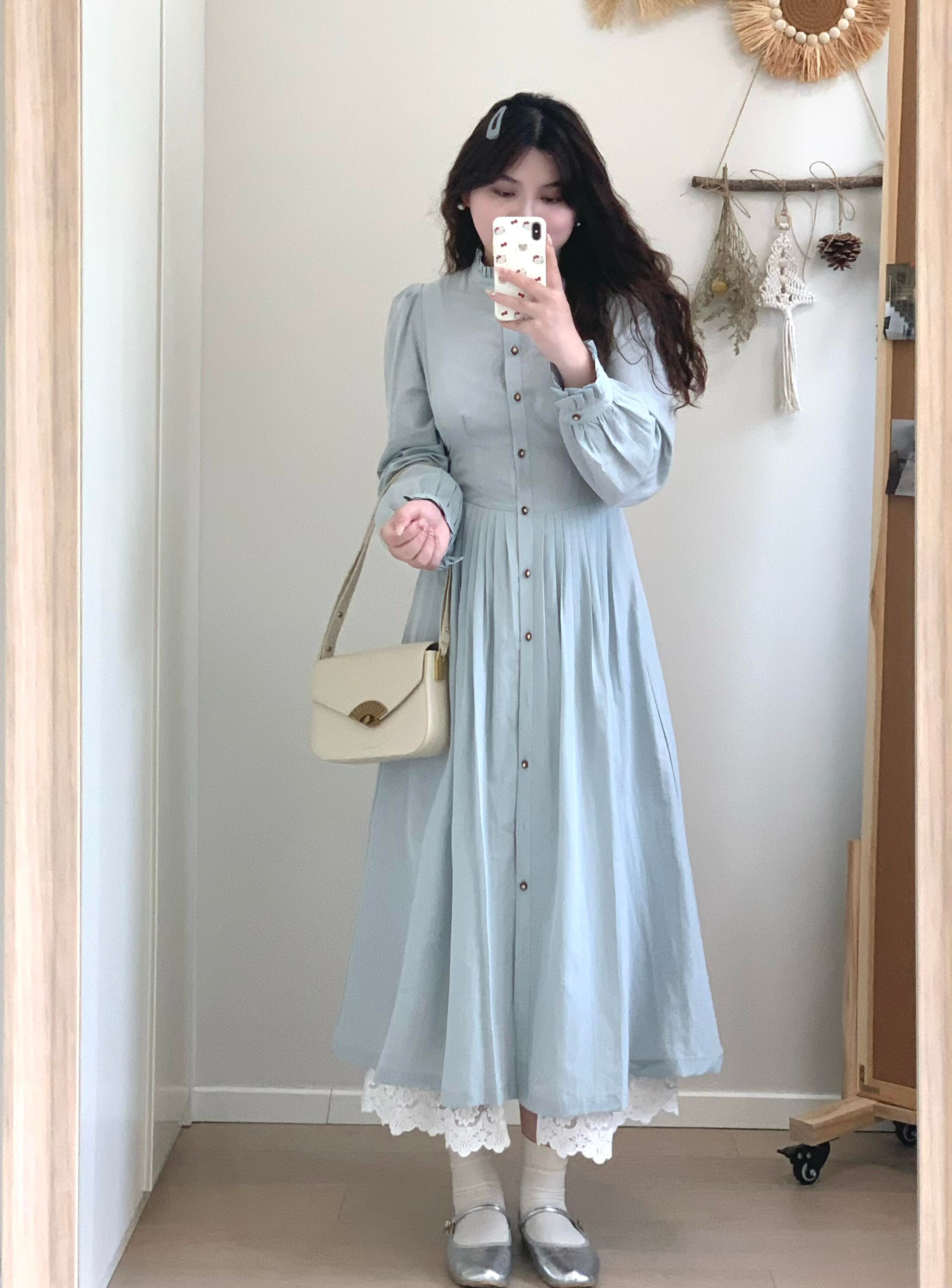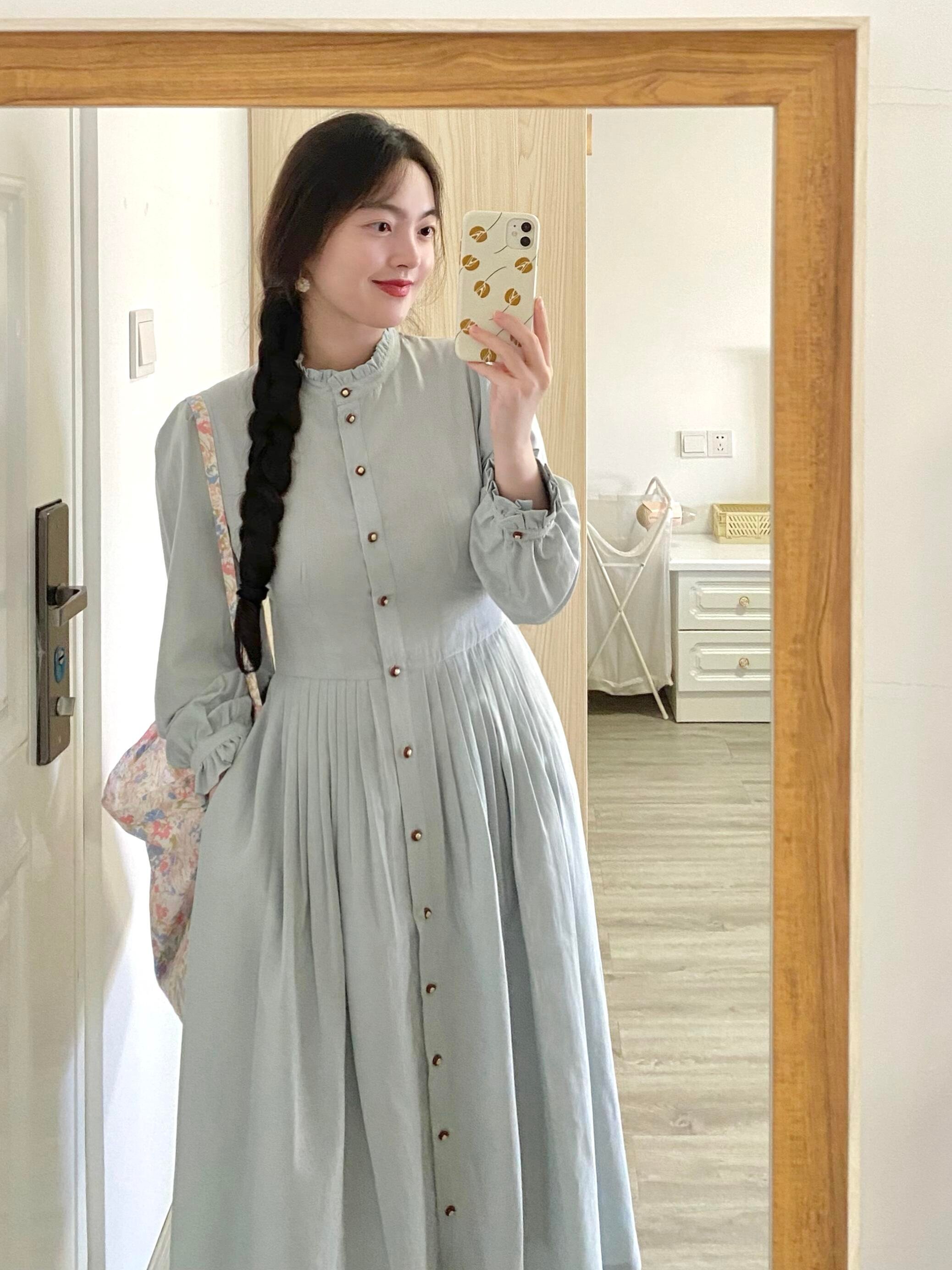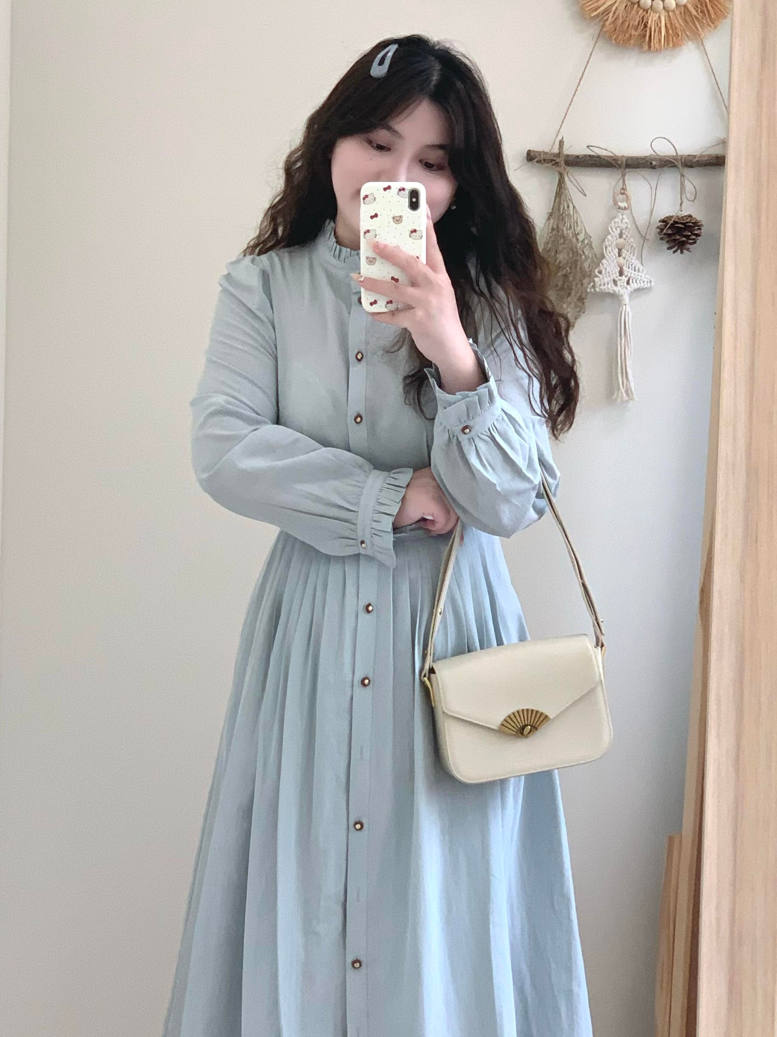 蓝色长袖衬衫长裙小个子法式气质高级感