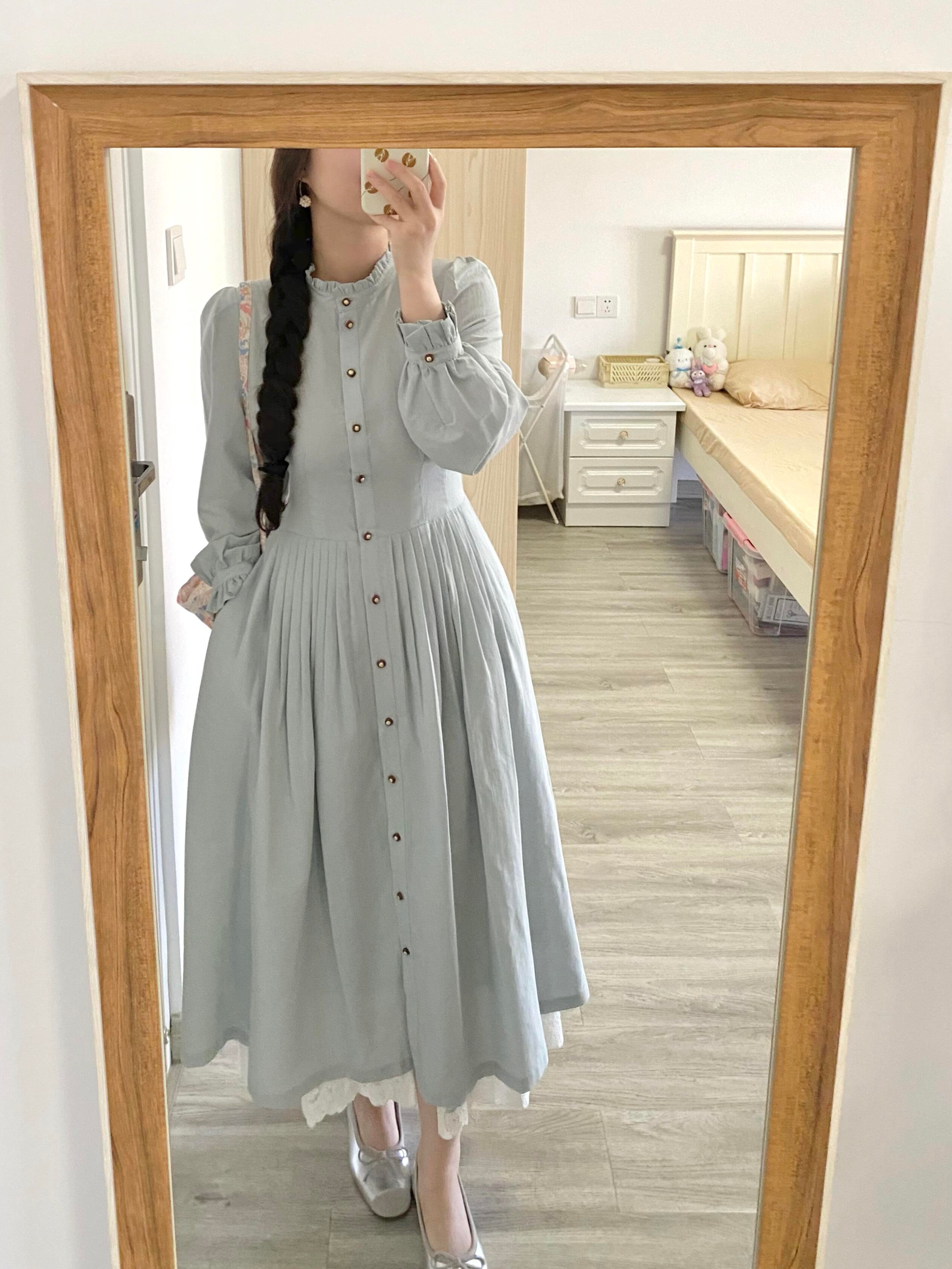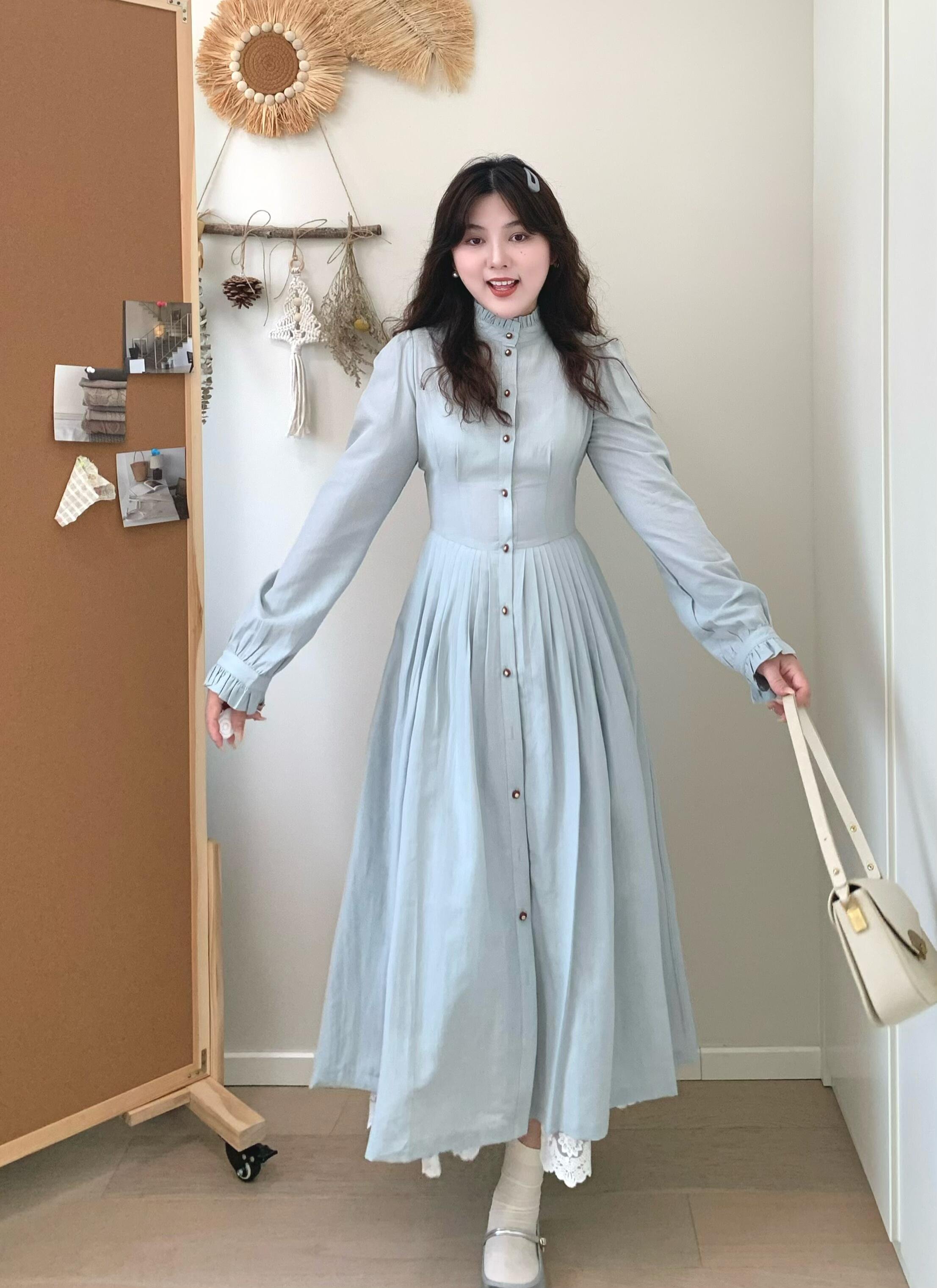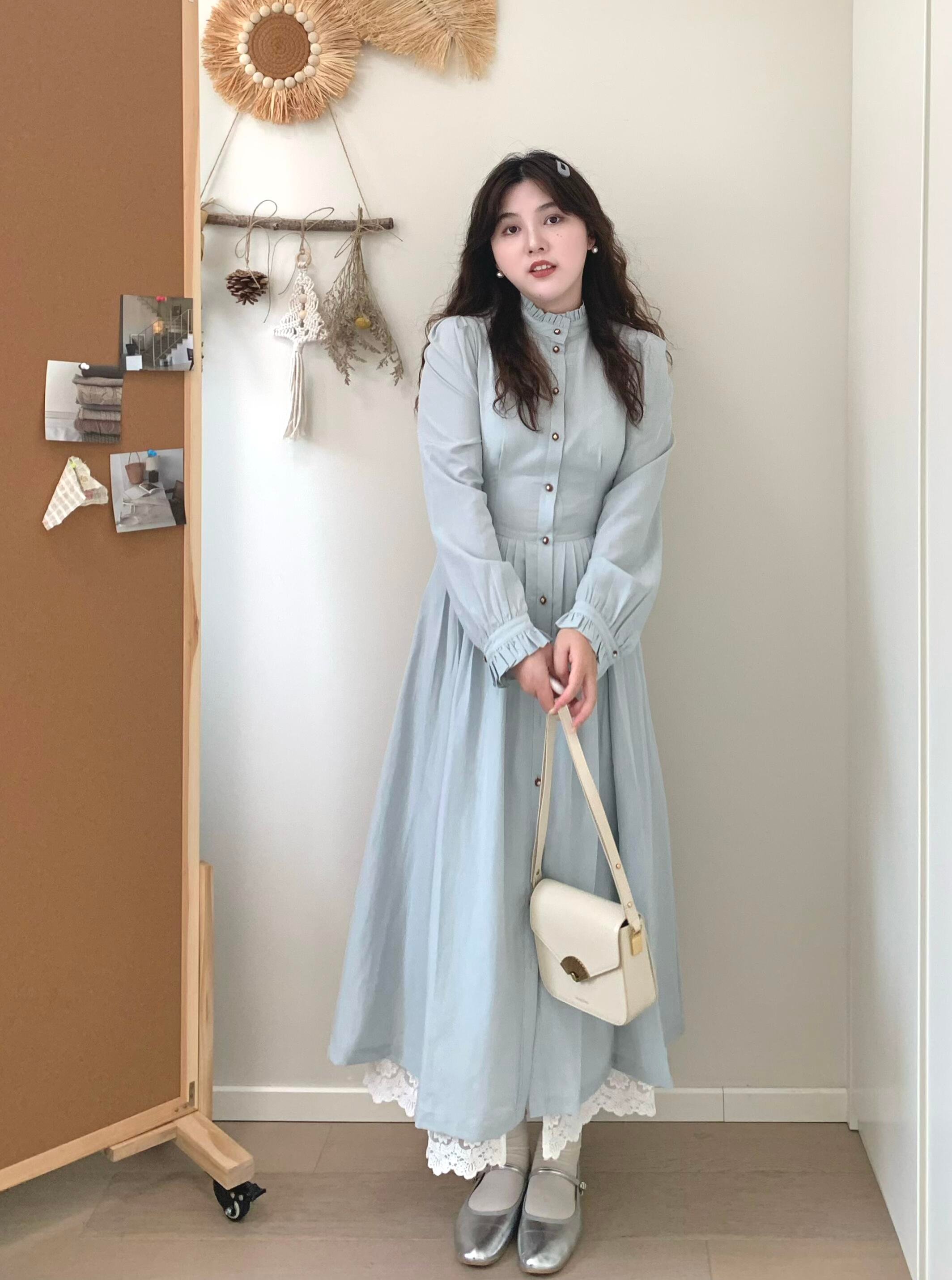 蓝色长袖衬衫长裙小个子法式气质高级感