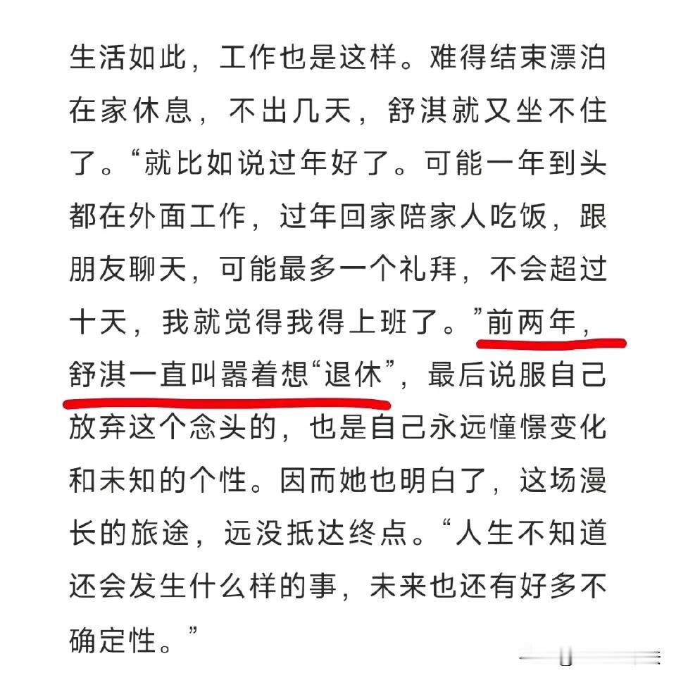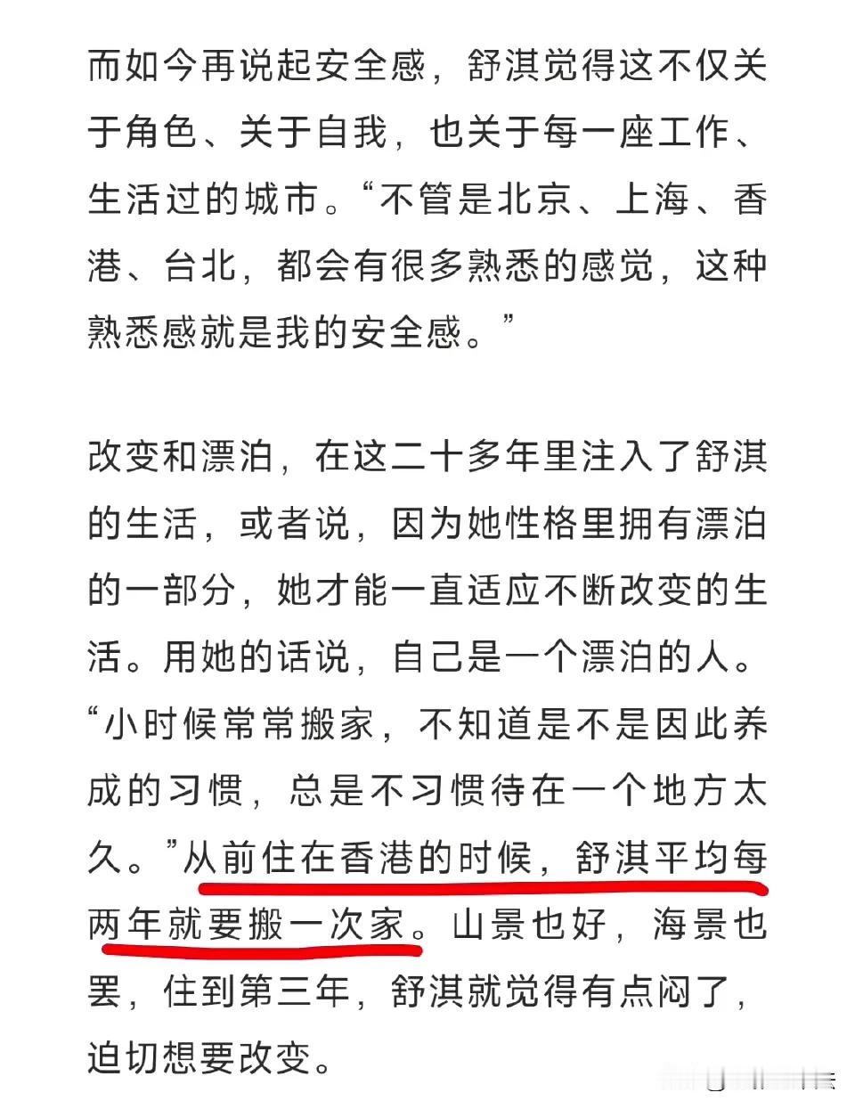 想不到舒淇已经这么红了,还依然缺乏安全感! 9月23日,舒淇因为一段采访冲上热搜,舒淇在采访中坦诚了自己从小就缺乏安全感,还透露了因为小时候经常搬家,导致现在不习惯呆一个地方太久,平均每两年就要搬一次家。 网友看后纷纷发表评论: 一想到有大包小包的东西,我想我还是喜欢住一个地方。 为什么舒淇的安全感和我们的安全感是相反的呢? 她也是典型的bpd啊。 一看到这点,我就搜了一下,结果和我猜的一样,舒淇是白羊座,我也是这样,这个星座一直需要持续的新鲜感。 这身材绝了。 所以是租的房子还是买的房子? 中国的玛丽莲梦露。 丁克是否与缺乏安全感有关呢? …… 据说舒淇童年生活有点凄惨,可以用颠沛流离来形容,这导致她至今仍然缺乏安全感,需要用不断搬家来平衡自己,她这是在用一生治愈自己的童年啊。 舒淇刚从台湾到香港发展时拍过一部《玻璃樽》,她在影片中扮演的渔村女孩阿北有一句台词,“安全感是自己给自己的”,这句台词戳中了角色背后的舒淇,也戳中了每一个努力生活的人!#寻找热爱表达的你#
