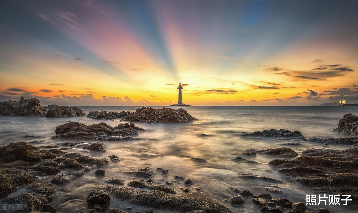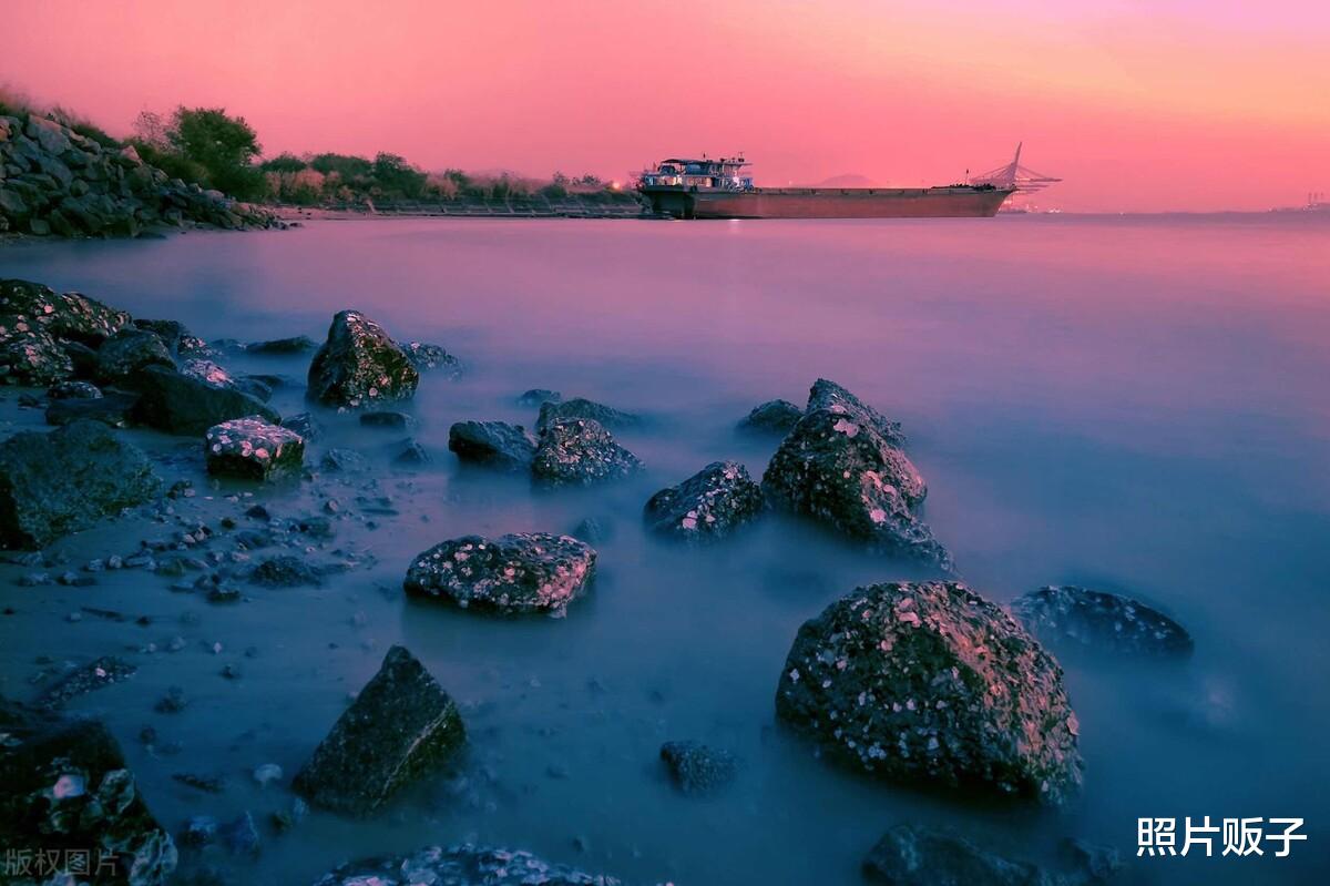 海面是广阔且平静的,如果只拍摄海面,会让照片显得单调,因此我们可以适当在画面中加入其它视觉元素,比如岩石、轮船、沙滩等,这样可以让照片更有画面感,层次更丰富。