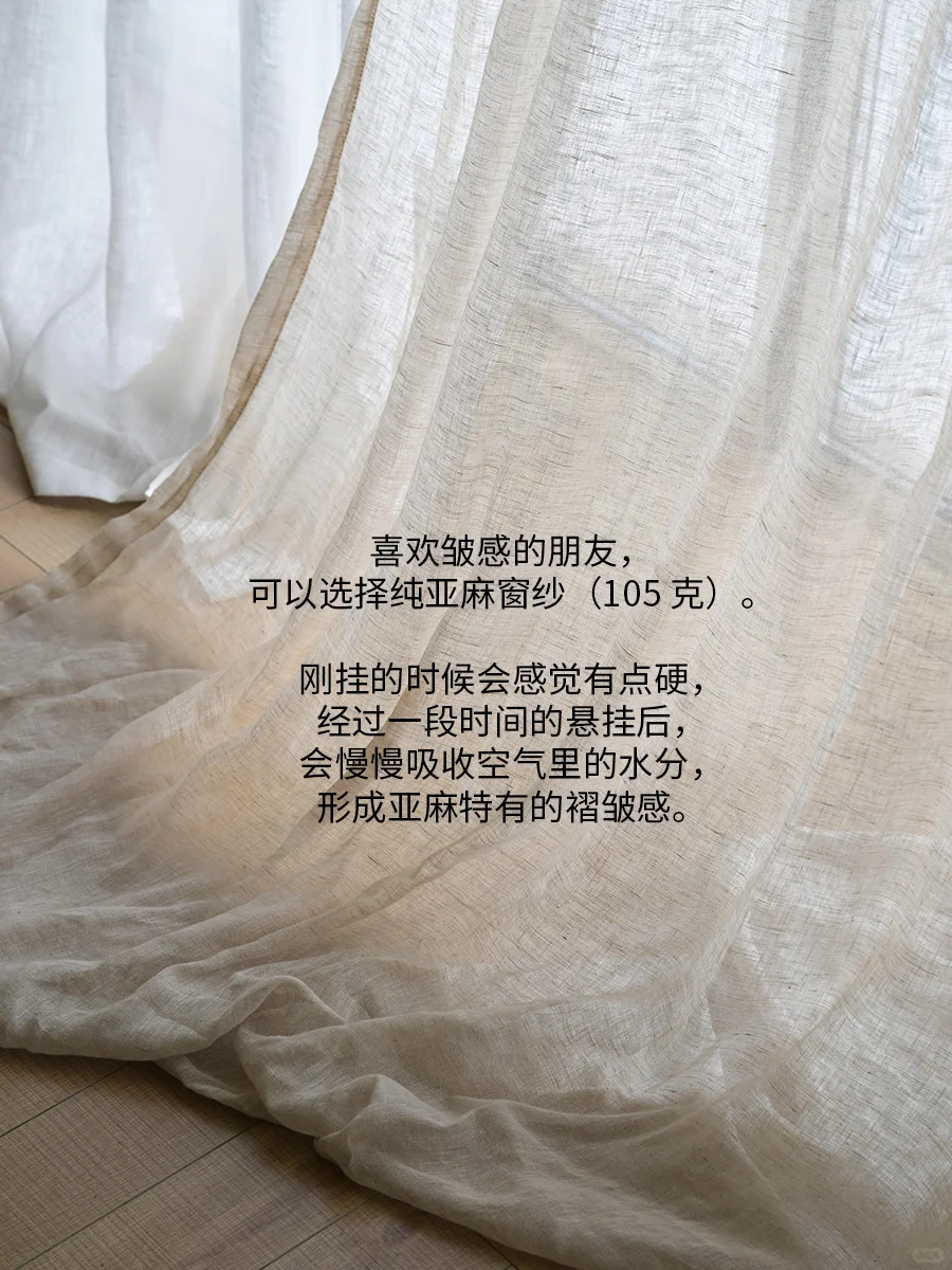 差别1️⃣:克重 云朵款(130 克)🆚普通款(105 克) 克重越高,面料越厚。 云朵款遮挡隐私的功能会好一些, 普通款更通透。 差别2️⃣:手感 云朵感的手感更柔软,挂起就比较垂顺。 普通款手感偏硬,要经过悬挂慢慢吸收空气里的水分,才能变得柔软。 差别3️⃣:掉絮 纯天然纤维都会掉絮, 克重越低,掉絮情况越明显, 比较介意这一点的朋友, 建议选择 130 克的云朵亚麻白纱。