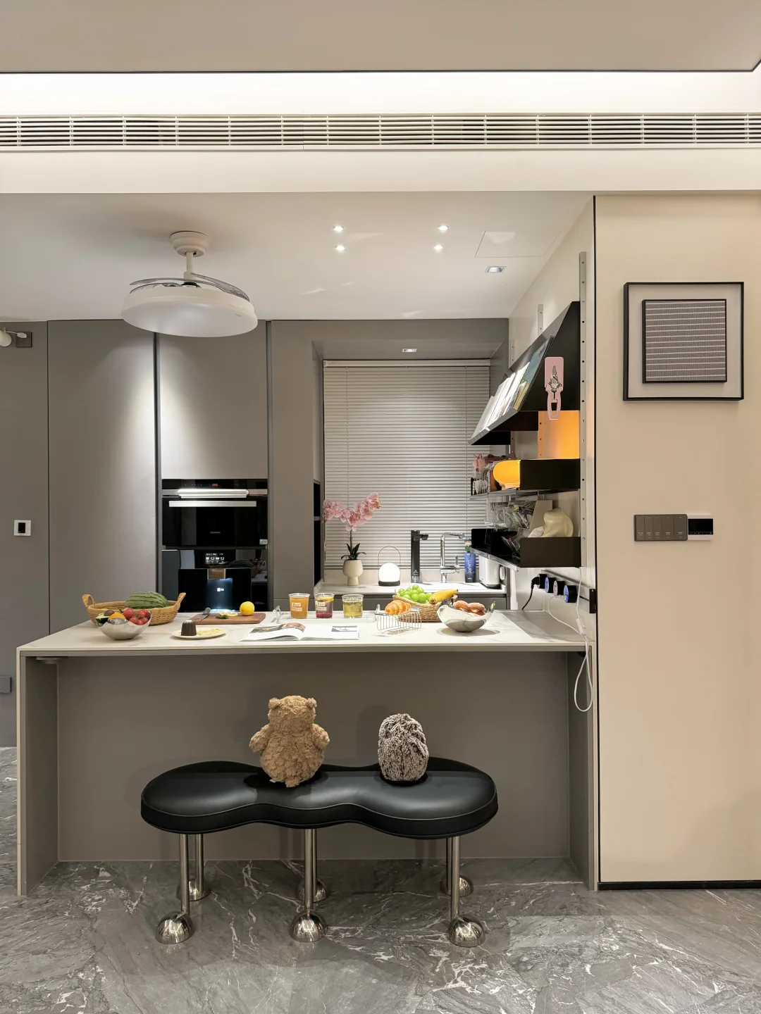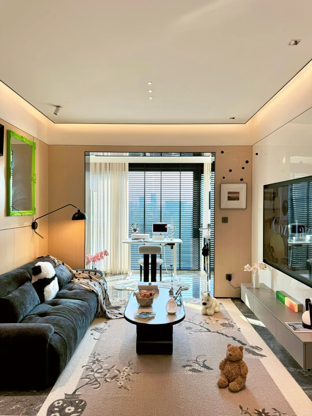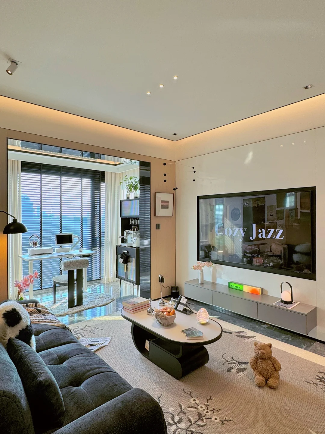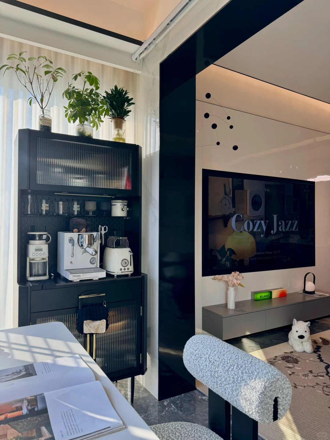 阳台封窗后改成了开放式书房和咖啡角。加上餐客一体的设计,更显大。