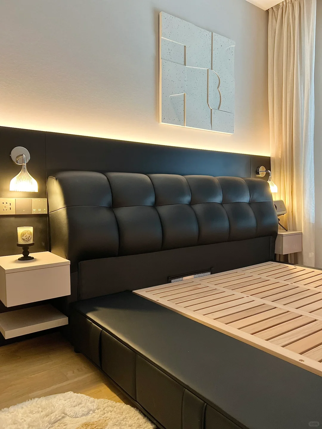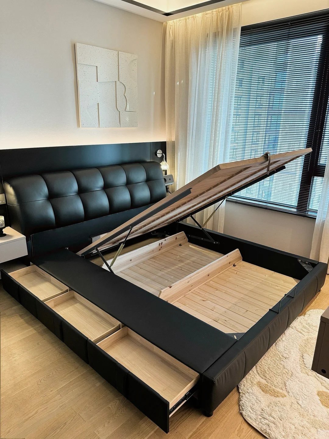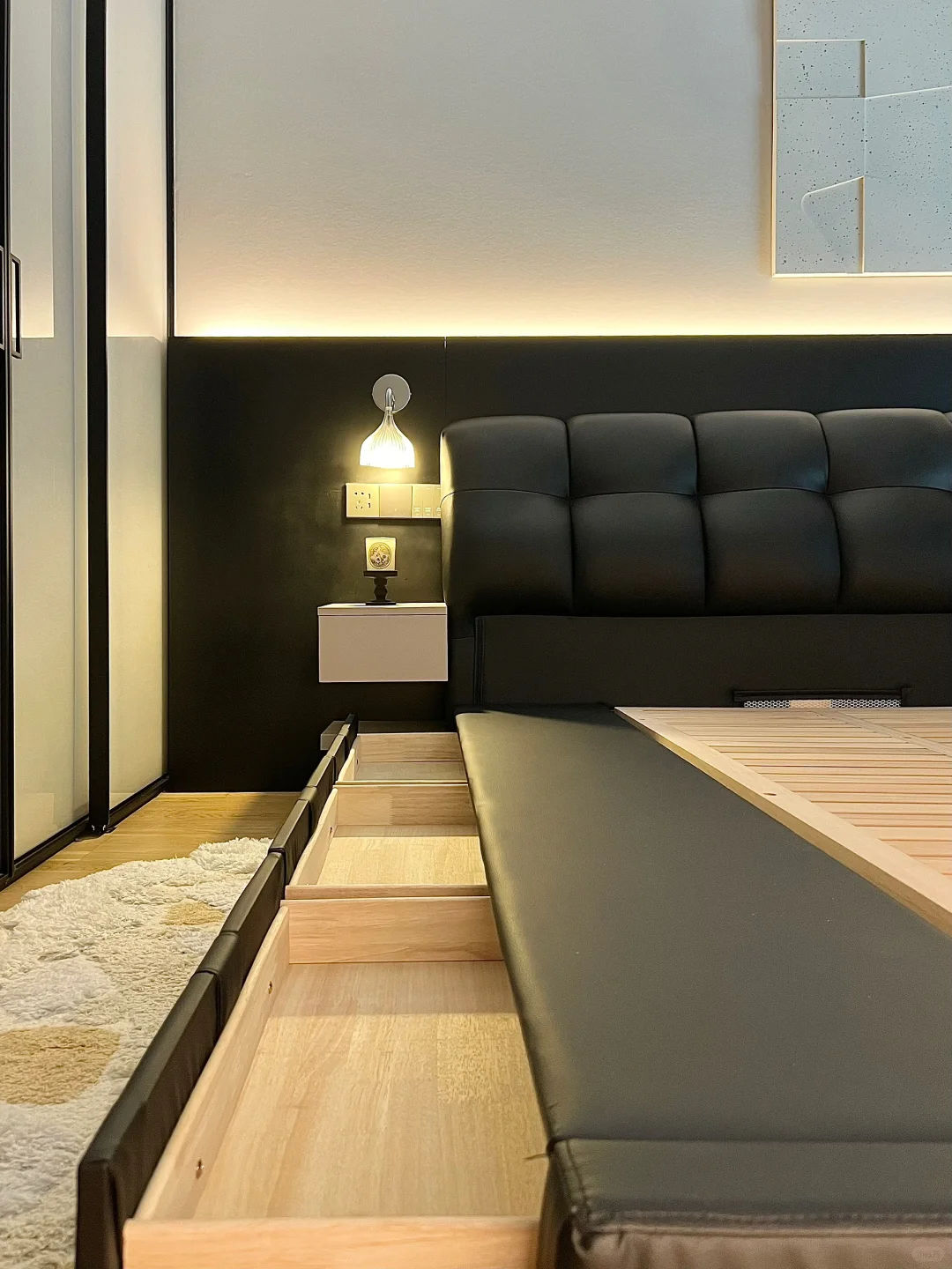 我家主卧开间 4.6 米,做了衣帽间后只有 3.1×3.26 米🤔为了增加卧室收纳空间,在小上种草了储物床,做了很多功课后选了我家现在这款黑色的真皮包储物床,网购回来很惊喜,没翻车~