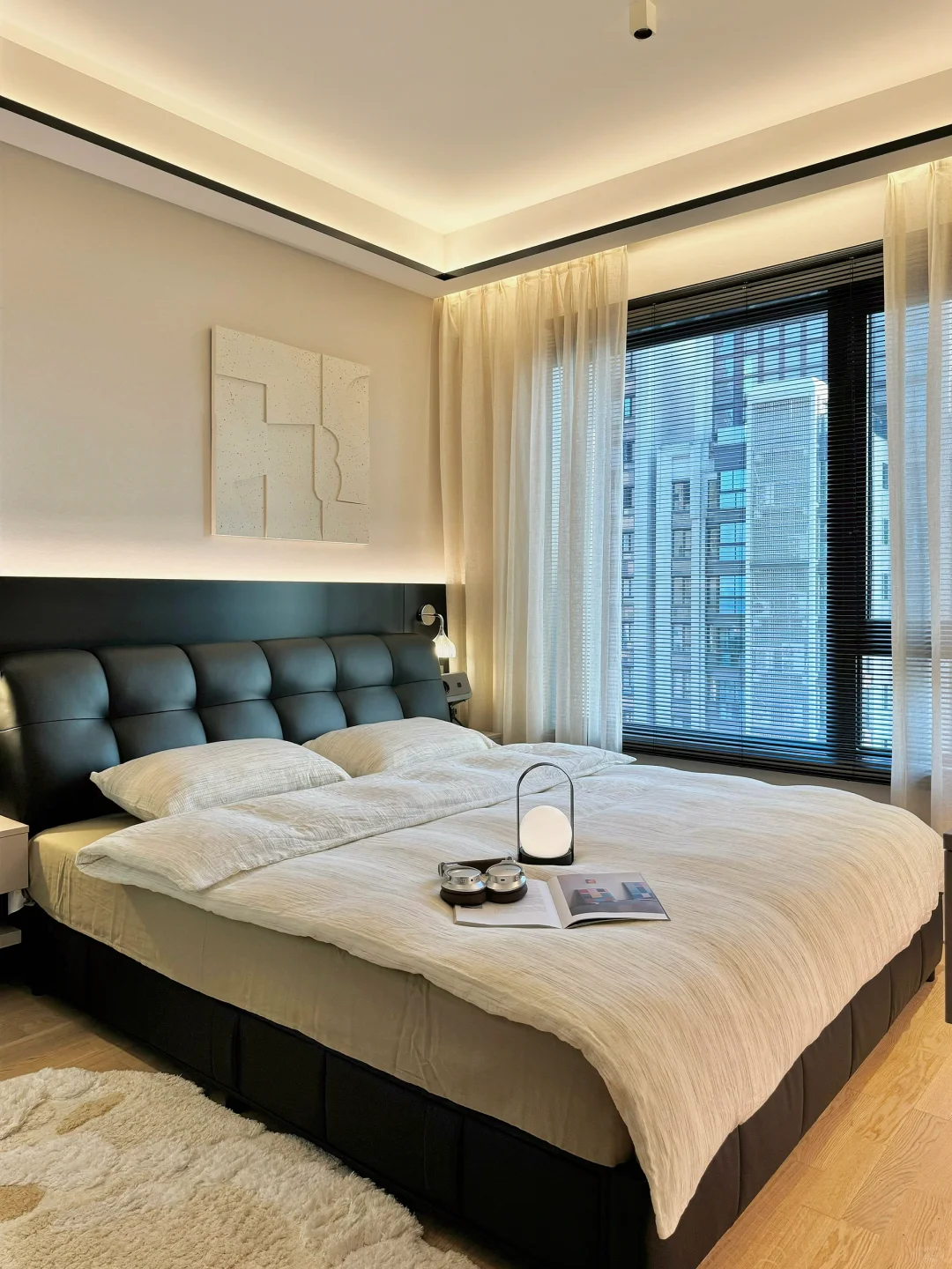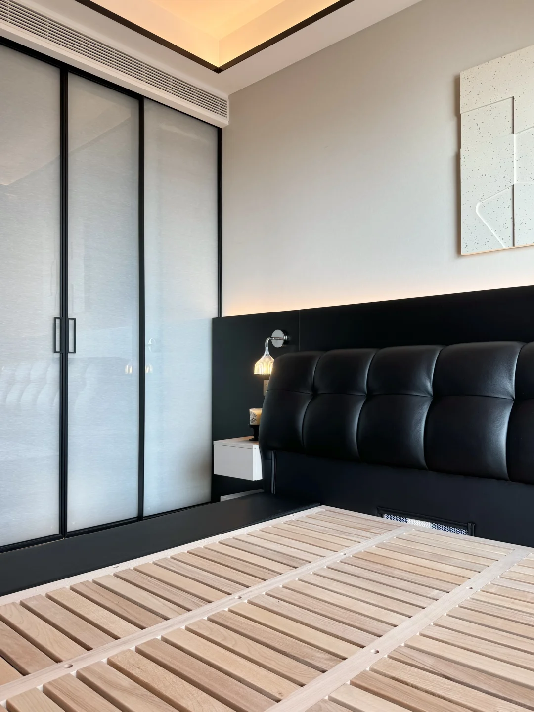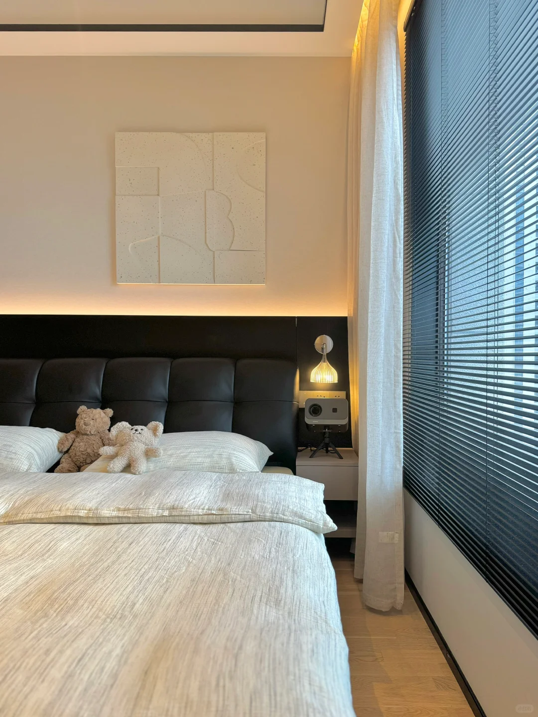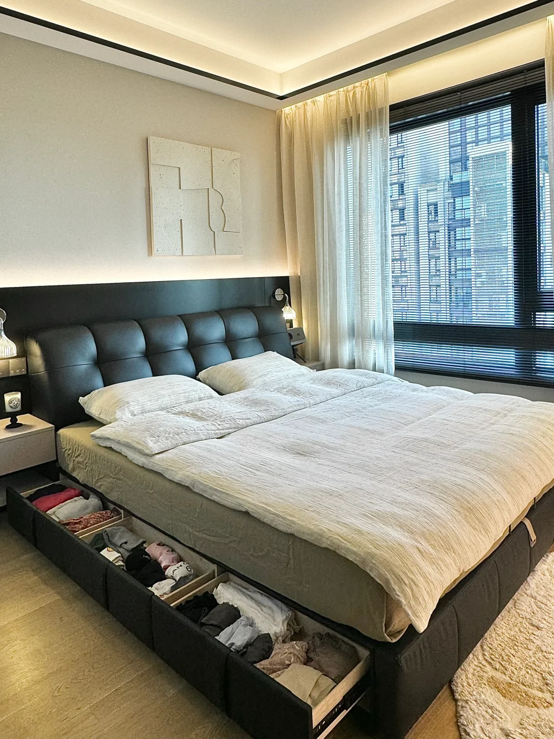 我家主卧开间 4.6 米,做了衣帽间后只有 3.1×3.26 米🤔为了增加卧室收纳空间,在小上种草了储物床,做了很多功课后选了我家现在这款黑色的真皮包储物床,网购回来很惊喜,没翻车~
