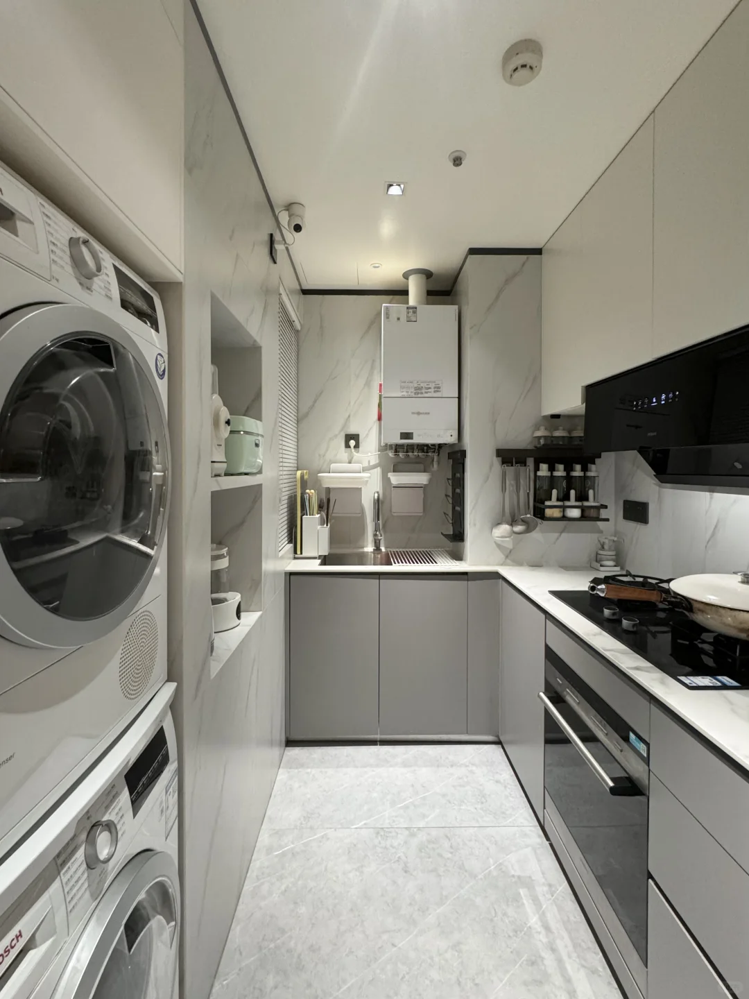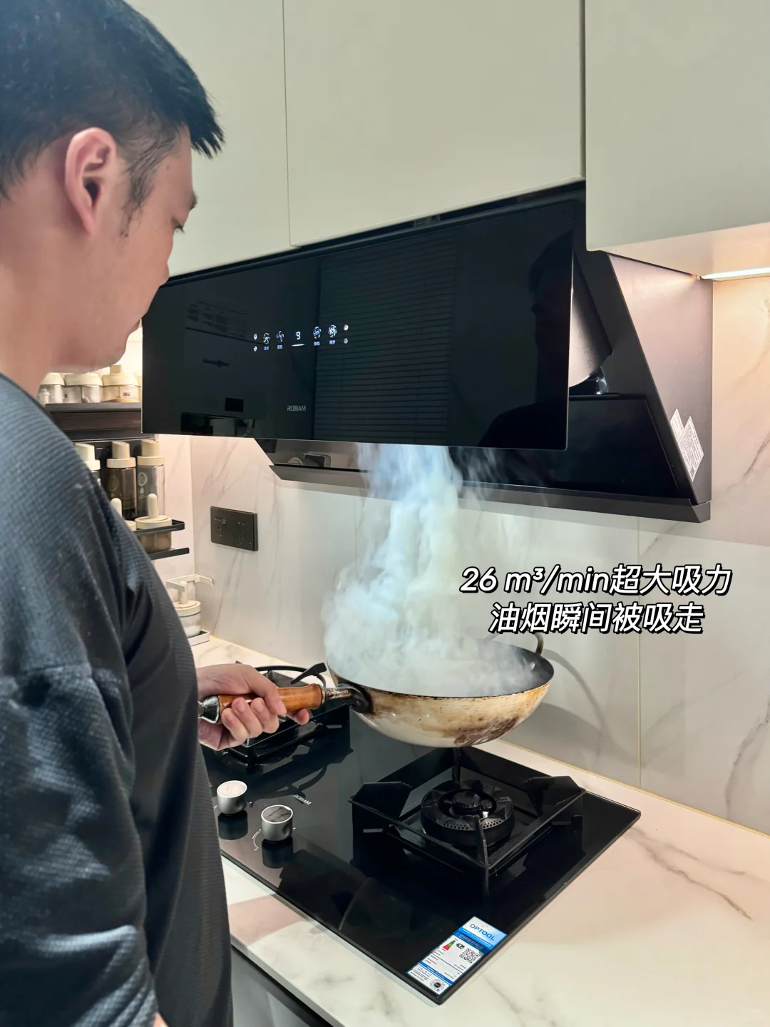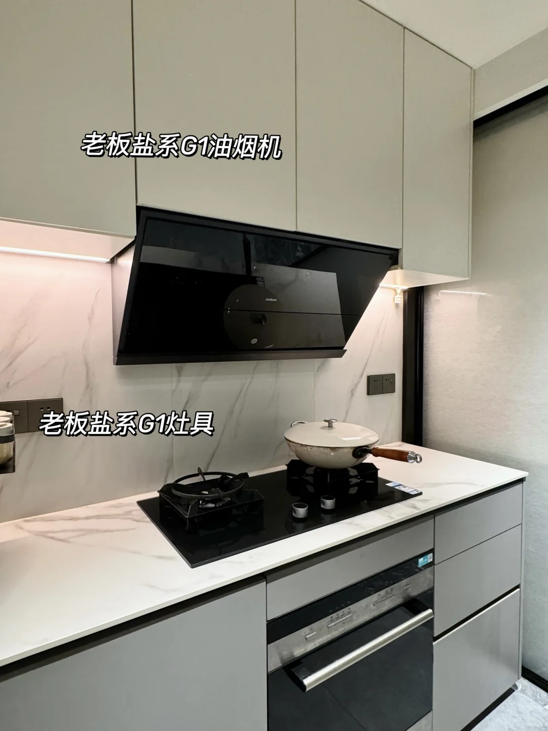 🏠厨房面积 4㎡,📏L型橱柜 ◻️混油板柜门,上白下灰 💰15 的免拉手型材槽➕💰60 瓷砖 🗄️台面高85cm,无挡水条 🧱墙上挖了壁龛当电器柜 📝我家厨房虽然小,但洗-切-炒-放布局动线合理 _ 烟灶的选择可以说是厨房好用与否的关键 我妈一听说我要换油烟机直接推荐我买老板品牌的。说她几十年换了这么多房子,油烟机用下来还是觉得老板的好用!我查了下,老板家的烟灶实力确实非常顶,烟灶销量连续 9 年领先,使用口碑也很好 最终我选择了老板电器 4️⃣5️⃣周年的献礼款—老板盐系 G1 烟灶 ✨ 选这款油烟机我主要看中它好清洁、颜值高、吸力大 ✔️ 火山盐黑色简约又高级,提升了厨房的整体质感!烟灶最让人担心的就是清洁问题,老板这款烟灶表面有抗污黑科技,表面有一层纳米抗污涂层,油污水渍沾上去会自动凝结成水珠,轻轻一擦就干净了,非常好清洁 ✔️我妈一直对老板家烟机性能赞不绝口,我也领略到了,26m³/min 的超大吸力搭配 1100Pa 大静压,油烟瞬间就能被吸走,即使低楼层高峰期爆炒也不用担心油烟倒灌。侧面有 45 度黄金拢烟夹角,三面拢烟,油烟根本逃不出去 ✔️它有灵犀 AI 科技,通过温度感应开关机,灶具一开火,烟机就会自动开启,真的很智能,不挑灶具类型比起蓝牙连接更是 next level 了 ✔️搭配的灶具有 5.2kW 的三维烈焰猛火,爆炒更香更有锅气,2 - 3 分钟一道爆炒菜就完成了;炉头还是可拆卸的,日常清洁很方便 值得一提的是老板的服务真的好,师傅安装还帮我把之前挂油烟机墙上的洞🕳️给补了 听妈妈的话果然没错,这次终于选到满意的油烟机了 有个好看又好用的厨房,幸福感大大提高~