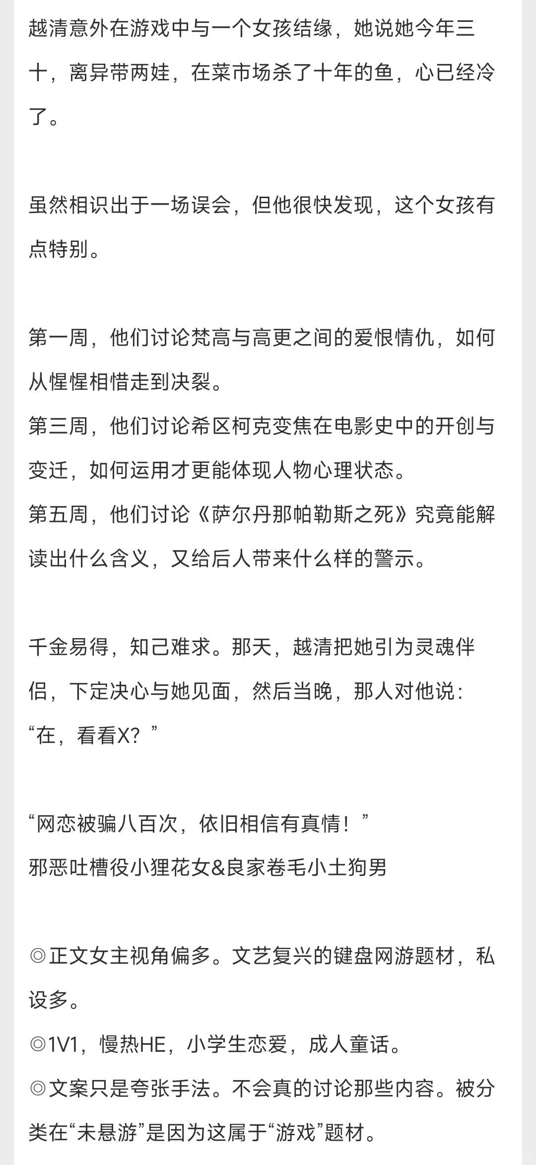《网恋被骗八百次》熊也 虽然一个字没说剑三!但我不管!游戏原型一定是剑三! 女主因为家庭原因是个很内耗社恐的女生,但游戏里的她是超强的技术流大佬!全服膜拜的第一刺客玩家!男主四舍五入是女主的甲方老板吧,三次元抬头不见低头见,二次元被女主"骗心又骗身",是超级温柔的可爱卷毛小狗~游戏里是氪金菜鸡,但因为原号主很厉害,一直狐假虎威哈哈哈哈!后来游戏全网公认男主是女主的随身挂件,一上线就和女主捆绑做日常嘿嘿~ 总之超喜欢!!!