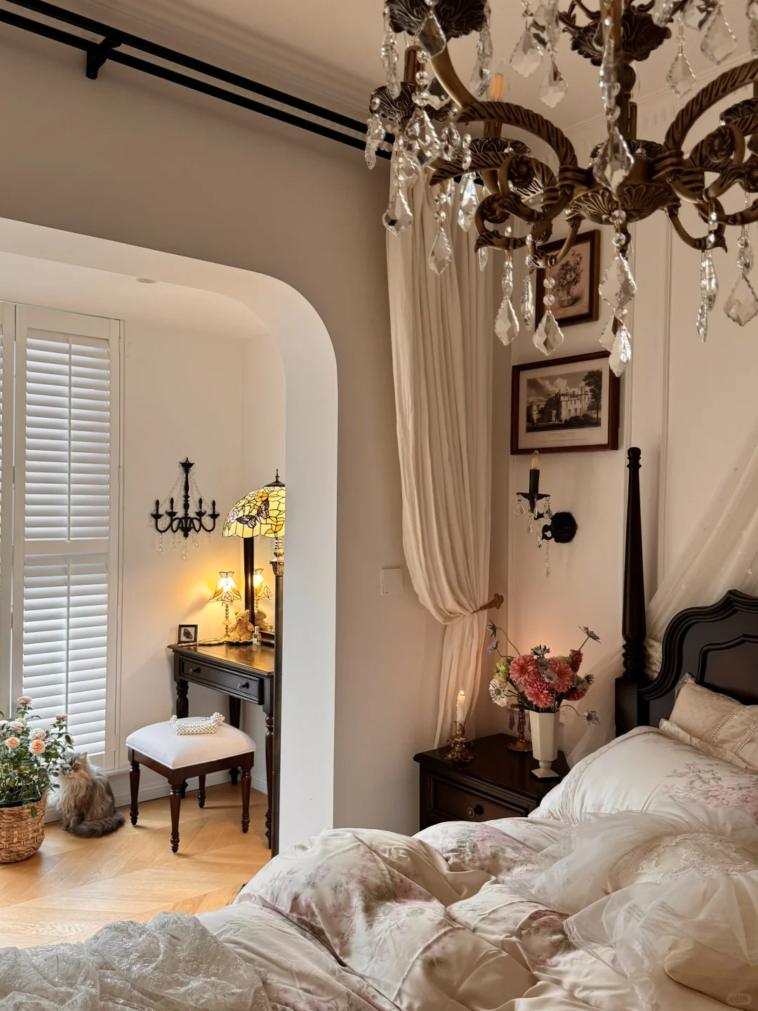 我家卧室打通阳台后差不多20平 白色硬装和深色软装 让卧室充满浓郁复古的电影氛围 浪漫的布置,松软的床 是理想中的公主卧室的样子 卧室尺寸参考 ▫️卧室:4.5*3.3m,阳台:1.8*3.3m ▫️线条:角线11cm,墙面2.5cm,灯盘53cm ▫️卧室柜:2.42*1.9m,阳台柜:2.42*1.37m
