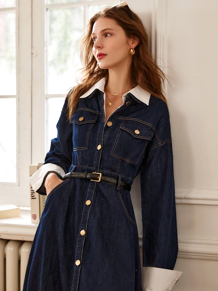 假两件撞色衬衫领设计,JI具层次感,修饰脖颈线条;门襟处复古金属扣设计,穿脱方便,视觉收拢身形;胸前对称袋盖设计,金属扣点缀,丰富裙身层次感;宽松落肩袖设计,彰显慵懒随性,轻松修饰肉肉手臂;假两件衬衫袖口设计,时尚复古,JI具优雅腔调感;腰部车耳仔,配送定制U选皮革腰带,提升层次价值感;裙身对称斜插袋设计,实用方便,可随时凹造型;裙摆卷边撞色压线设计,走线细密紧实,做工精细