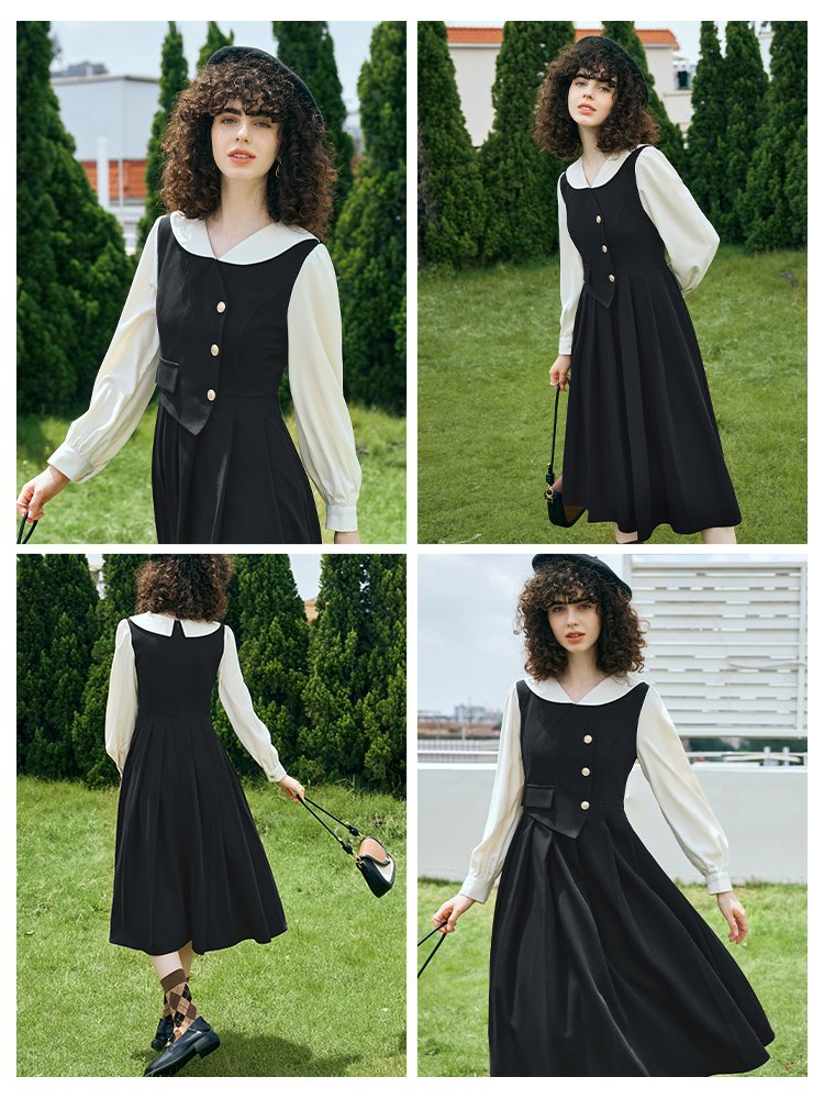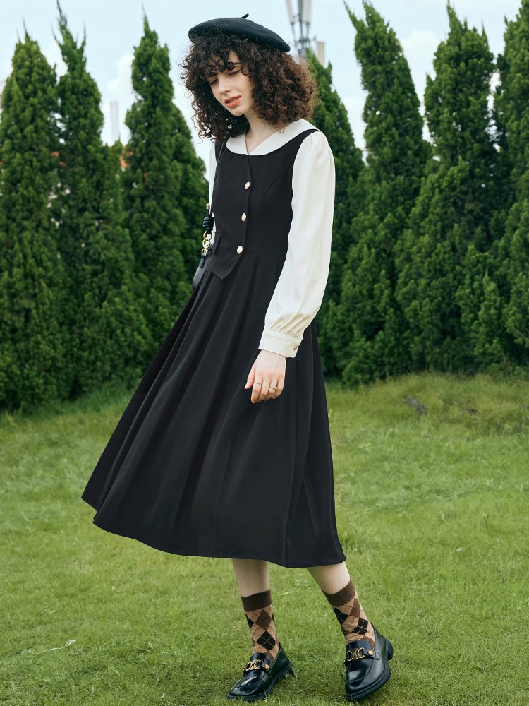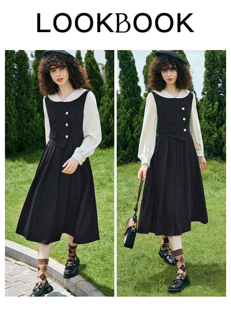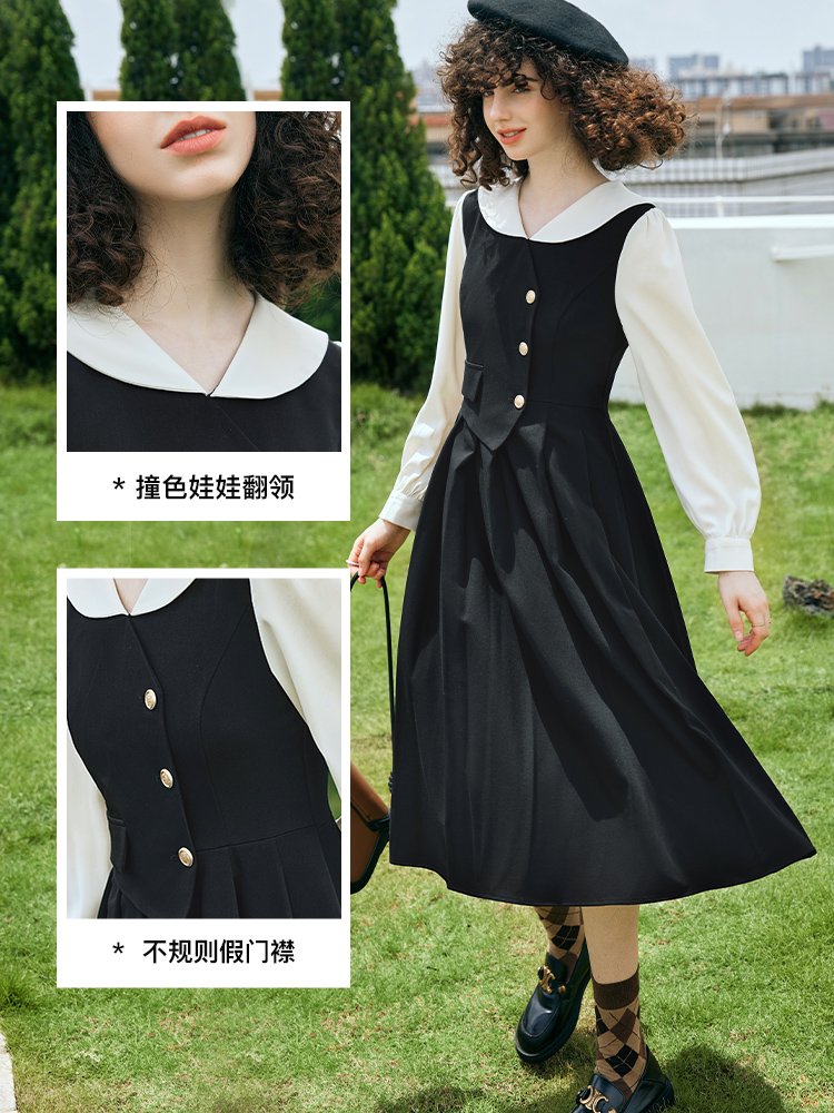 貴族学院感!法式翻领假两件收腰百褶连衣裙