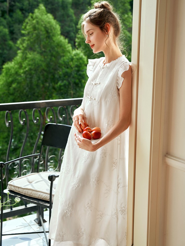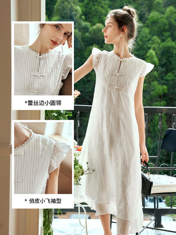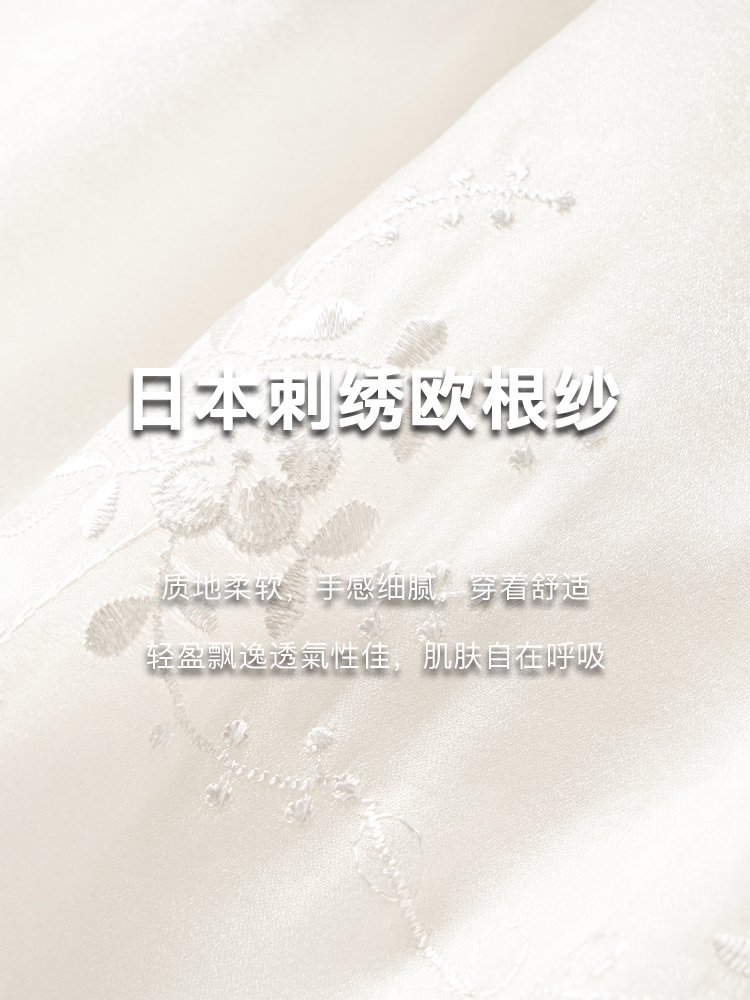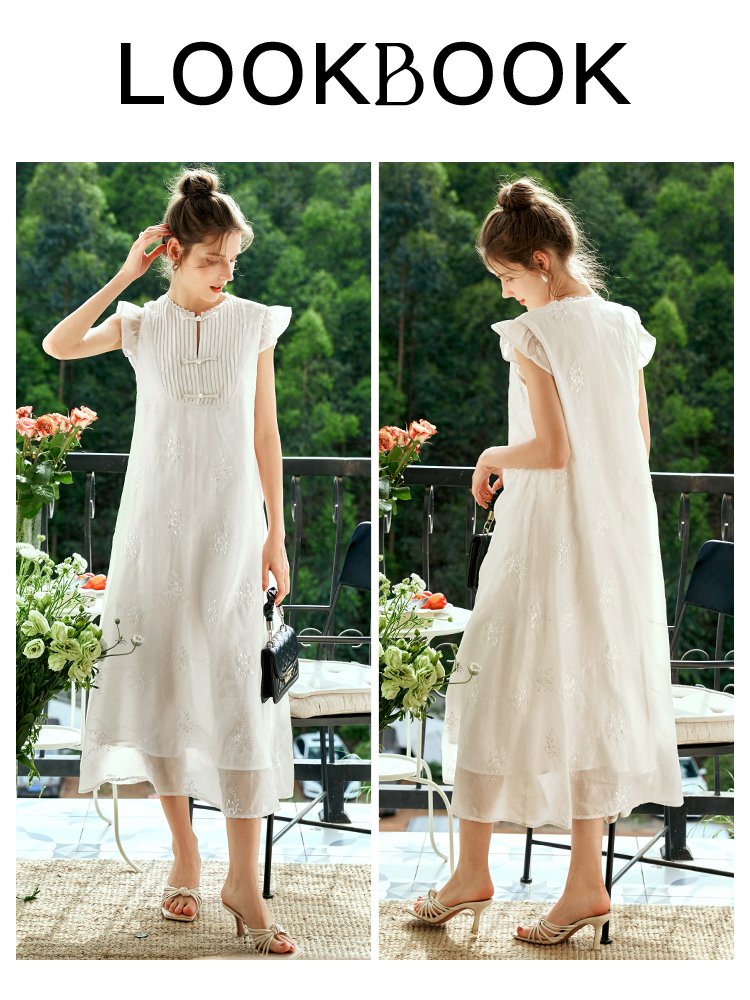 重工刺绣欧根纱,轻盈飘逸,翩然而起;半门襟处点缀新中式盘扣,演绎国风气息;精緻通透小飞袖,减龄俏皮不浮夸;减龄娃娃裙版型,线条垂顺流畅,宽松不挑人