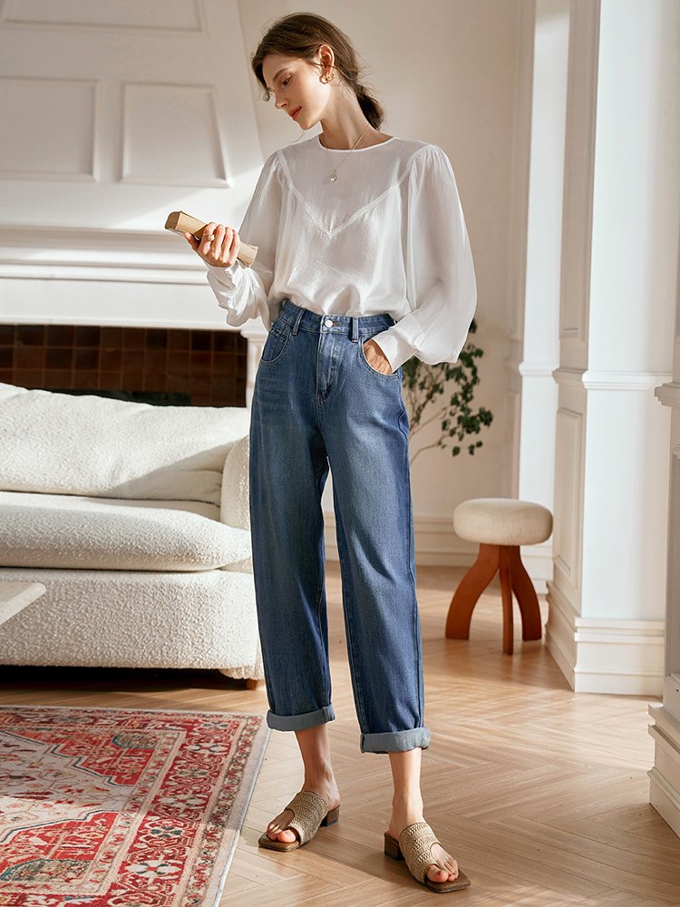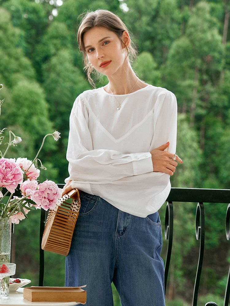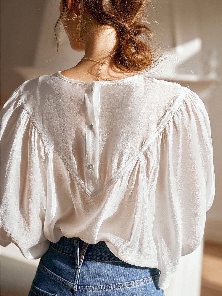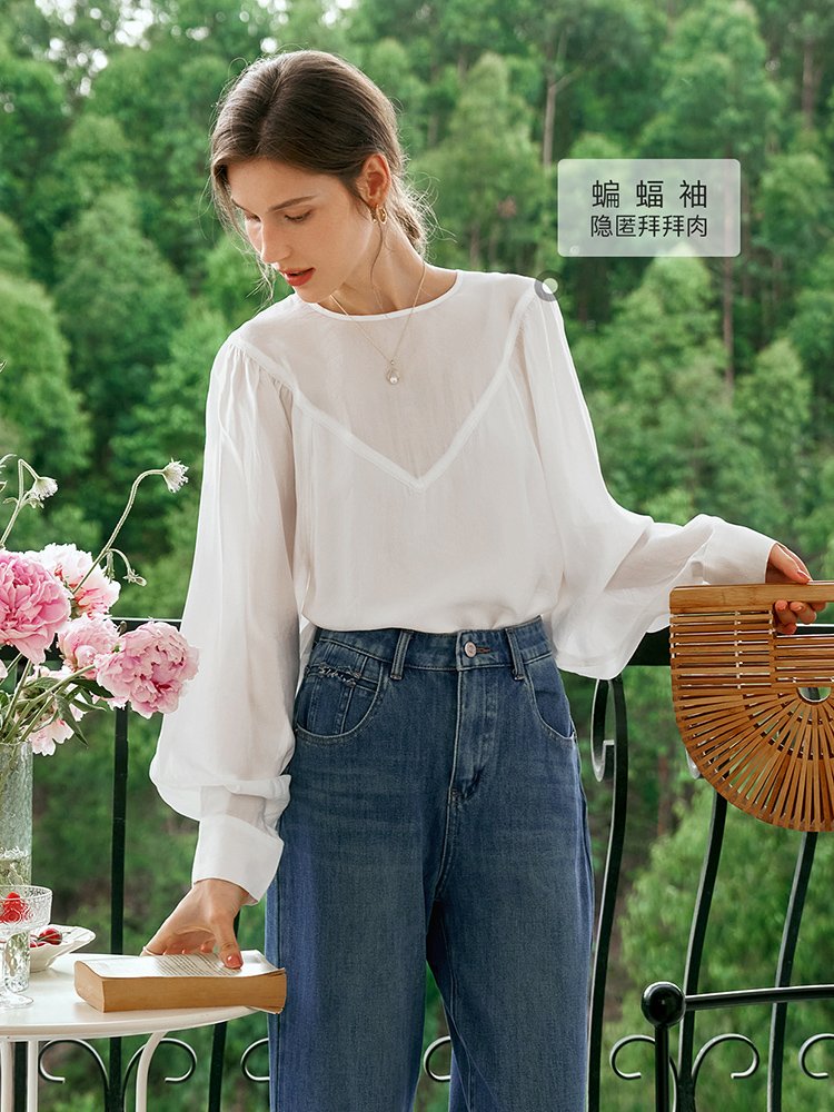 珠光人丝时装料,触感如真丝般亲柔透氣;表面自带细腻珠光感,具有奢華美感;圆领设计简约大气,修饰莞美颈线;创意V型拼接身型,丰富层次视觉显瘦;后中三粒包扣,便于套头穿脱,精至实用;插肩蝙蝠袖,宽松慵懒,藏起手臂肉肉