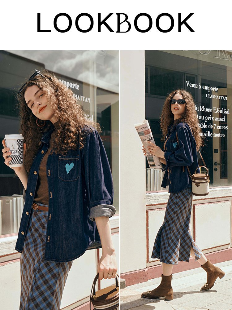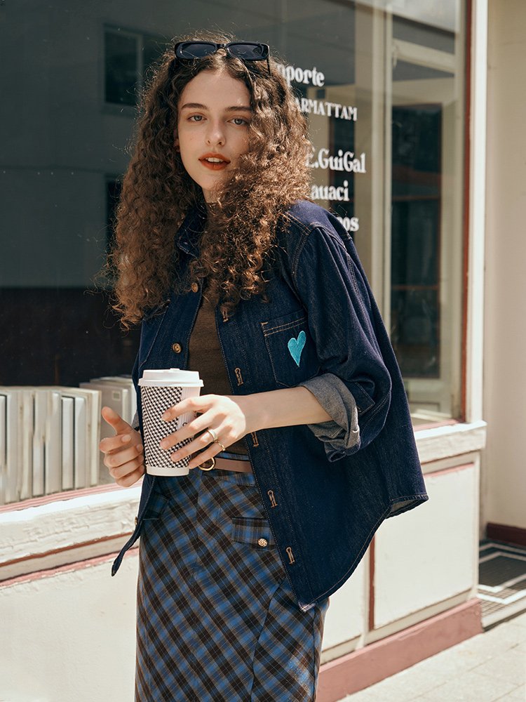 箐选防掉色洗水牛仔料,囿效减少牛仔掉色问题;面感平滑舒适,高密不易起球起毛,無异味好打理;经典衬衫翻领不挑人,微宽肩设计减龄有型;前中古铜色浮雕爱心金属扣,复古凸显价值感;胸前不对称口袋,单边口袋爱心刺绣,吸睛亮眼;可当外套可单穿,一衣多穿性价比高,时髦好搭配