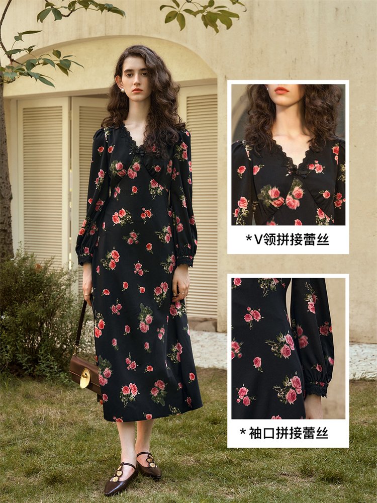 浪漫优雅绽放!玫瑰法式印花连衣裙